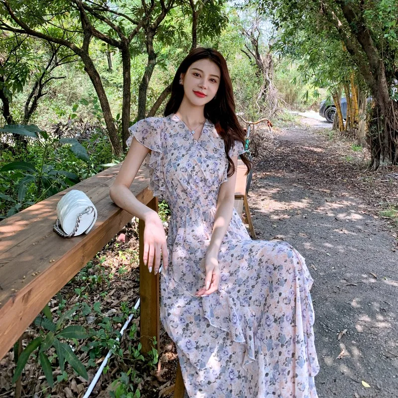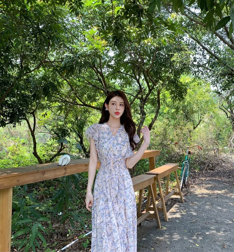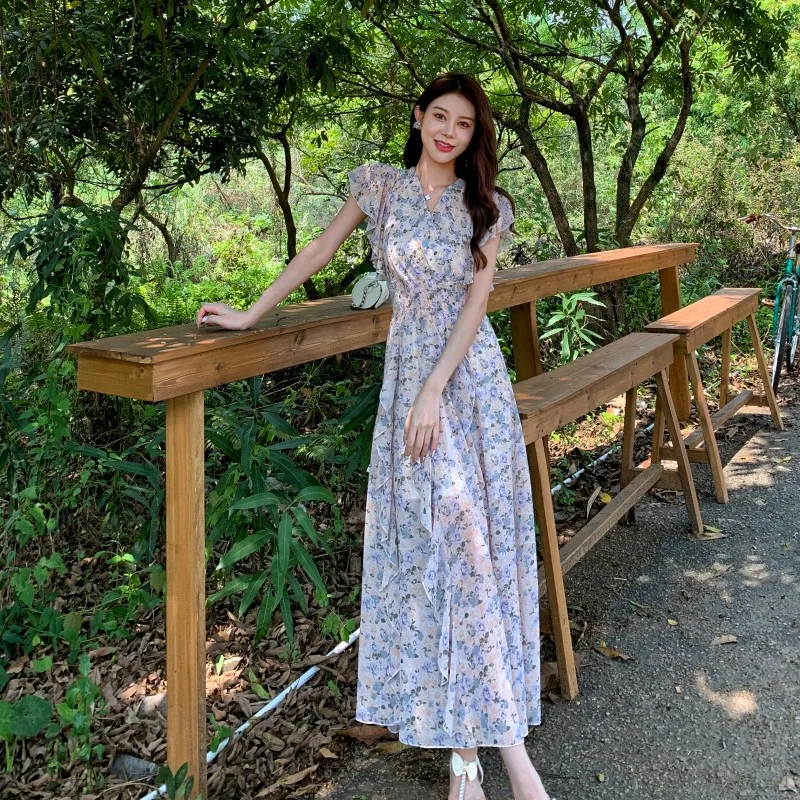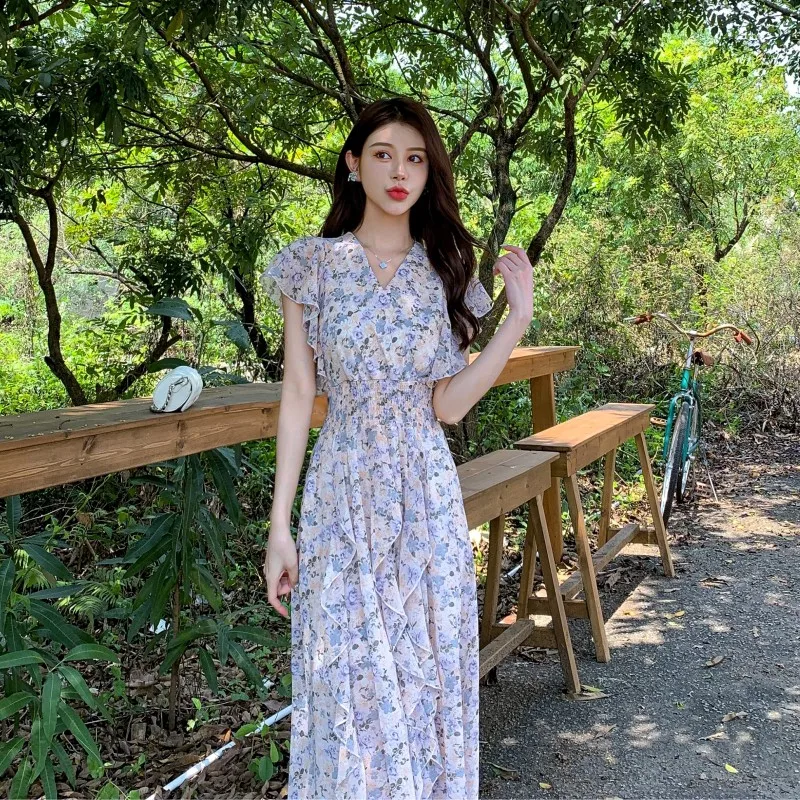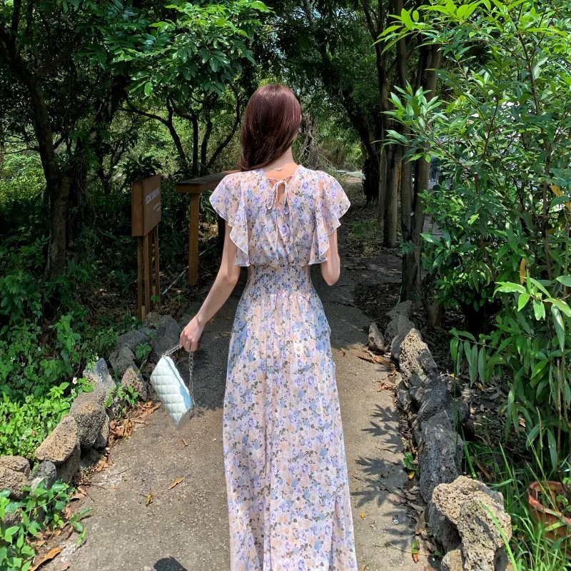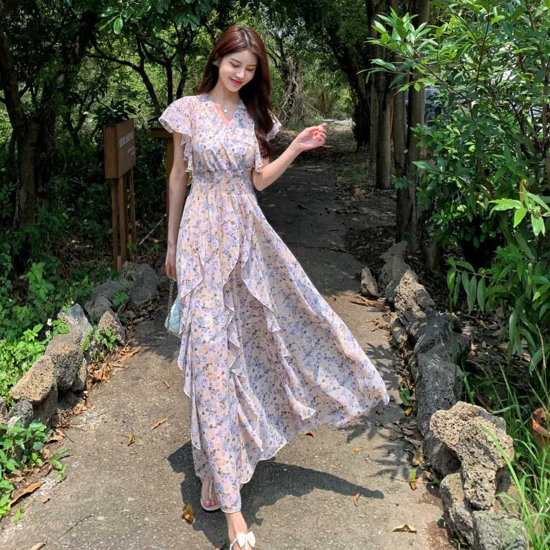 MQTIME  - Summer French Style Sweet Tight Waist Chiffon Long Dress Holiday Style First Love Fairy Ruffled Printed Dress