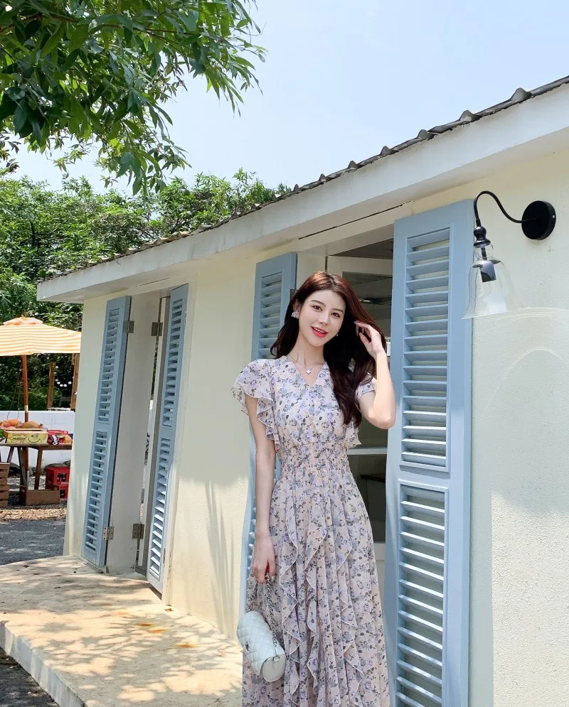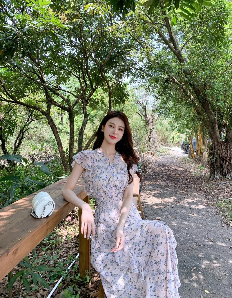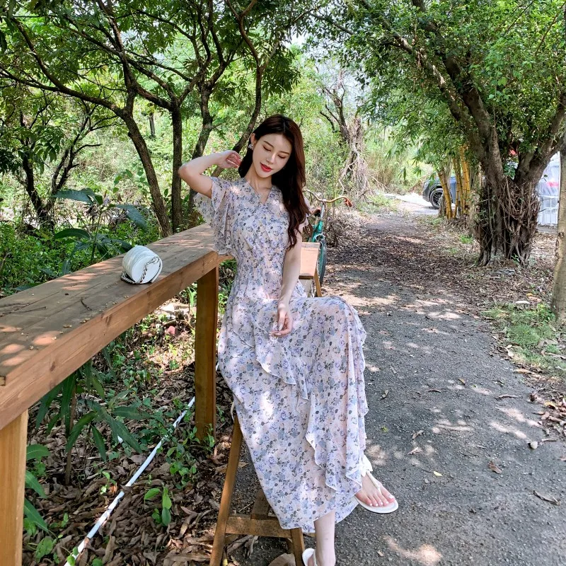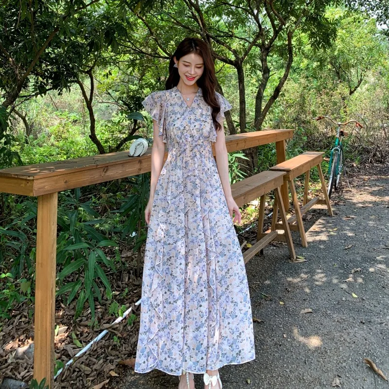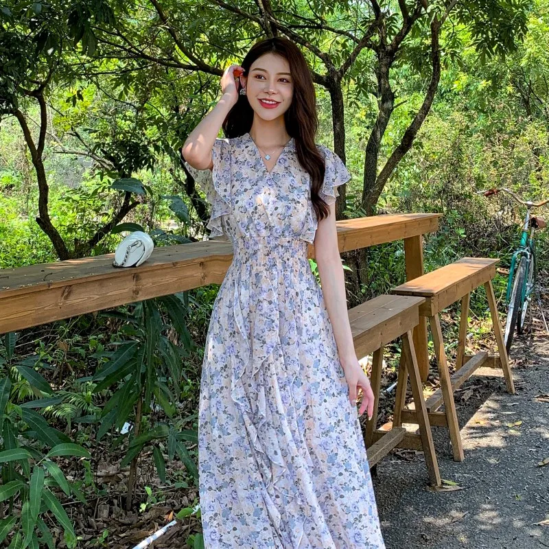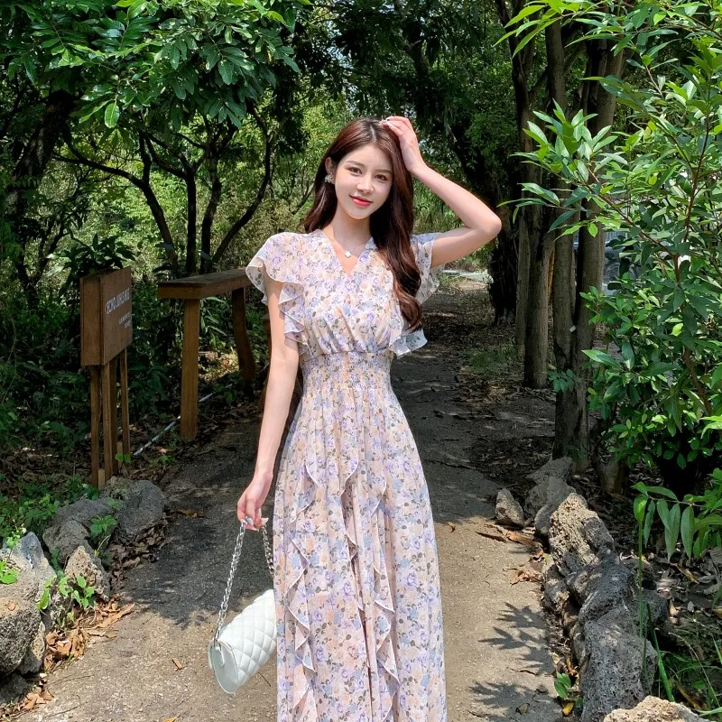 MQTIME  - Summer French Style Sweet Tight Waist Chiffon Long Dress Holiday Style First Love Fairy Ruffled Printed Dress