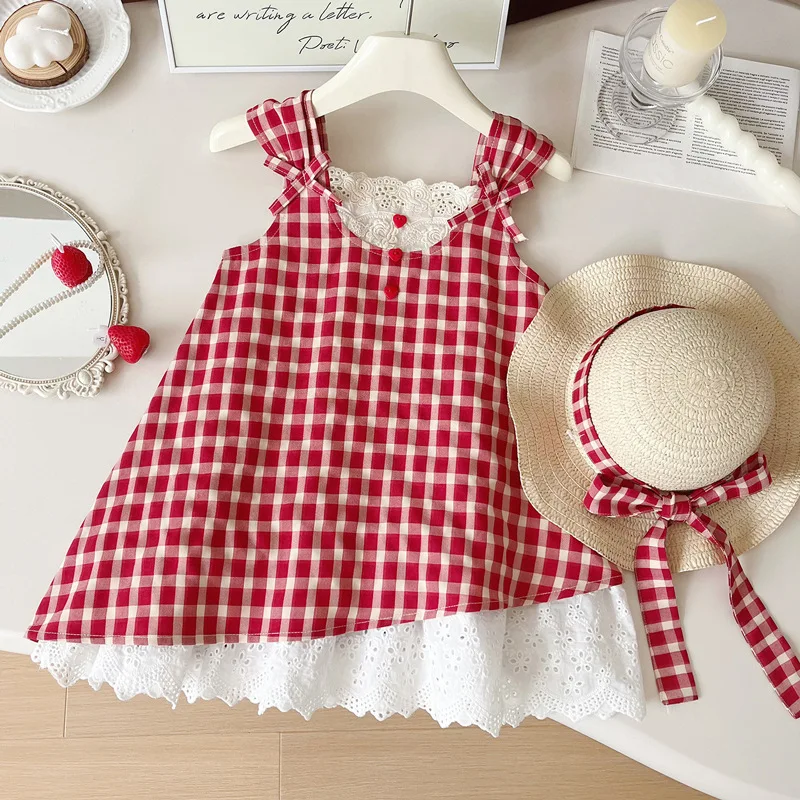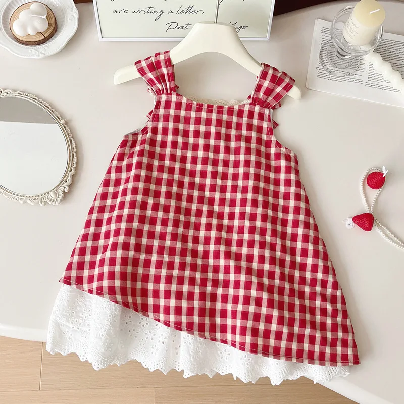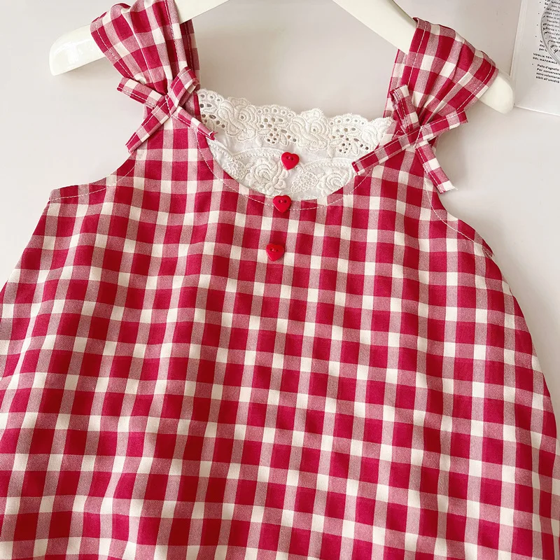 MQTIME - Summer Infant Baby Girl Sling Dress 2-8Y Kid Girl Cotton Lace Patch Plaid Princess Dress Bow Sleeveless Dress Free Sam Style Bag