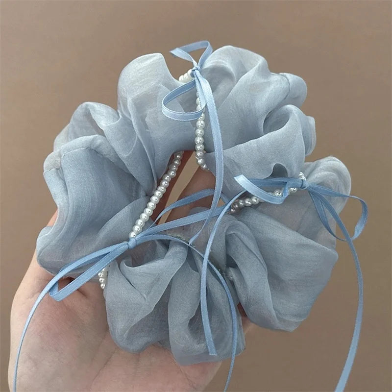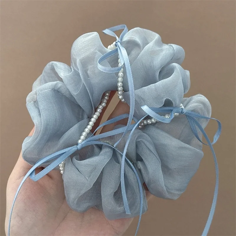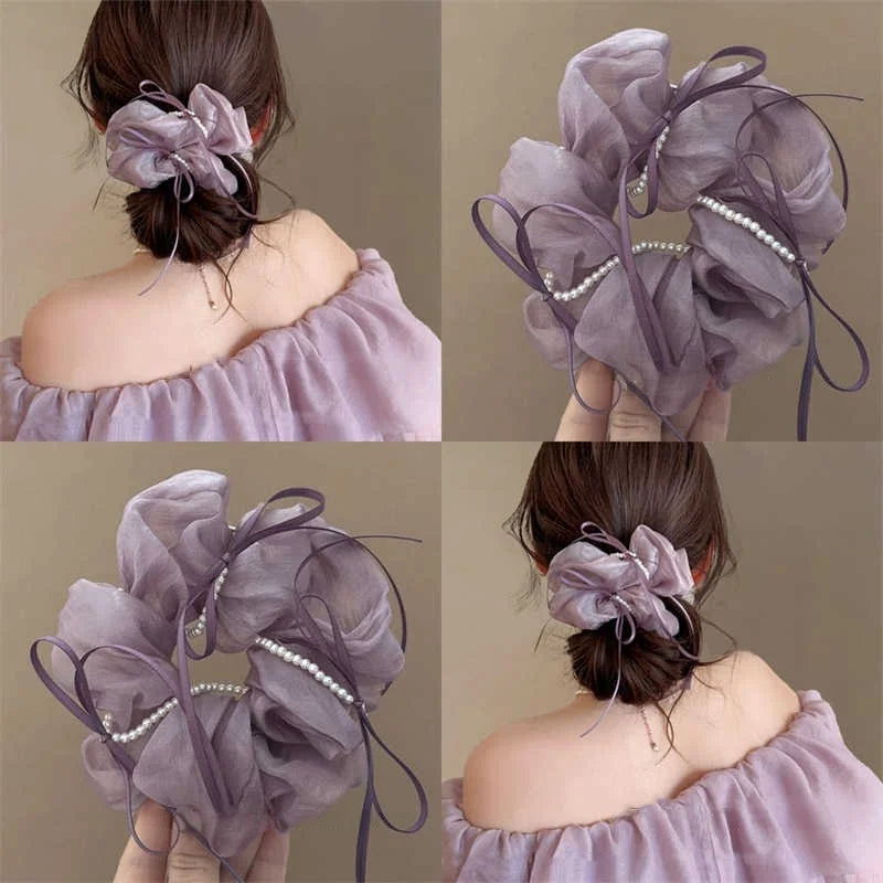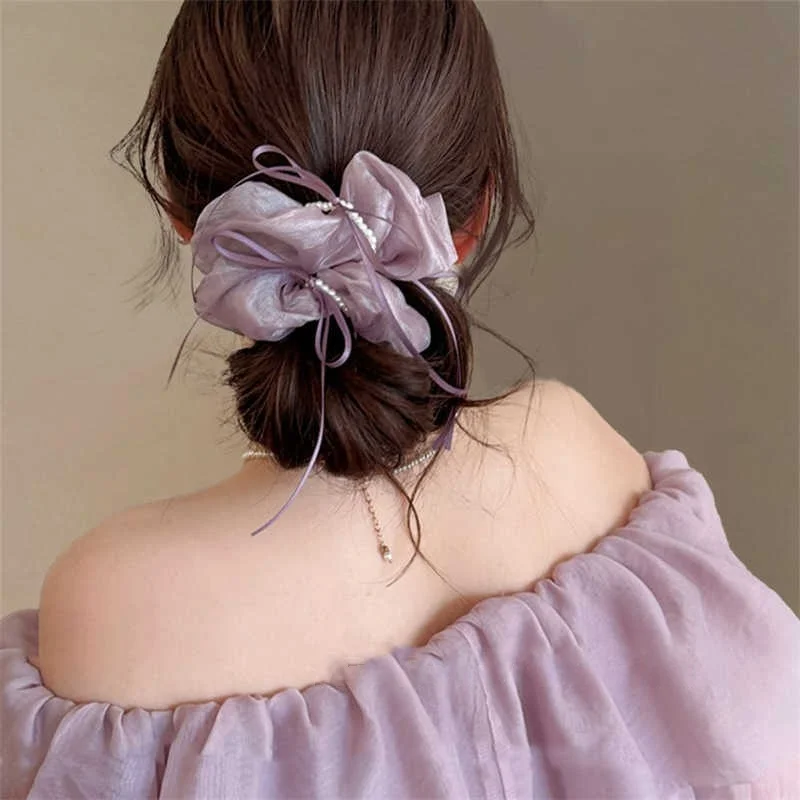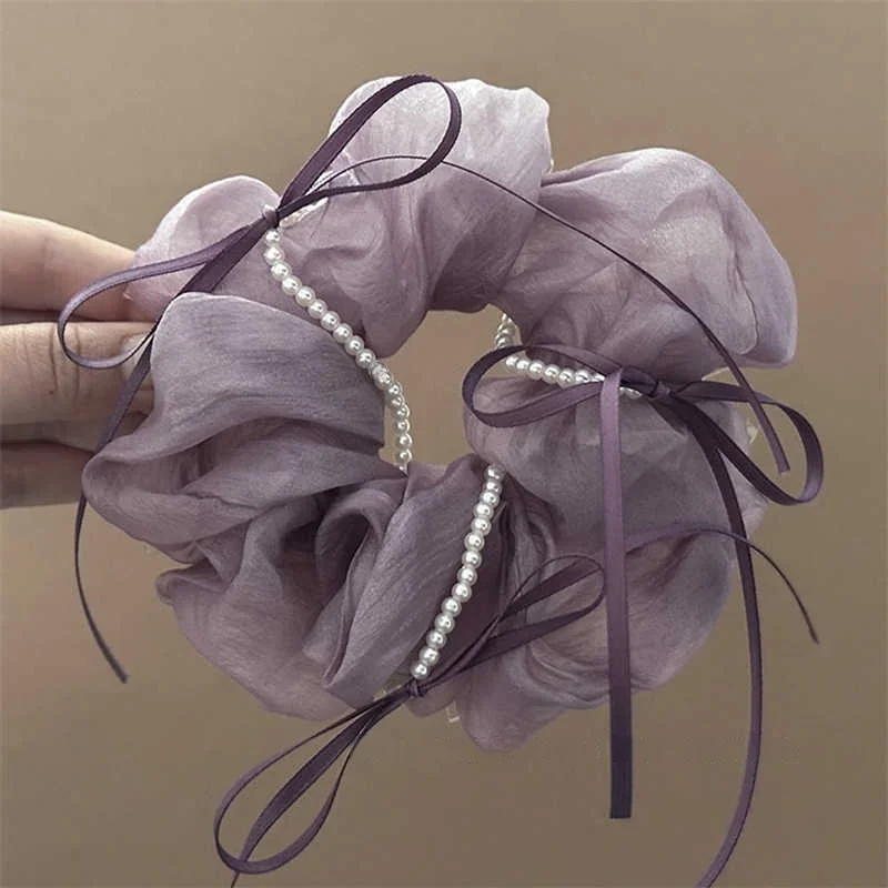 MQTIME  -  Summer Large Purple Silk Yarn  Large Intestine Ring  Bow Ribbon Hair Band  Mesh Pearl Hair Rope  Hair Accessories for Women