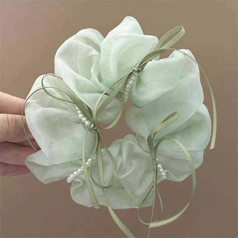 MQTIME - Summer Large Purple Silk Yarn Large Intestine Ring Bow Ribbon Hair Band Mesh Pearl Hair Rope Hair Accessories for Women