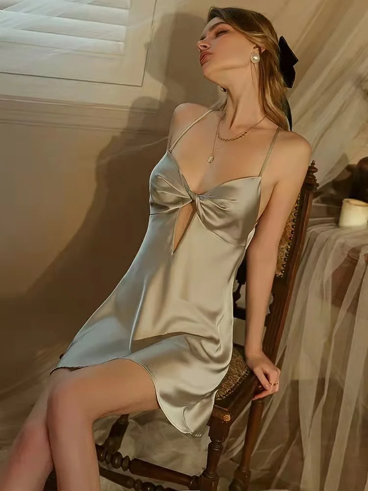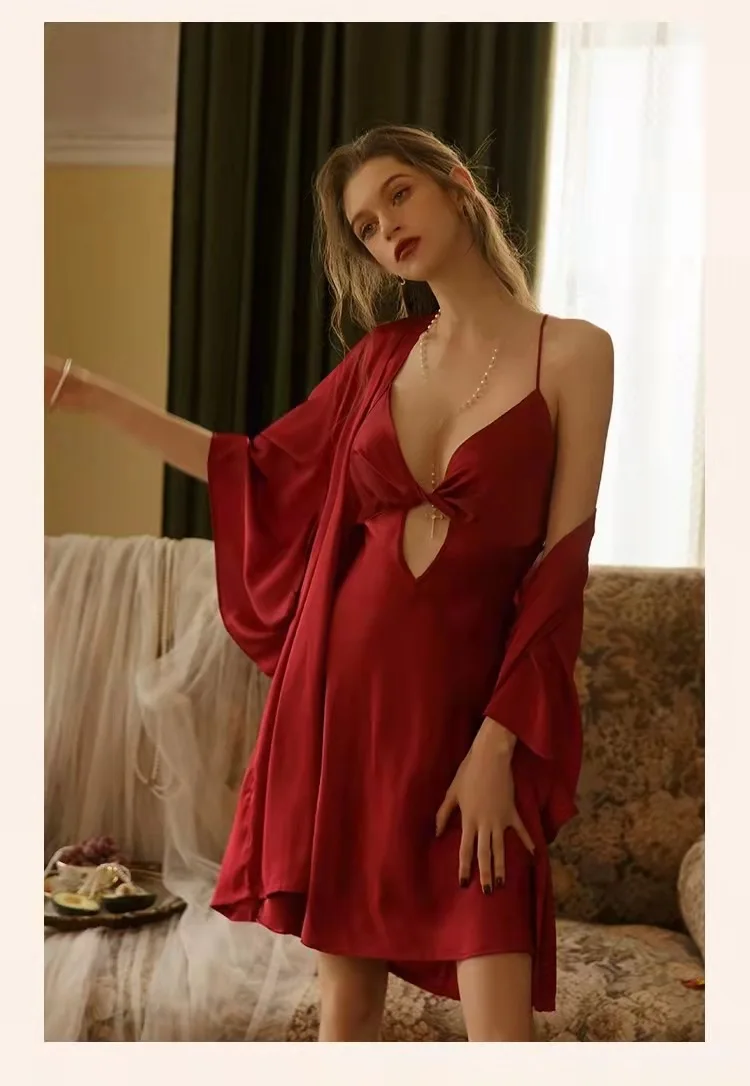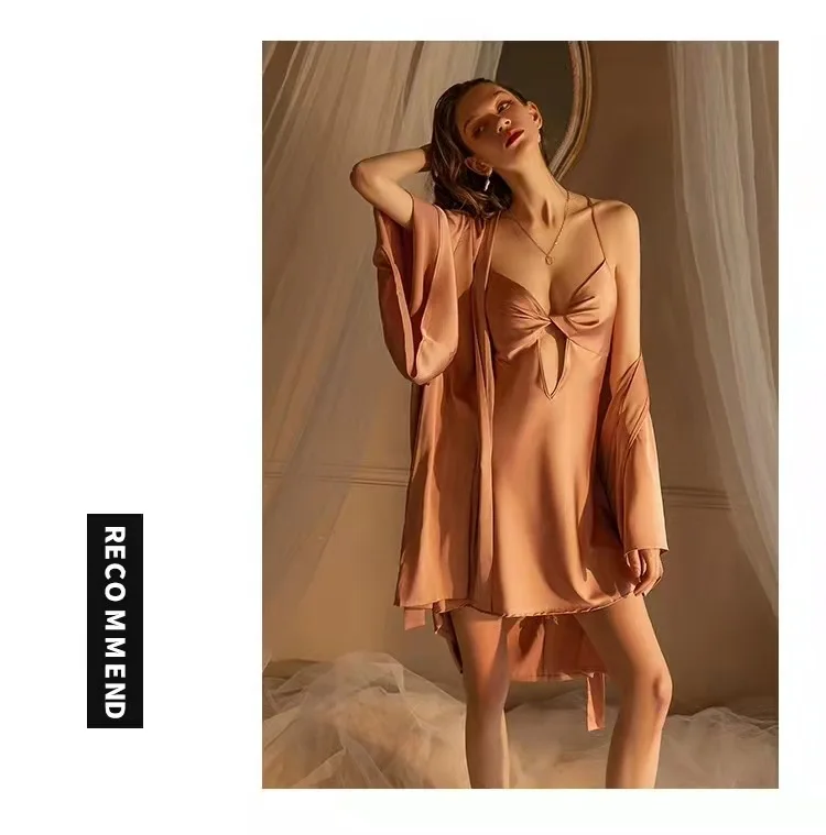 MQTIME - Summer Women White Satin Robe & Gown Sets Sexy Sleep Lounge Nightwear With Chest Pads Bathrobe+Sling Nightdress
