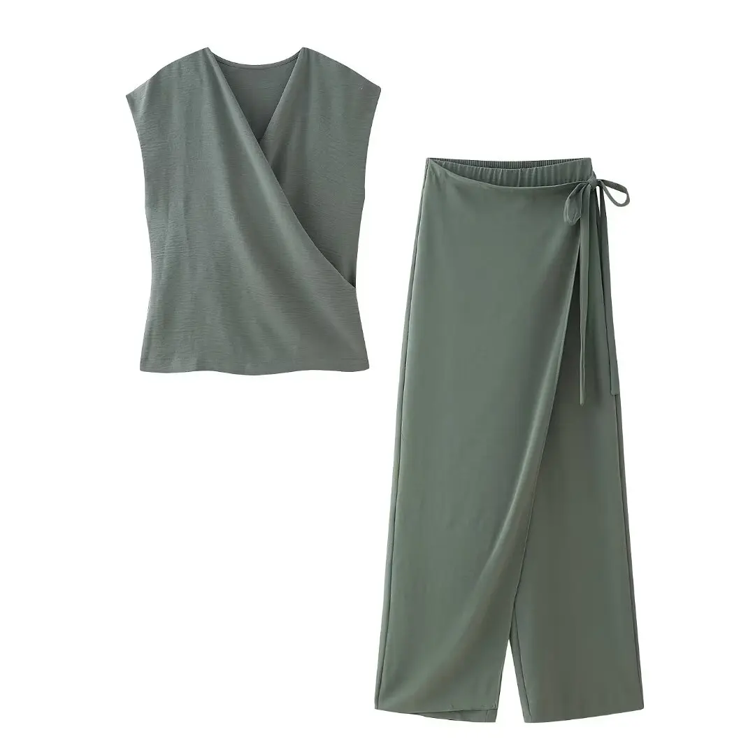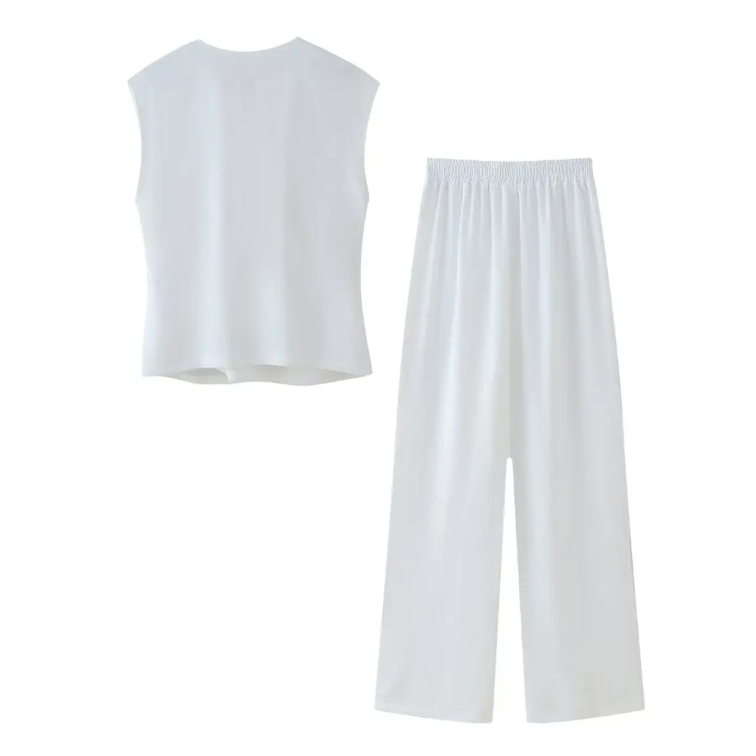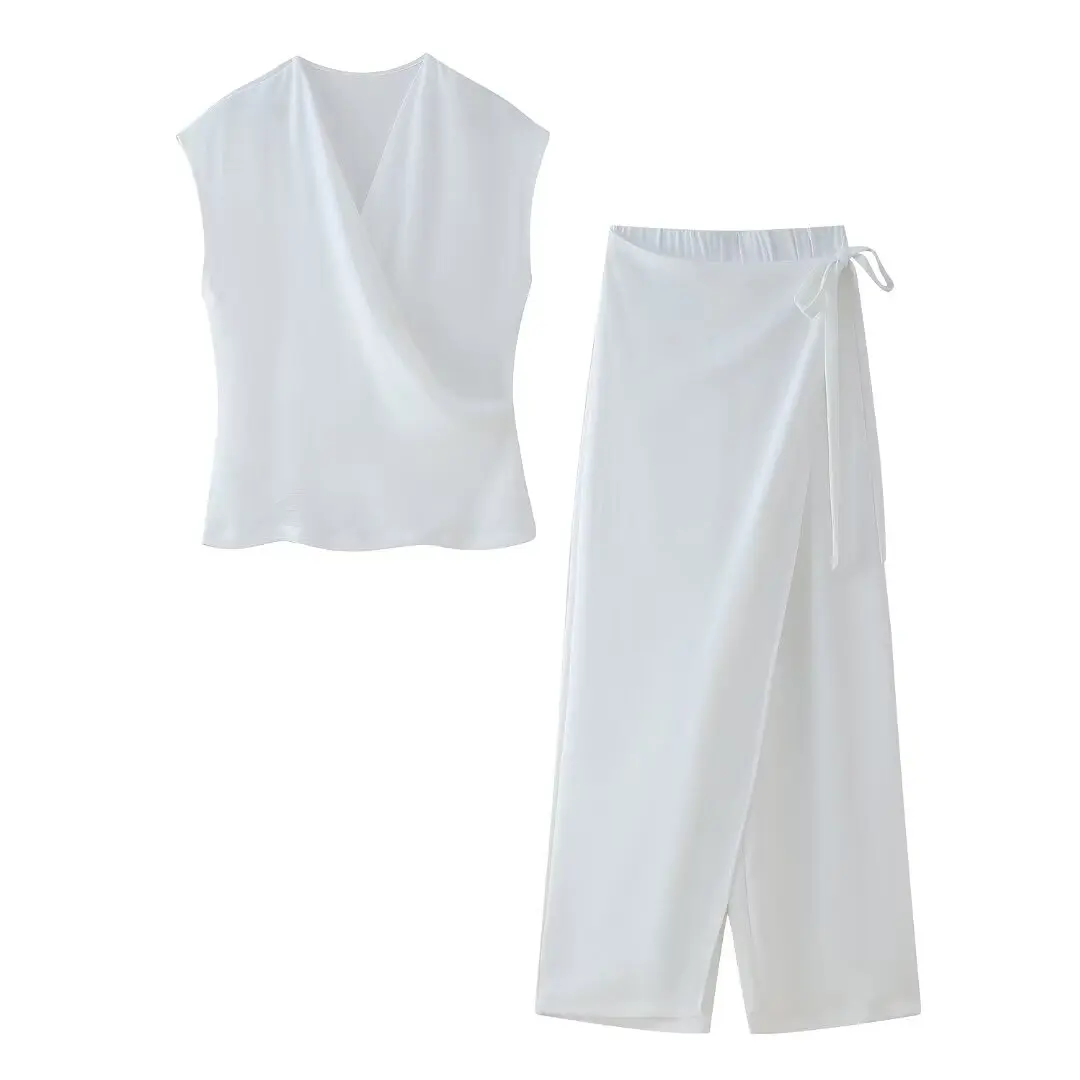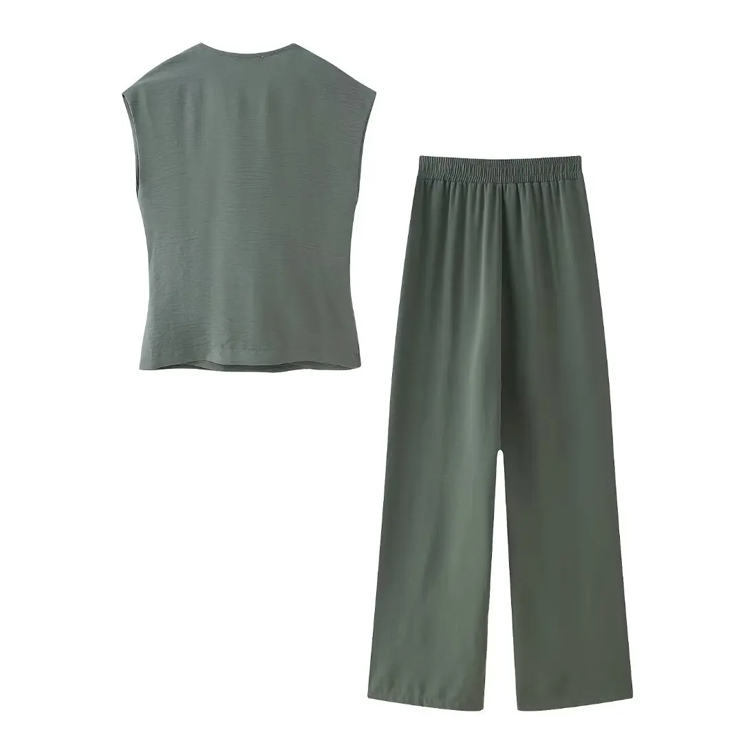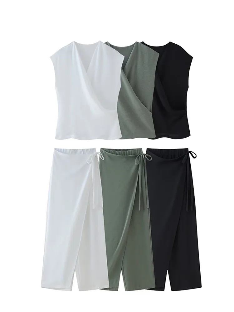 MQTIME - Summer Women's New Suits Solid V-Neck Sleeveless Off Shoulder Top+Side Bow Lace-Up Decoration Elastic Waist Pant Mujer