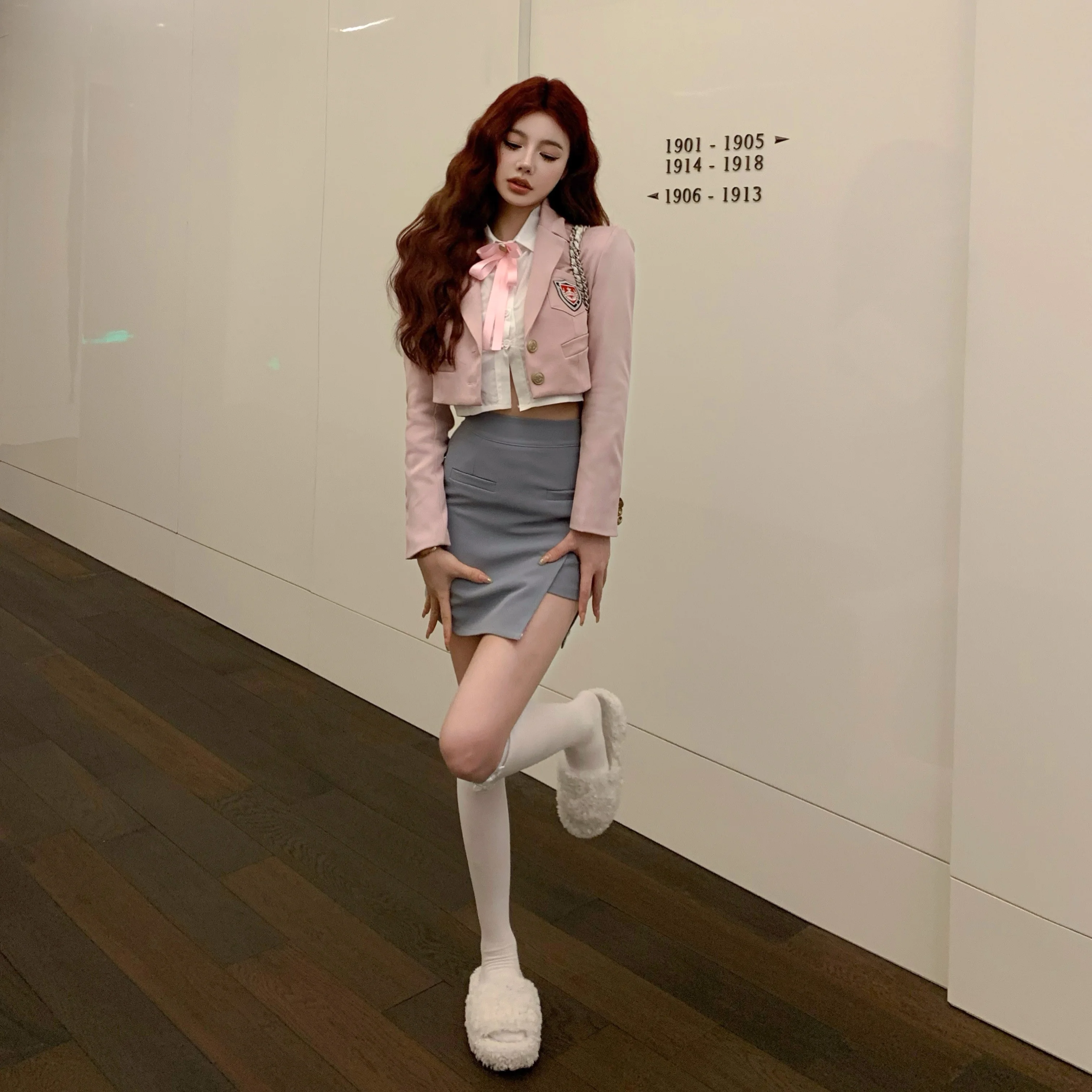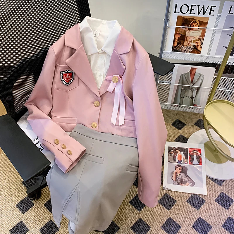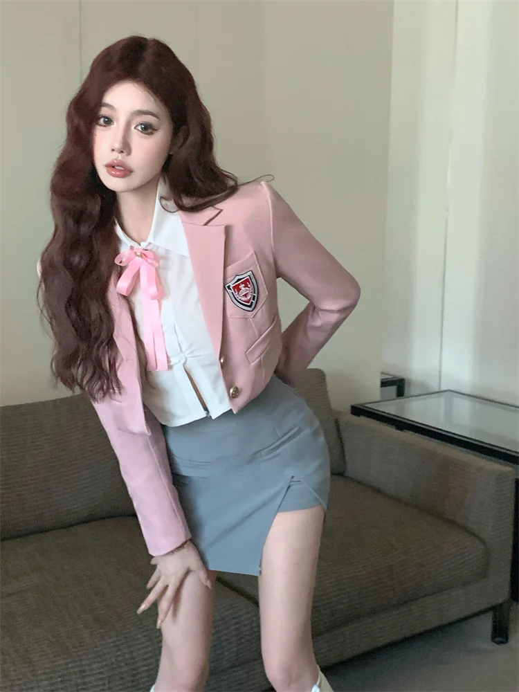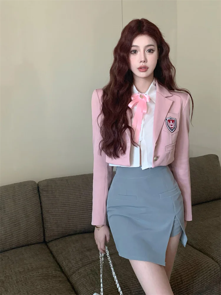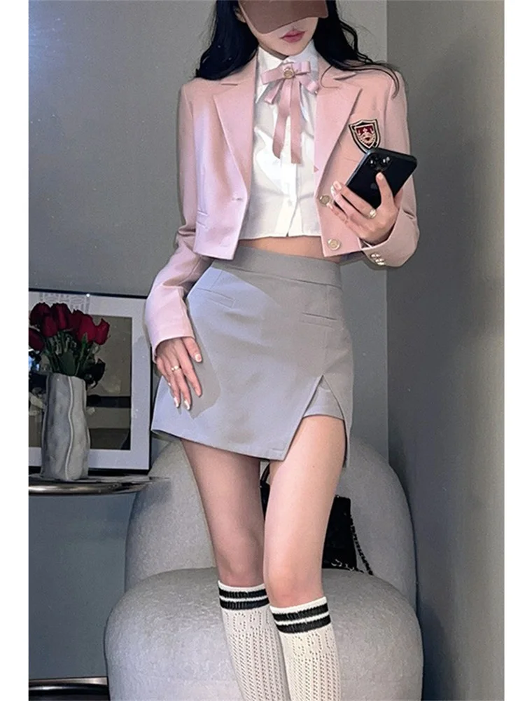 MQTIME  -  Sweet Girls Sexy Skirt Sets 2024 Fall Summer New Pink Jacket+Shirt+mini Skirt 3 Pieces Sets Preppy Style Women 2 Piece Outfits