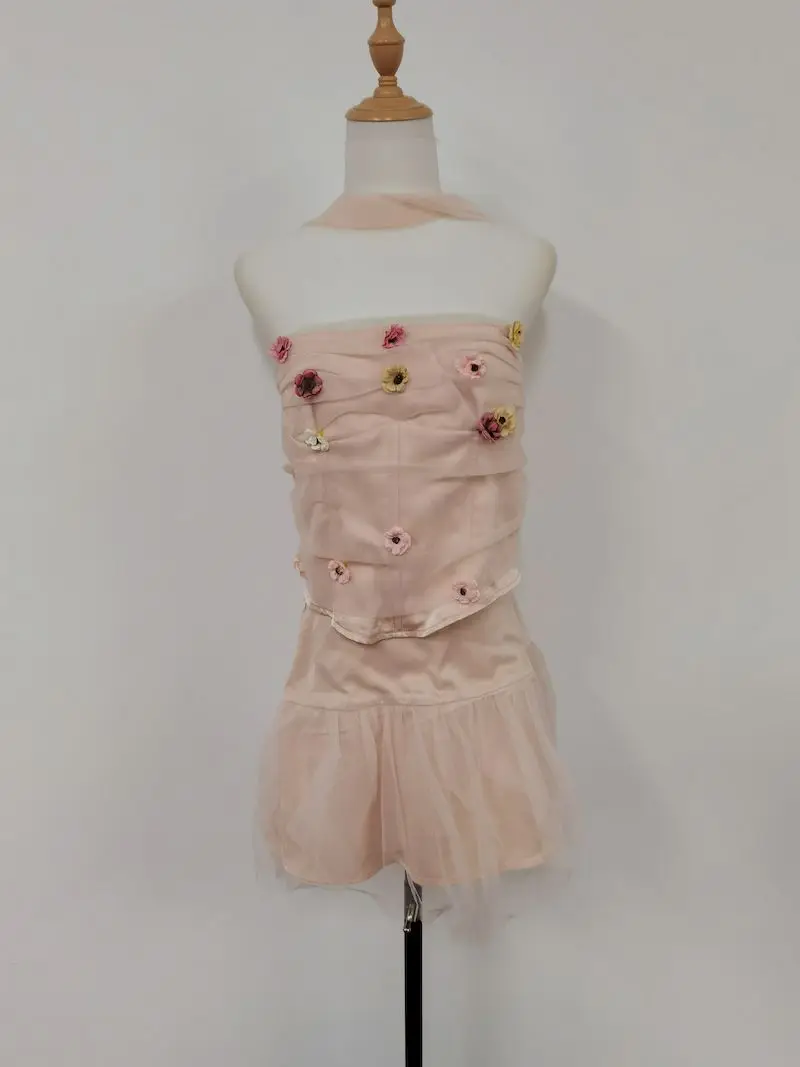 MQTIME - Sweet Hot Girl Pink Suit for Women's Spring Three-dimensional Flower Lace Strapless Top High Waisted A-line Skirt Two-piece Set