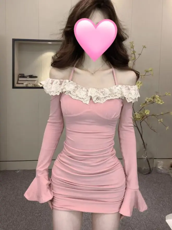 MQTIME - Sweet Hot Girl Pure Sexy Patchwork Lace Dress Women's Halter Neck Long-sleeved Hip Wrap Short Dress Fashion Female Clothes