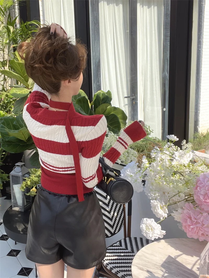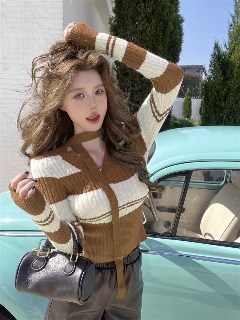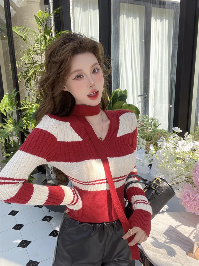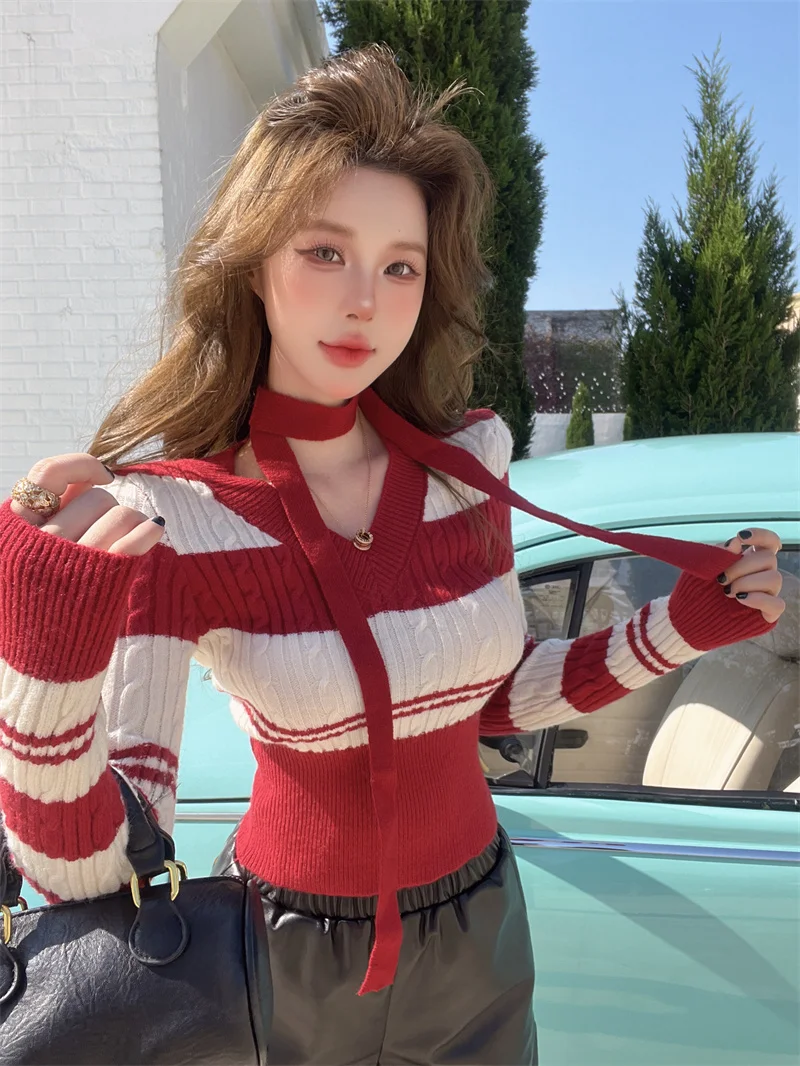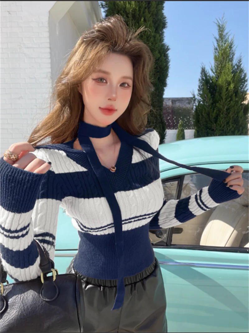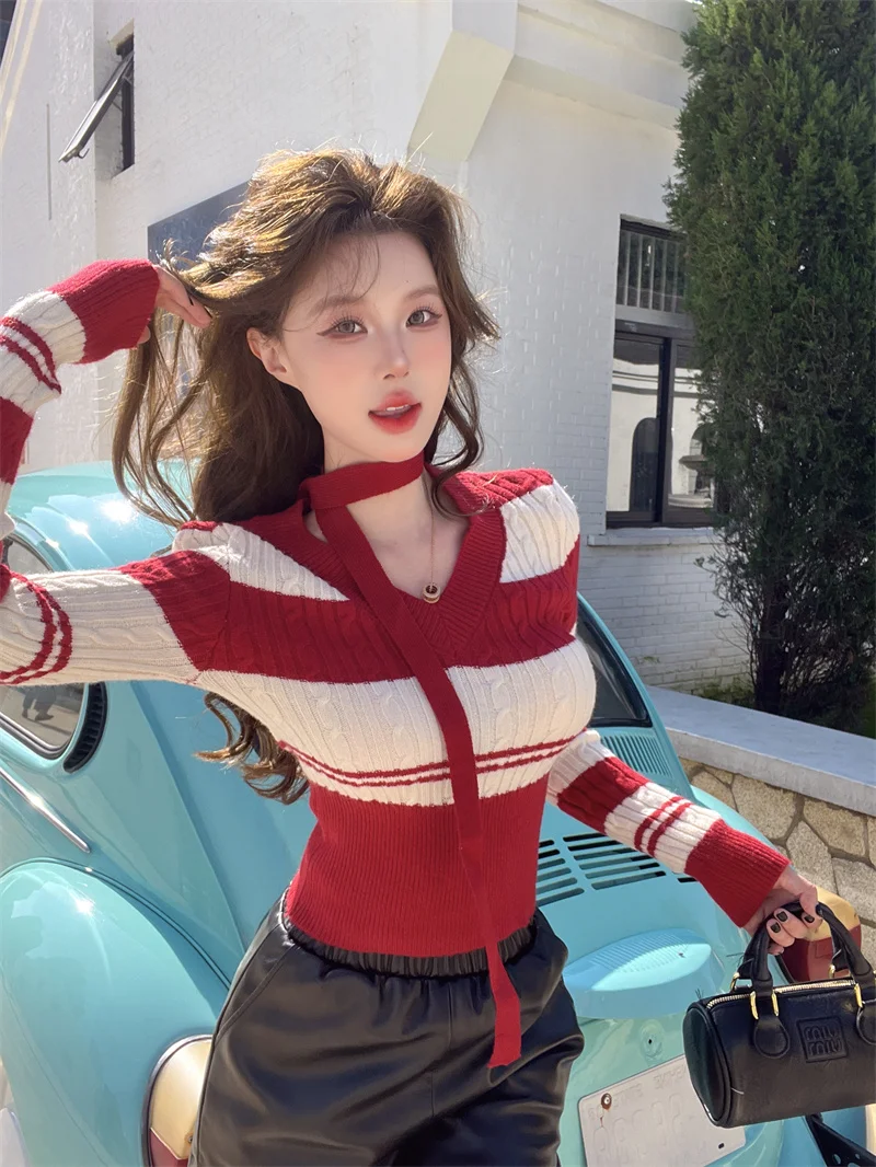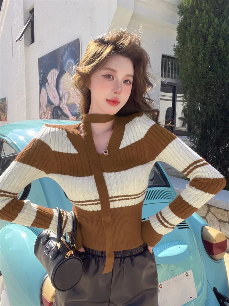 MQTIME - Sweet Hot Girl Retro Contrasting Striped V-neck Sweater Women's Autumn Long-sleeved Slim-fit Knitted Pullover Female Clothes