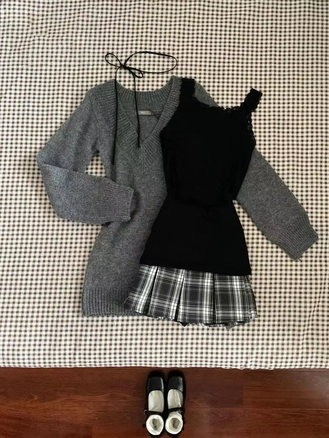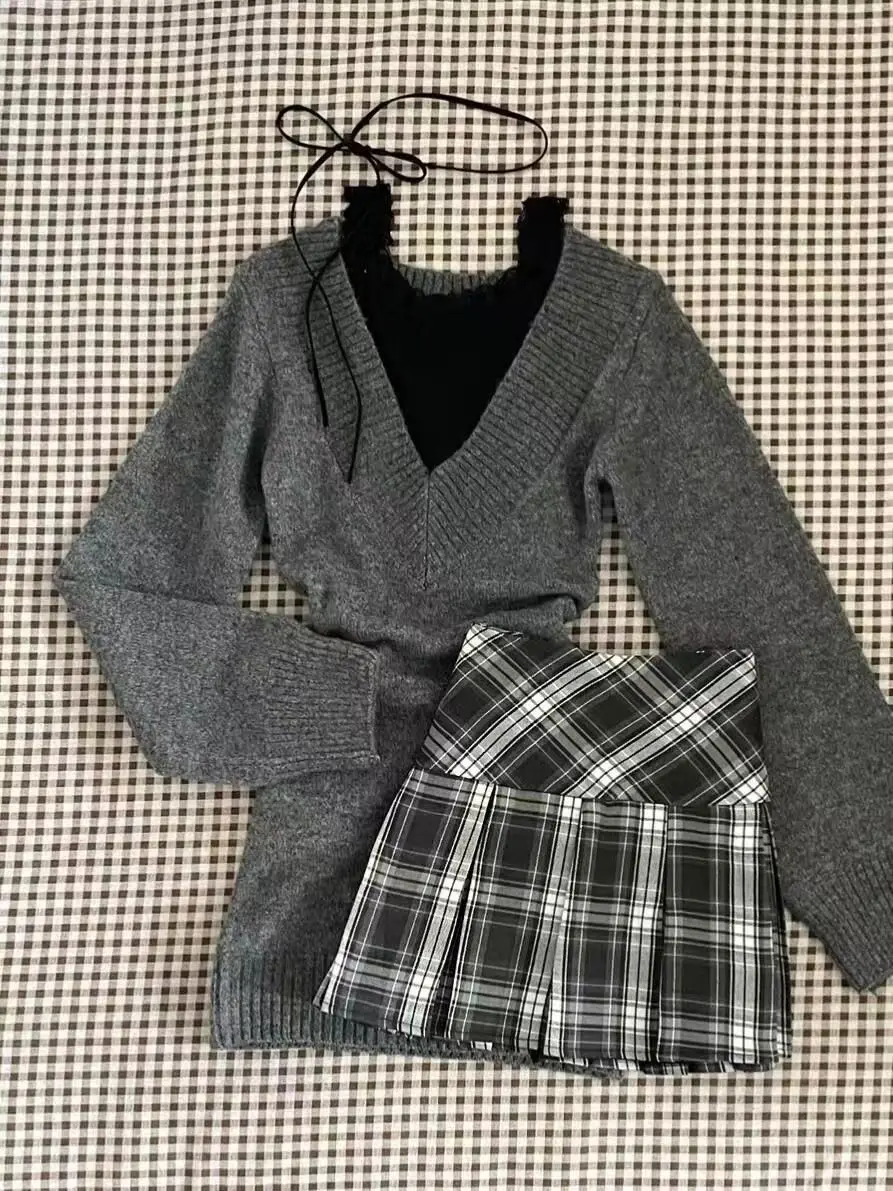 MQTIME - Sweet Hot Girl Retro Suit Women's Autumn V-neck Sweater Strap Vest High Waist Mini Skirt Three-piece Set Fashion Female Clothes