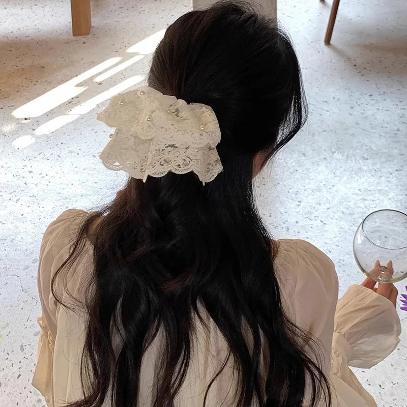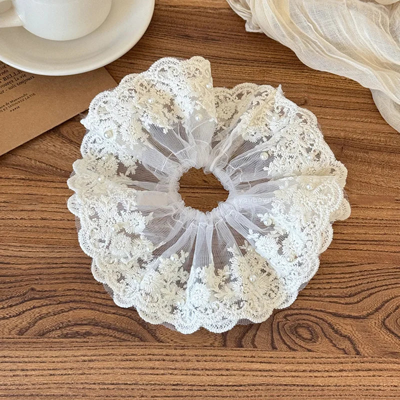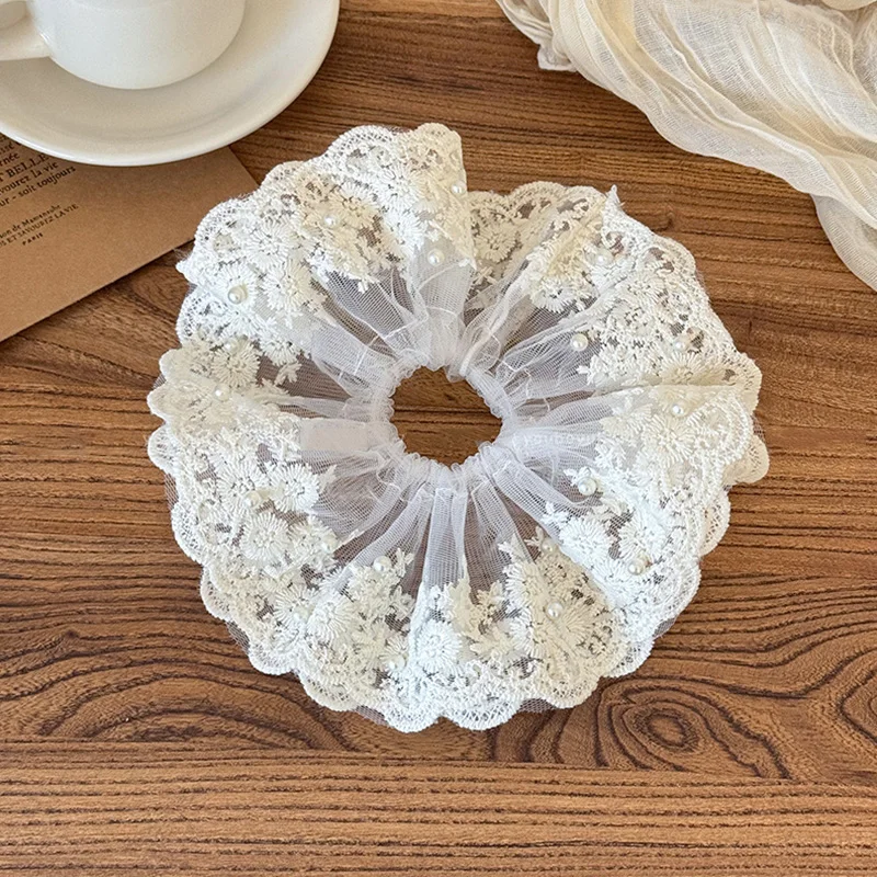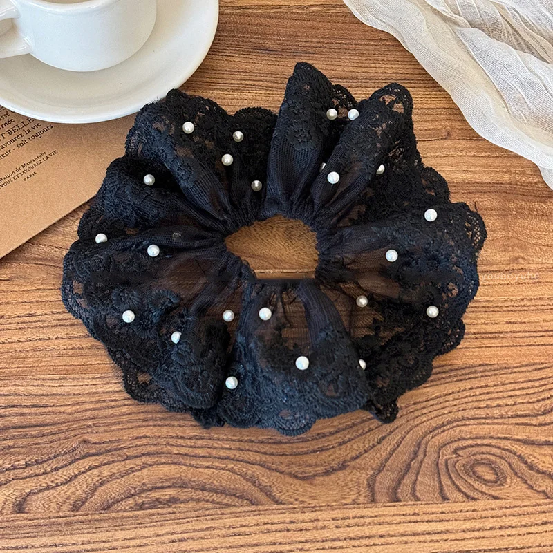 MQTIME - Sweet Solid Lace Pearl large Intestine Scrunchie For Women Girls Elegant Hair Tie Elastic Hair Band Rubber Band Hair Accessories