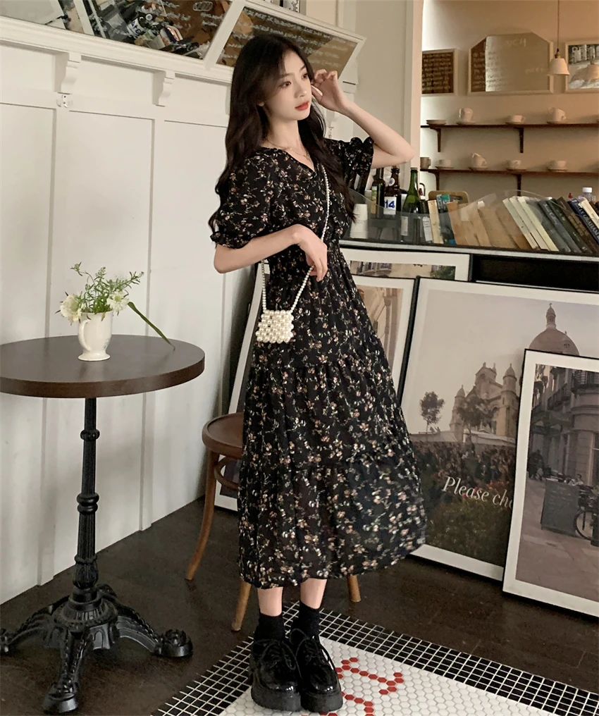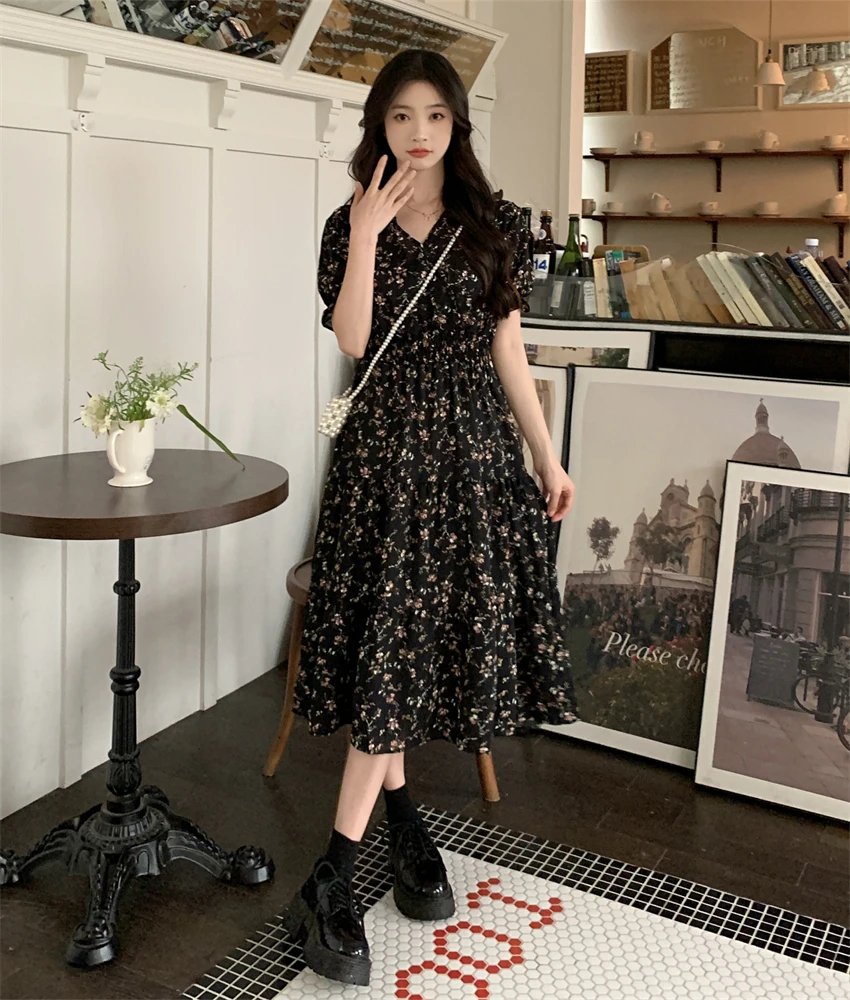 MQTIME - Tea break French V-neck floral dress for women's summer 2024 new waistband slimming cake skirt A-line skirt mid length skirt