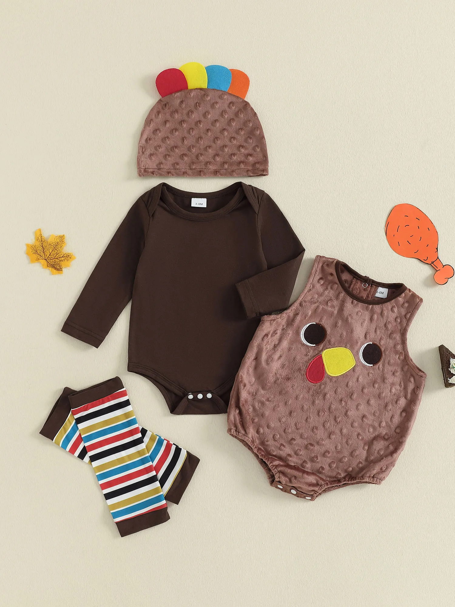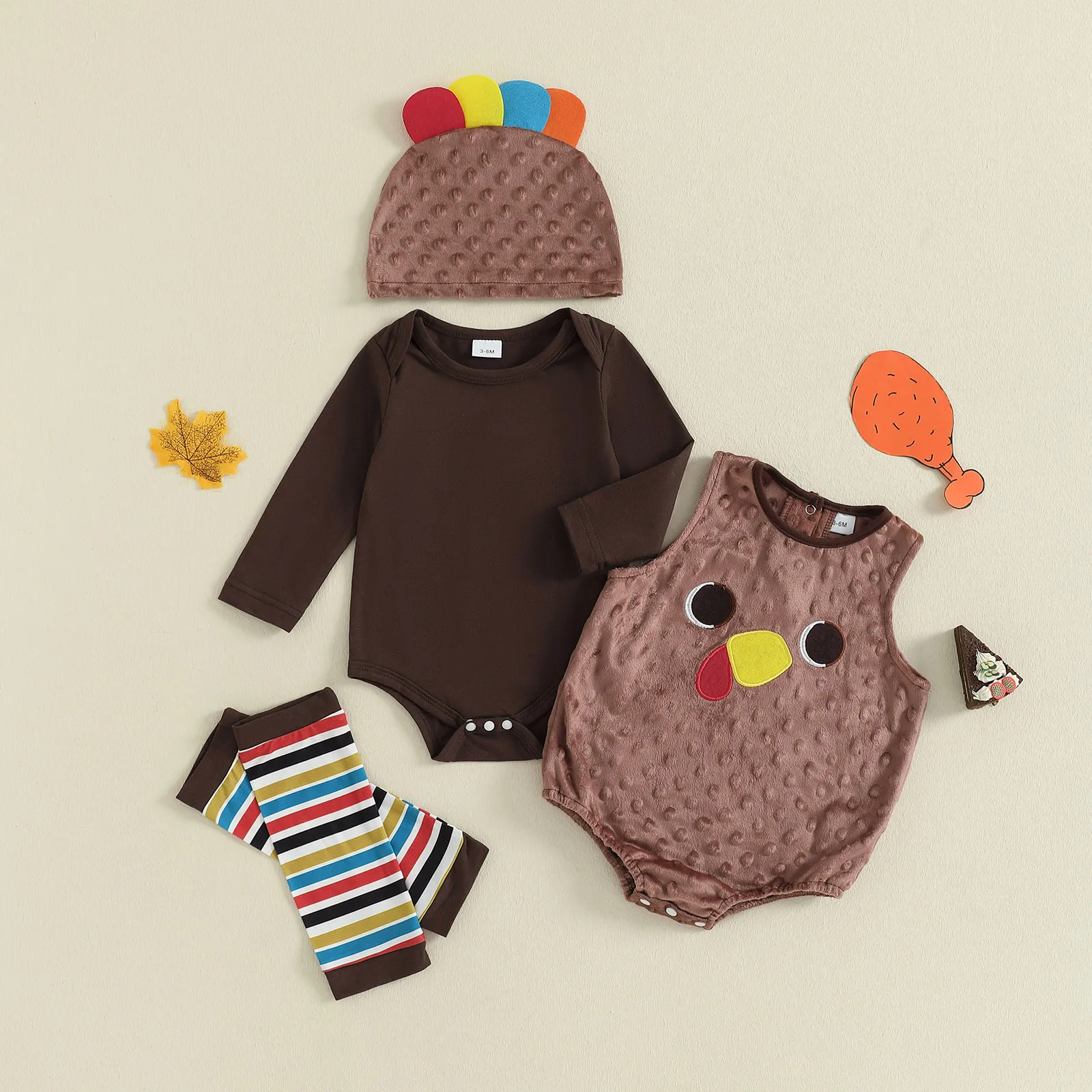MQTIME - Thanksgiving Baby Outfit Set with Solid Long Sleeve Romper Turkey Sleeveless Bodysuit Striped Leg Warmers and Hat - 4 Piece