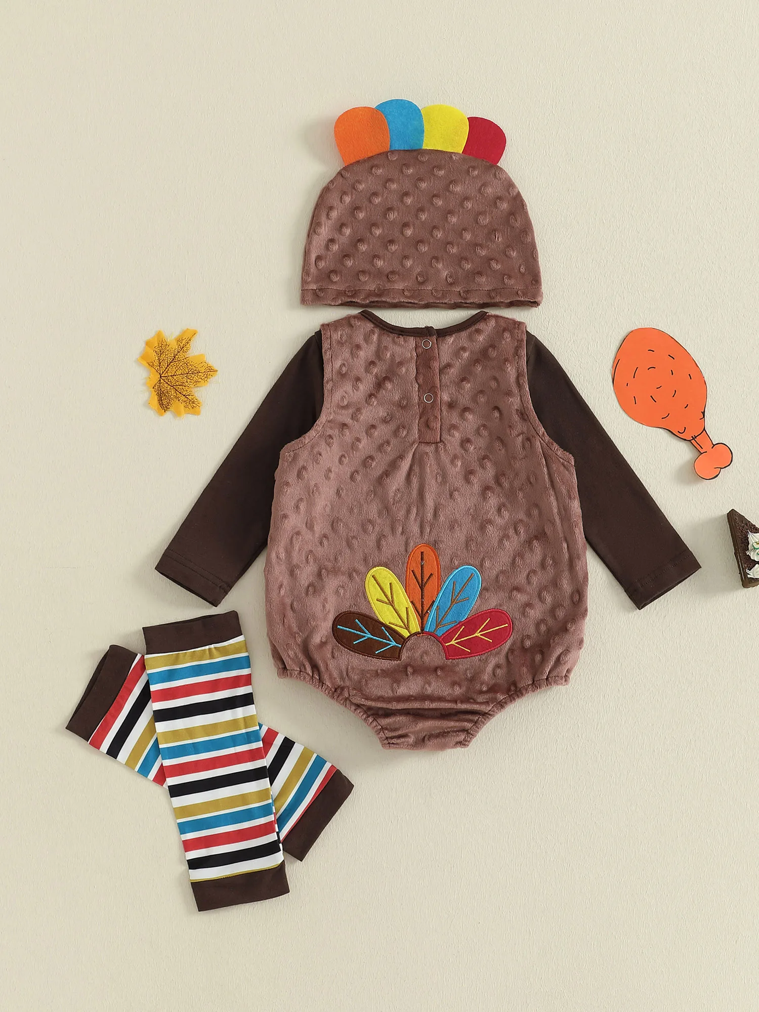1 * Long Sleeve Romper + 1 * Turkey Romper + 1 * Pair of Leg Warmers + 1 * Hat