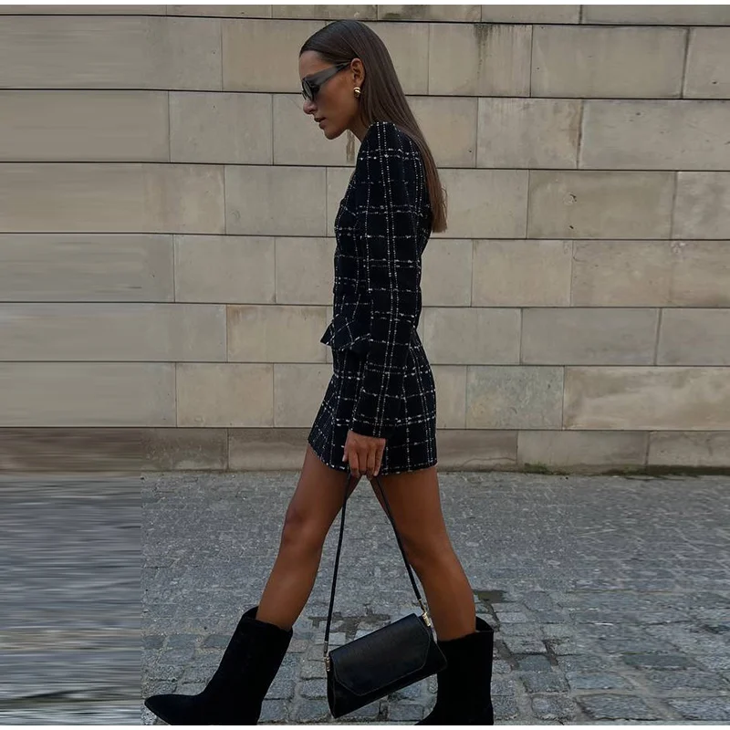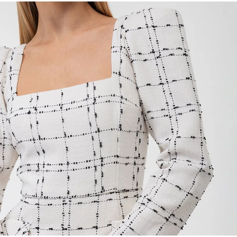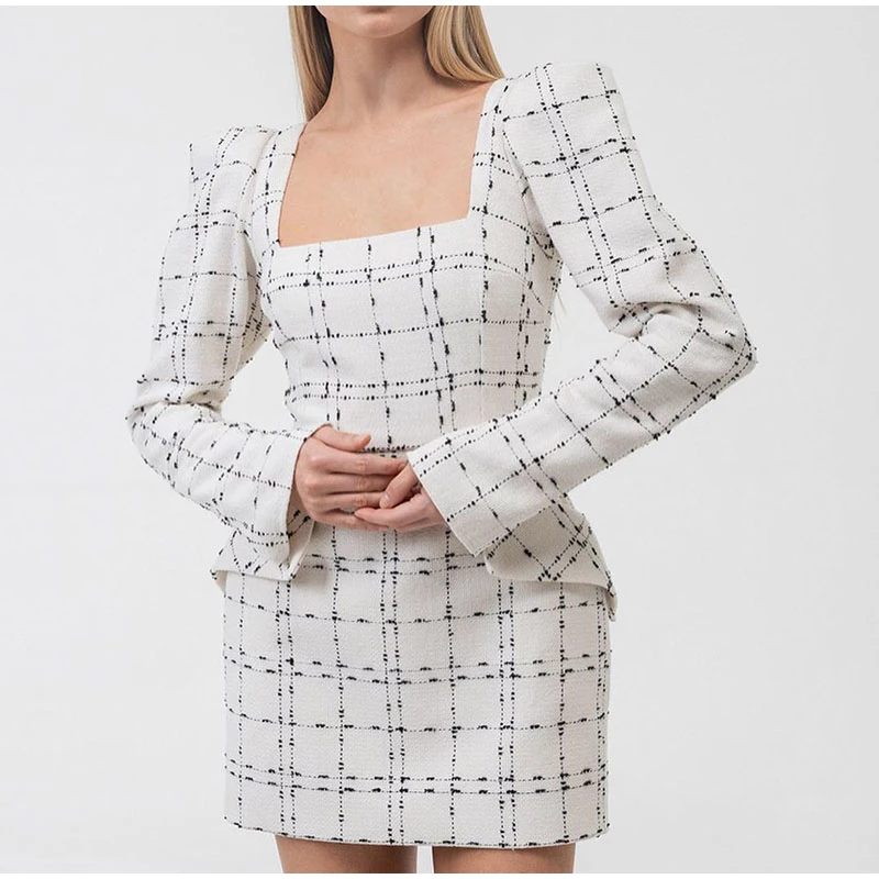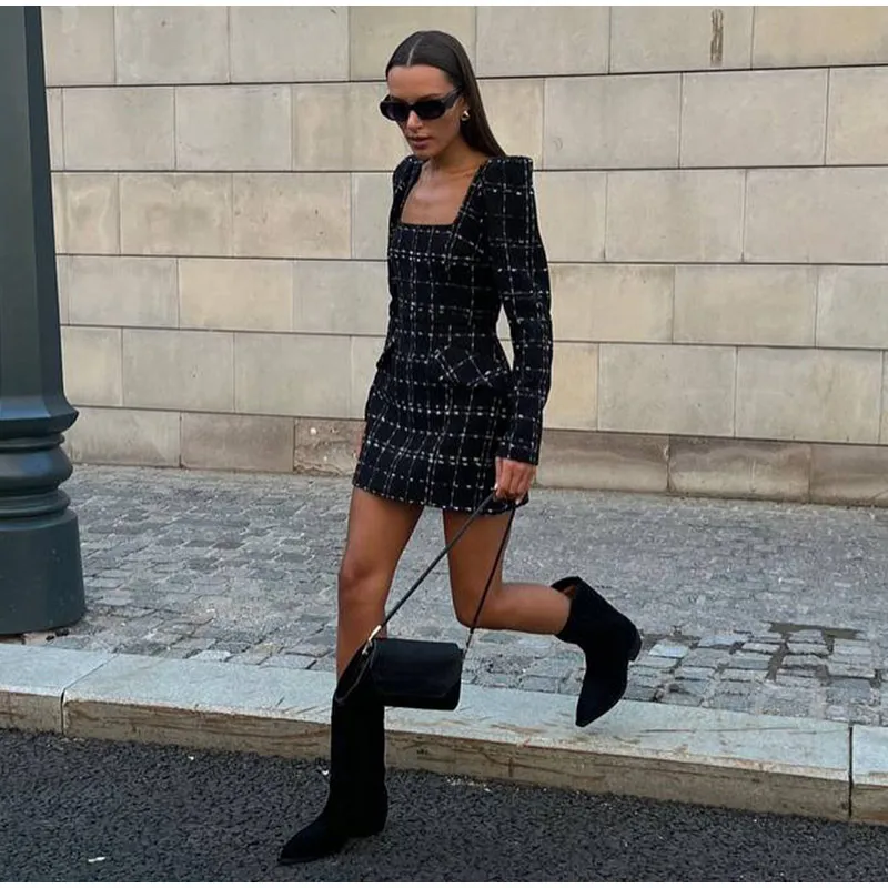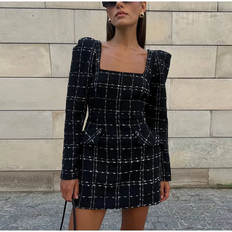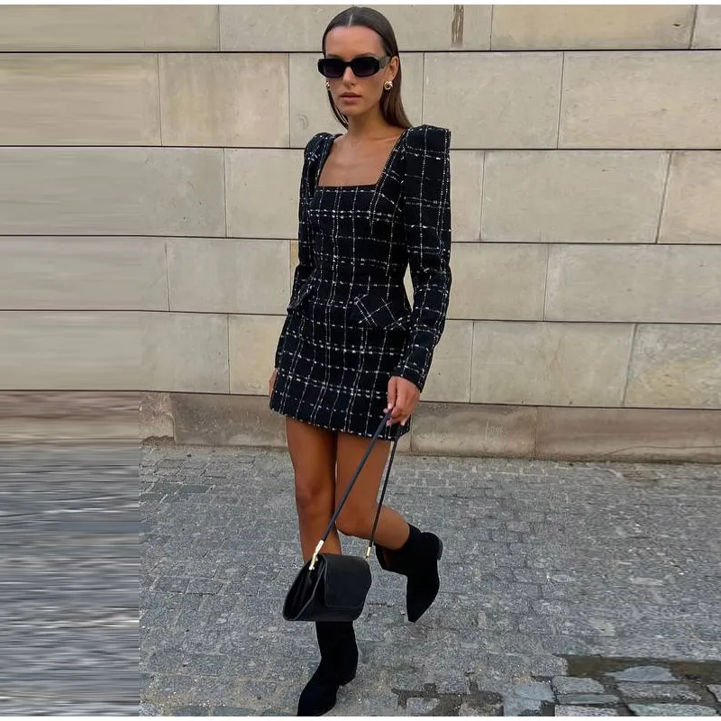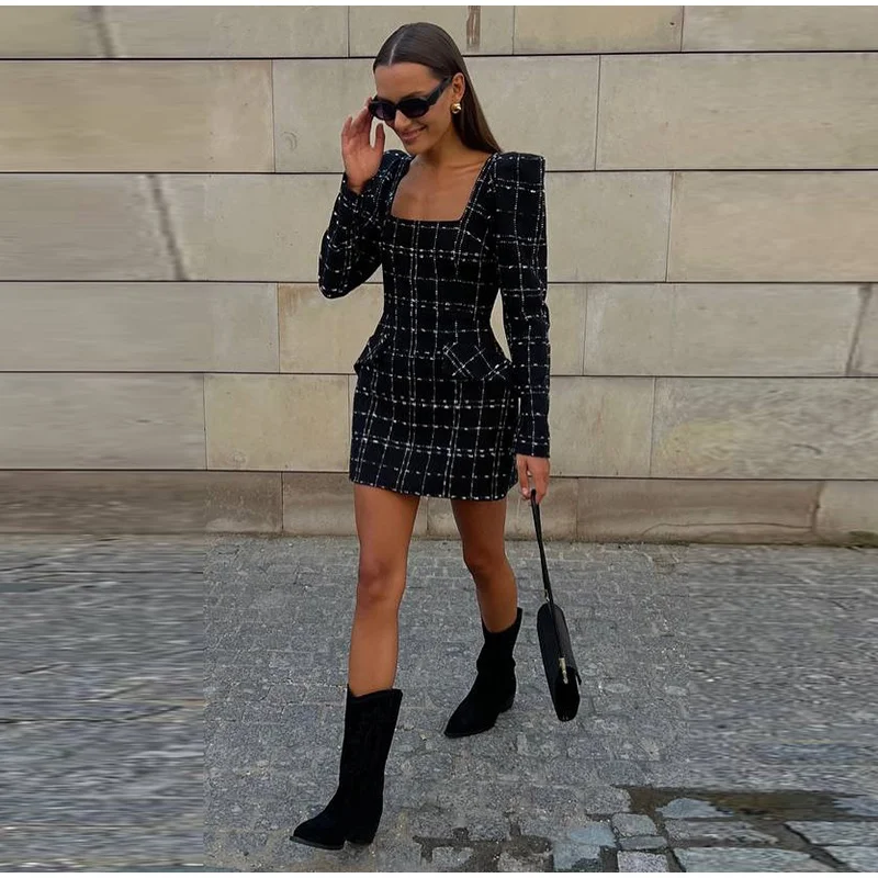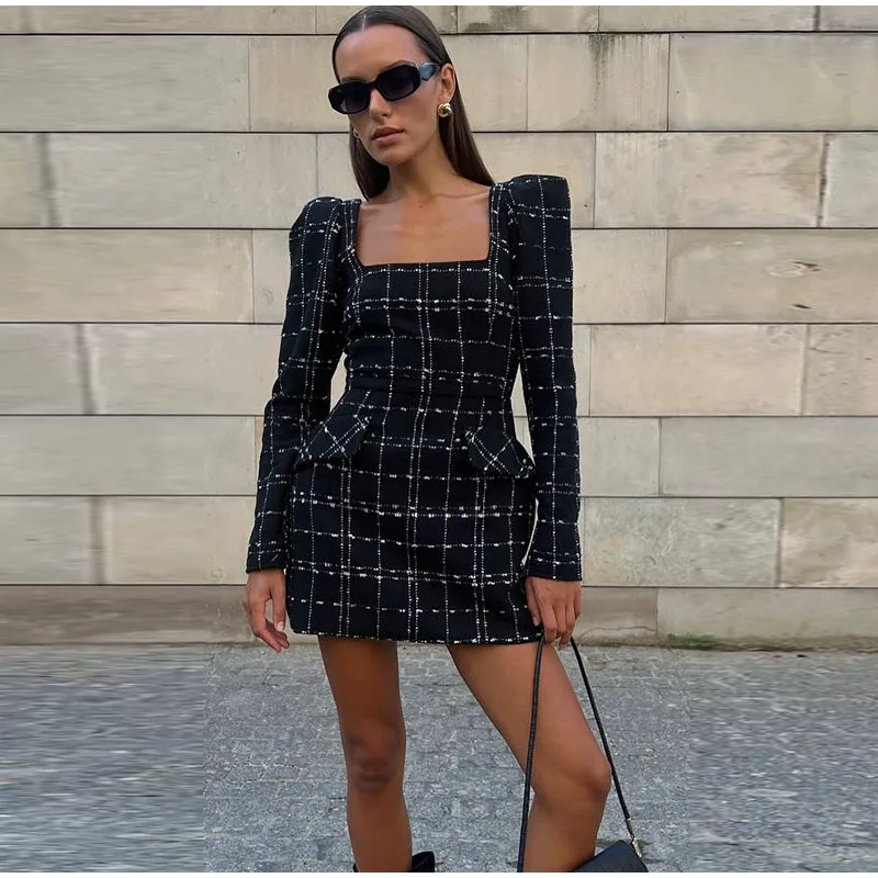 MQTIME - Tweed Plaid Elegant Long Sleeve Mini Dress Women Square Collar High Waist 2025 Autumn Casual Dresses Party Evening Lady Robe
