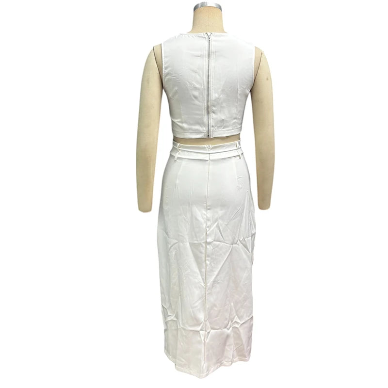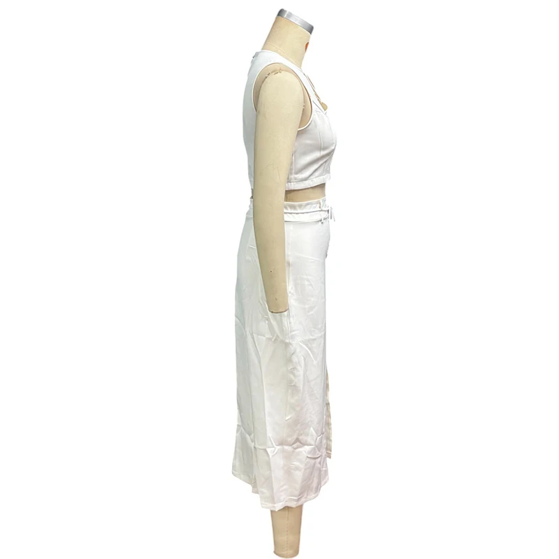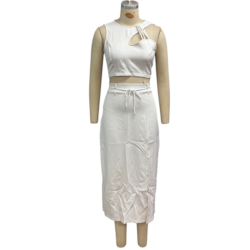 MQTIME - Two Piece Set Summer Elegant Hollow Out Irregular Solid Sleeveless High Waist Top A Line Slit Midi Skirts Sets Streetwear