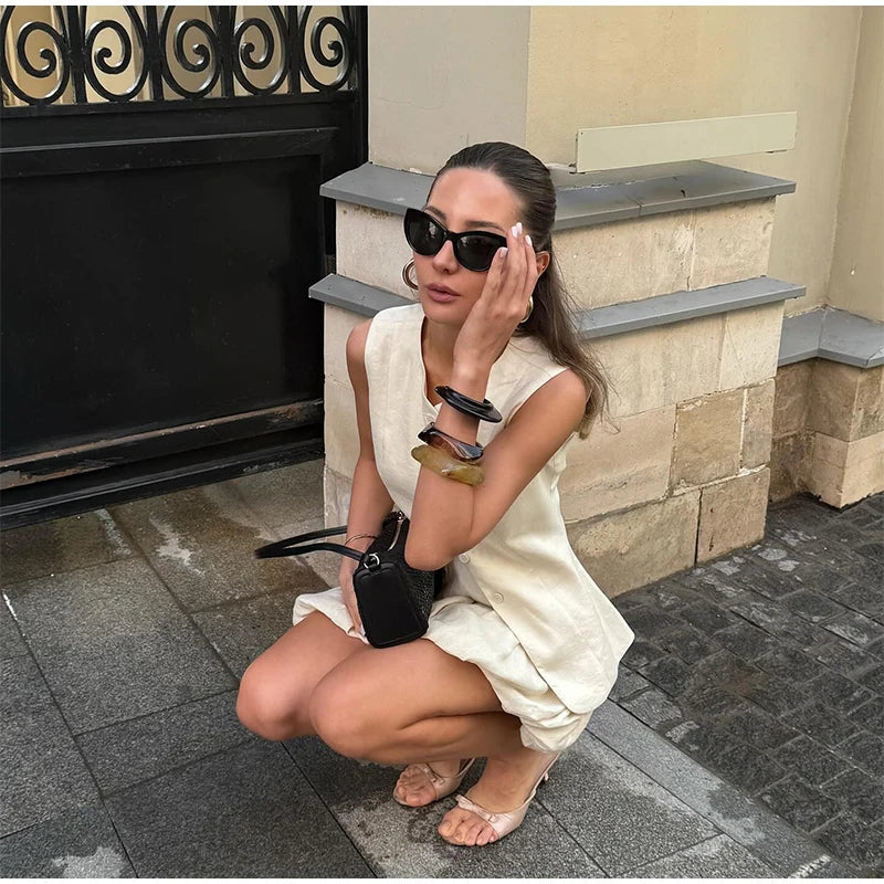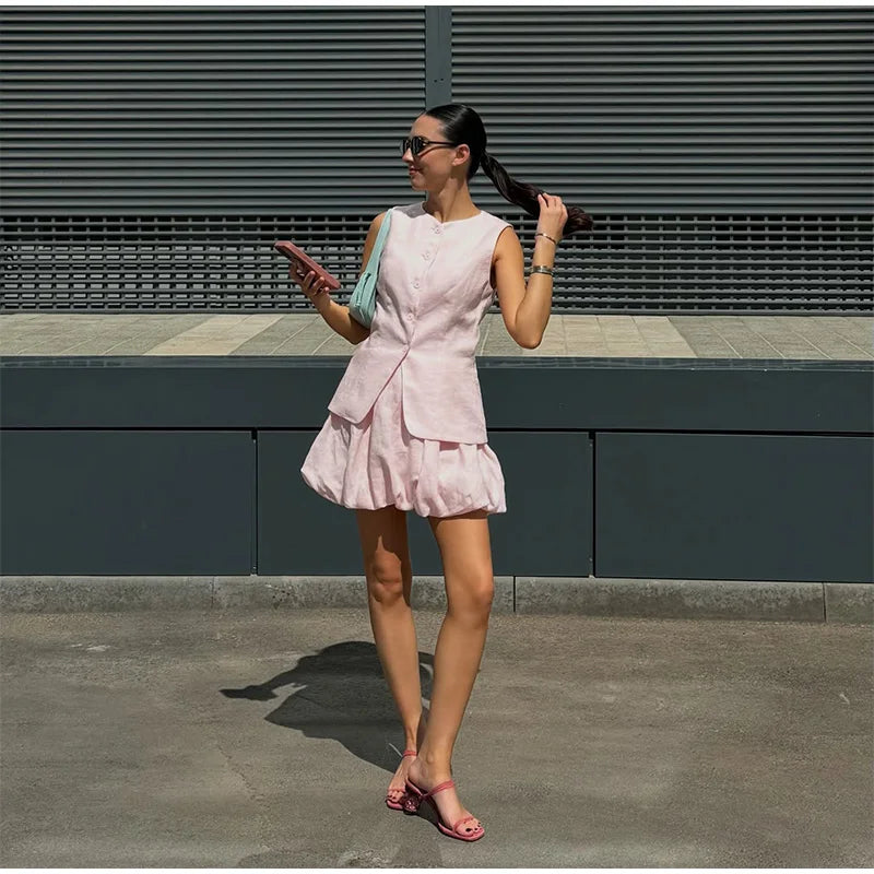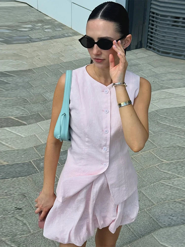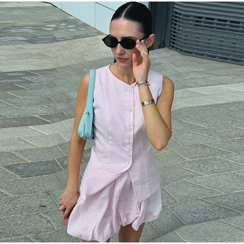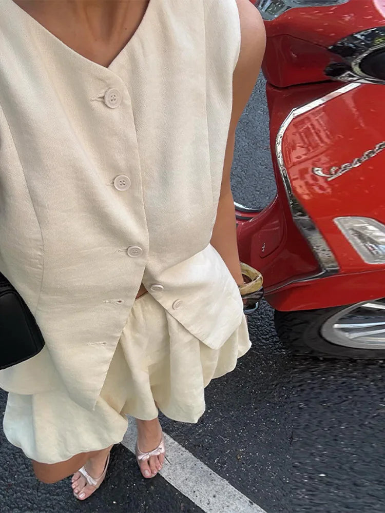 MQTIME - Two Pieces Set Women's Vest Skort Suits Sleeveless Button-front Top Ruffled Loose Shorts Summer Office Casual Daily Outfit