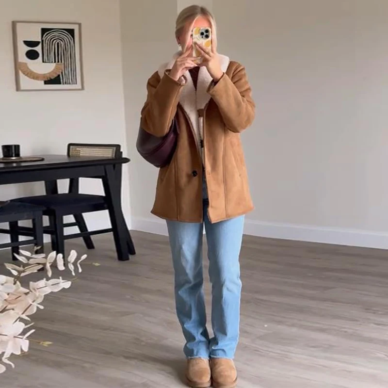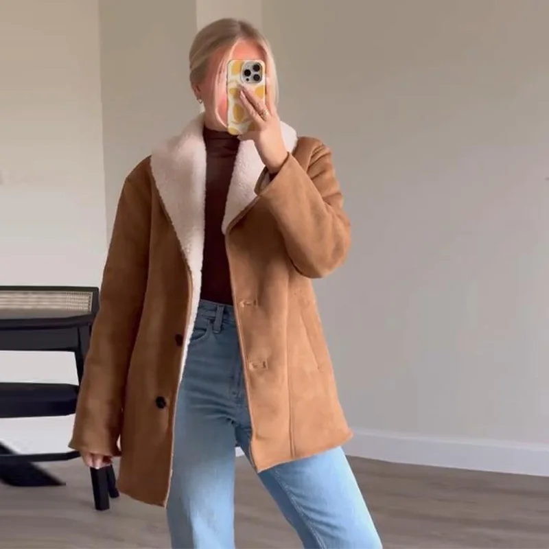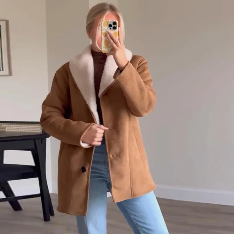 MQTIME  -  Vintage Lamb Wool Solid Women Outwear Lapel Full Sleeve Loose Female Jacket 2024 Casual Autumn Warm Single Breasted Lady Coat