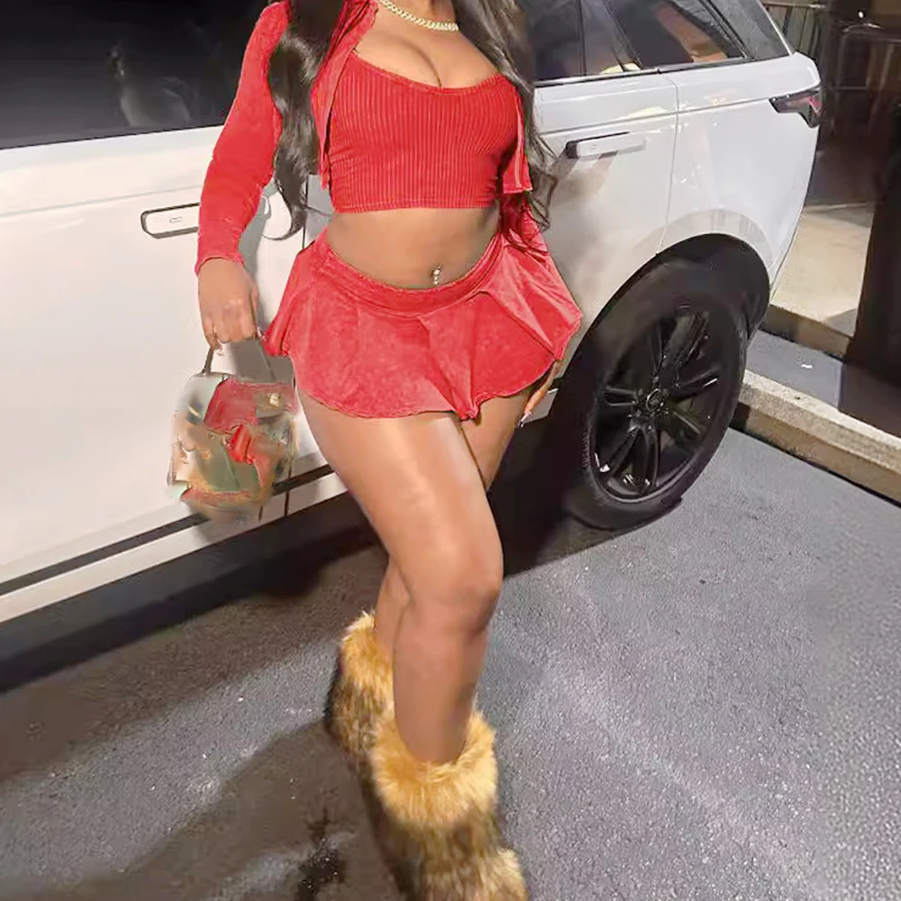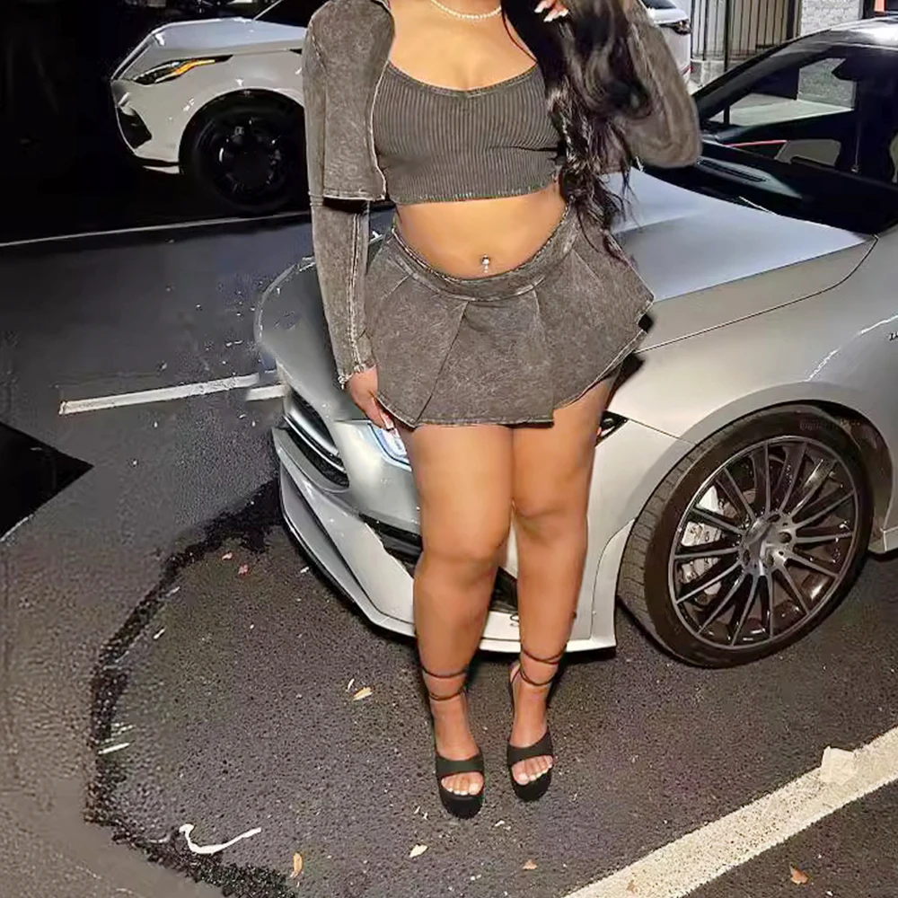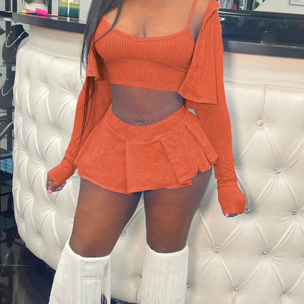 MQTIME - Washed Printed Skirt Three-piece Set Short Shirt Spaghetti Strap Vest Above Knee Length Mini Skirt Sexy Skirtsuit Set for Club