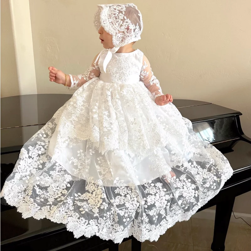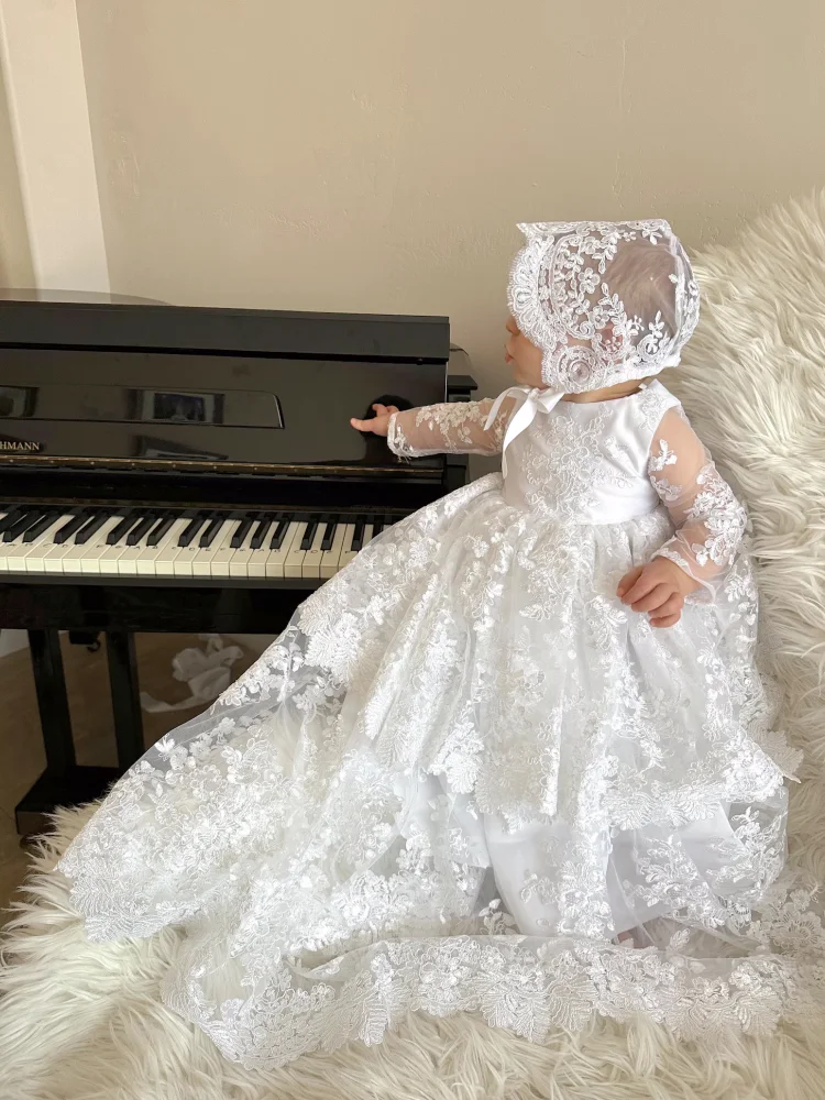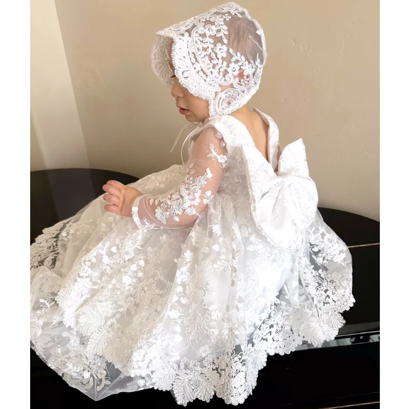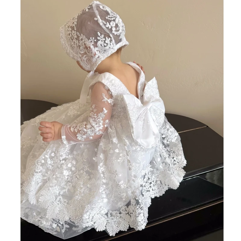 MQTIME - White Flower Girl Dresses Lace Appliques With Bow Long Sleeve For Wedding Birthday Party First Communion Gowns