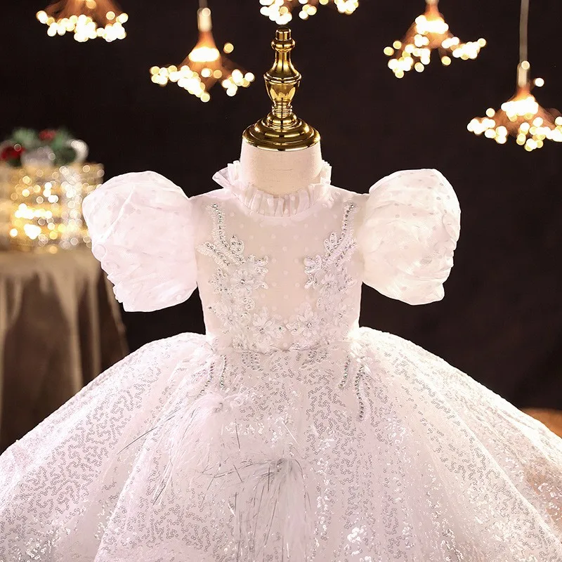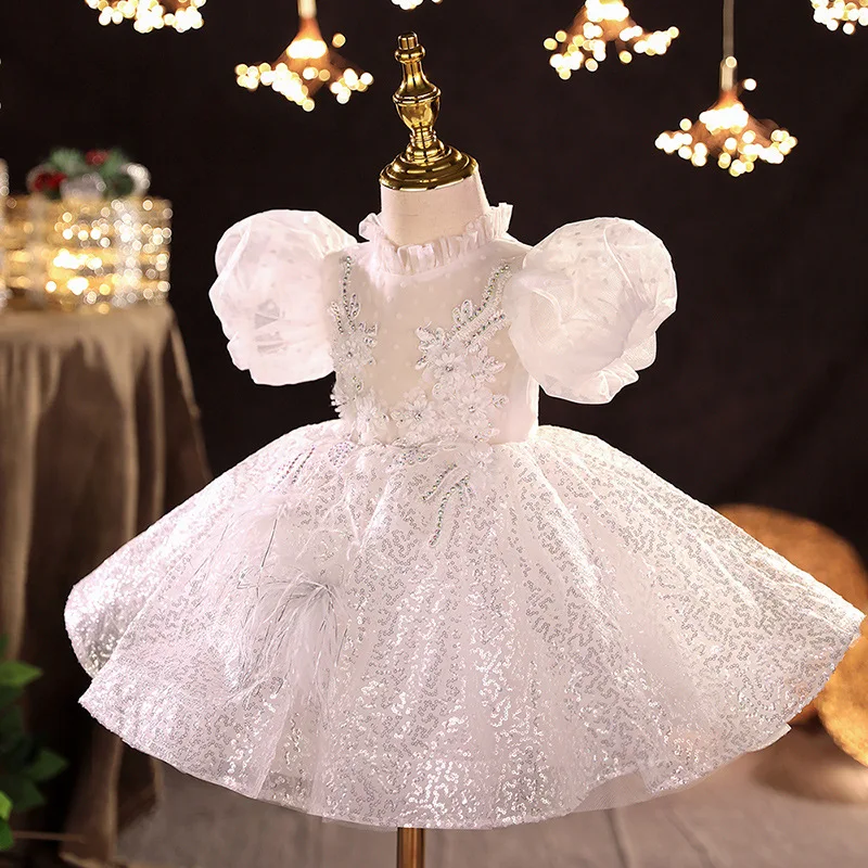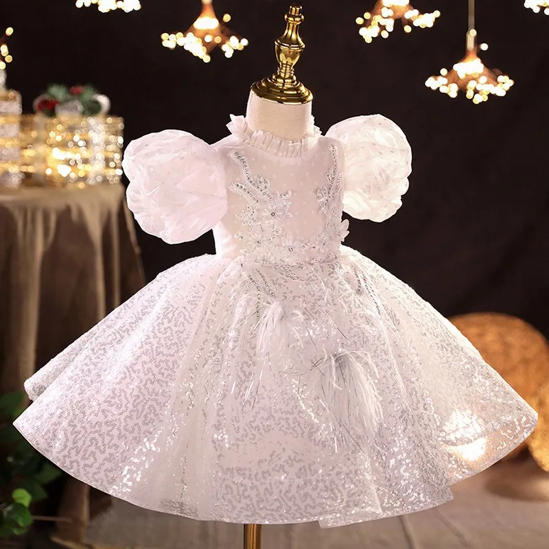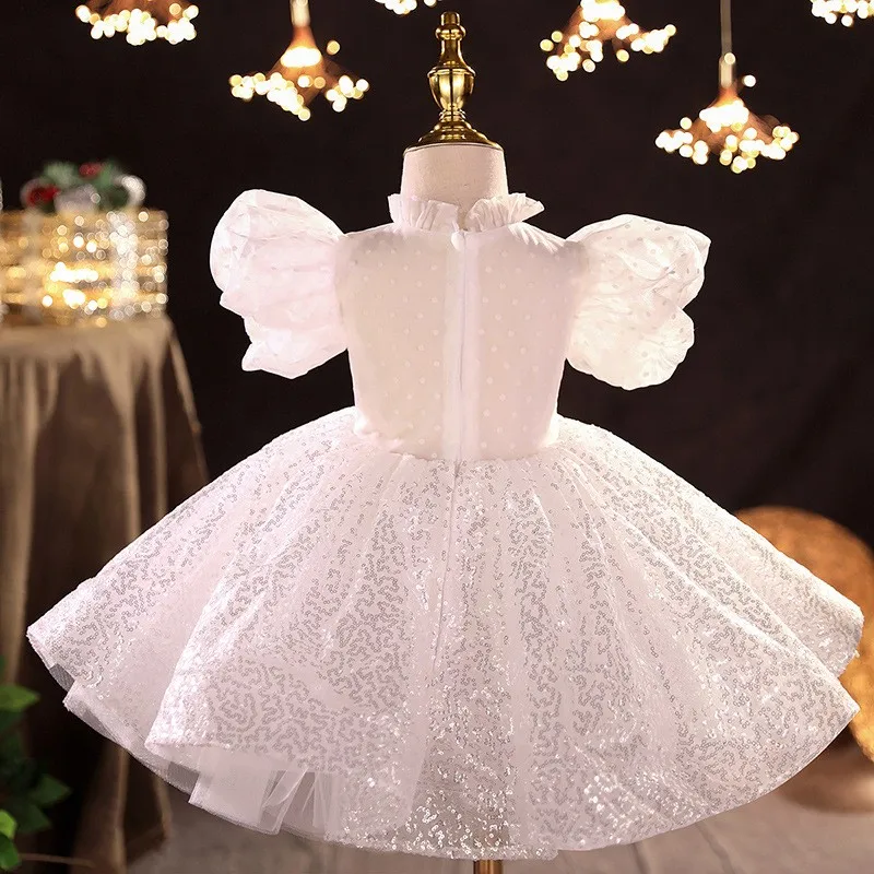MQTIME  -  White Glitter Flower Girl Dress Sequins Tulle Lace Knee Length For Wedding  Birthday Party Pageant First Communion Ball Gowns