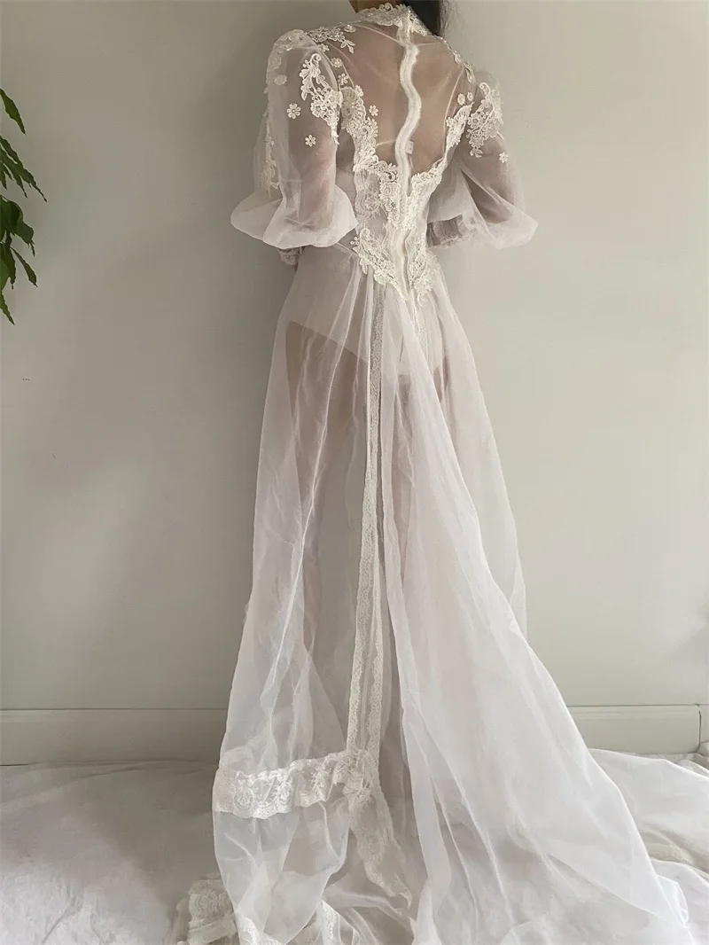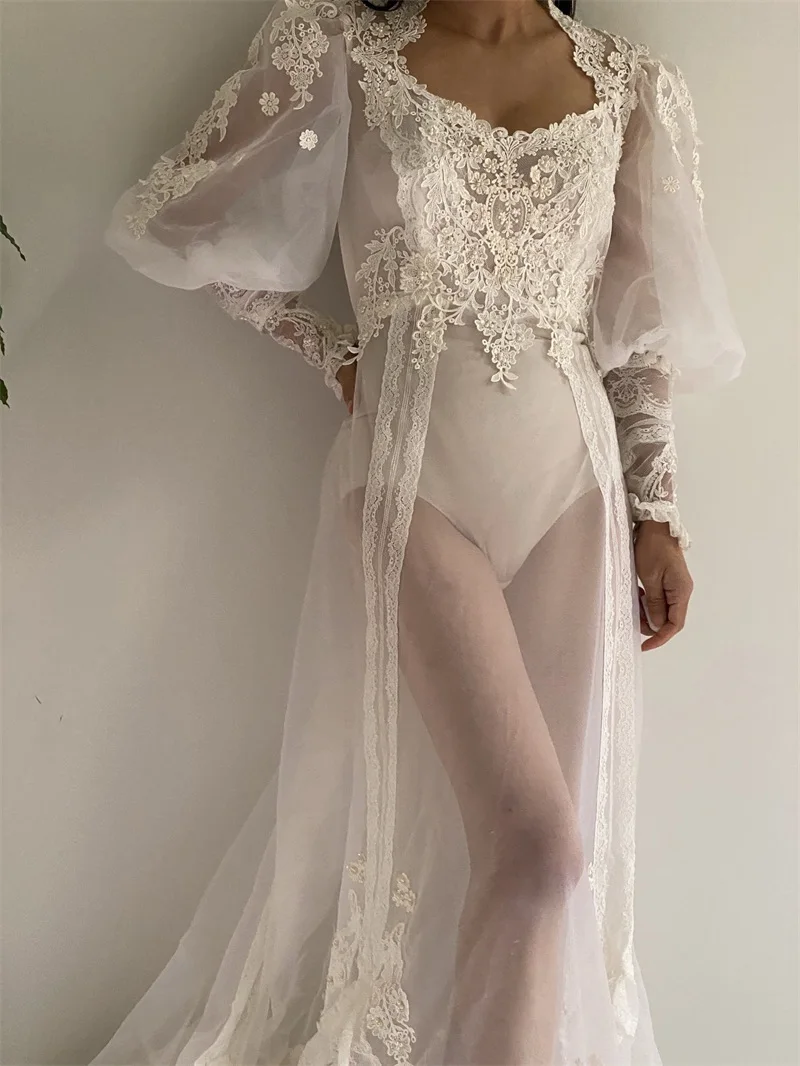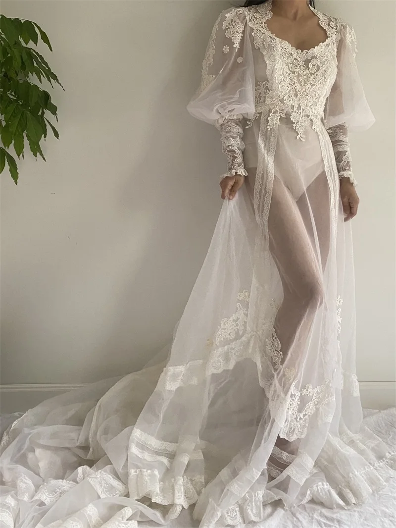 MQTIME - White Lace Sequined Tulle Long Sleeve Bridal Wrap Sexy Kimono Pregnant Party Sleepwear Women Bathrobe Sheer Nightgown Robe