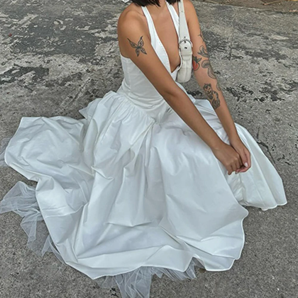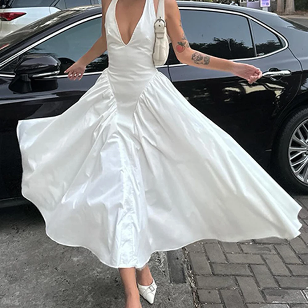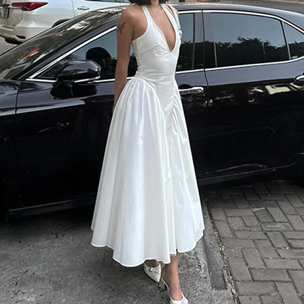 MQTIME - White V-neck Dress Elegant Strap Dresses Backless Long Vestidos Solid Color Ankle Length Skirt for Lady Party Street Engagement