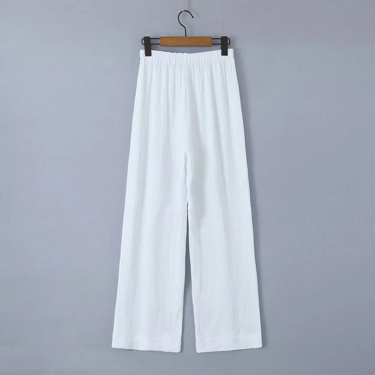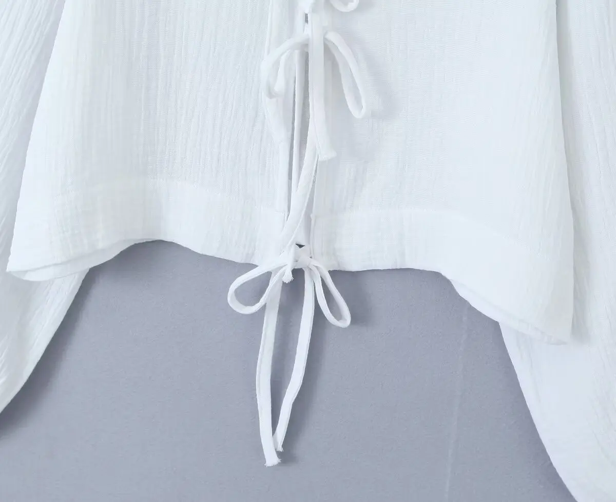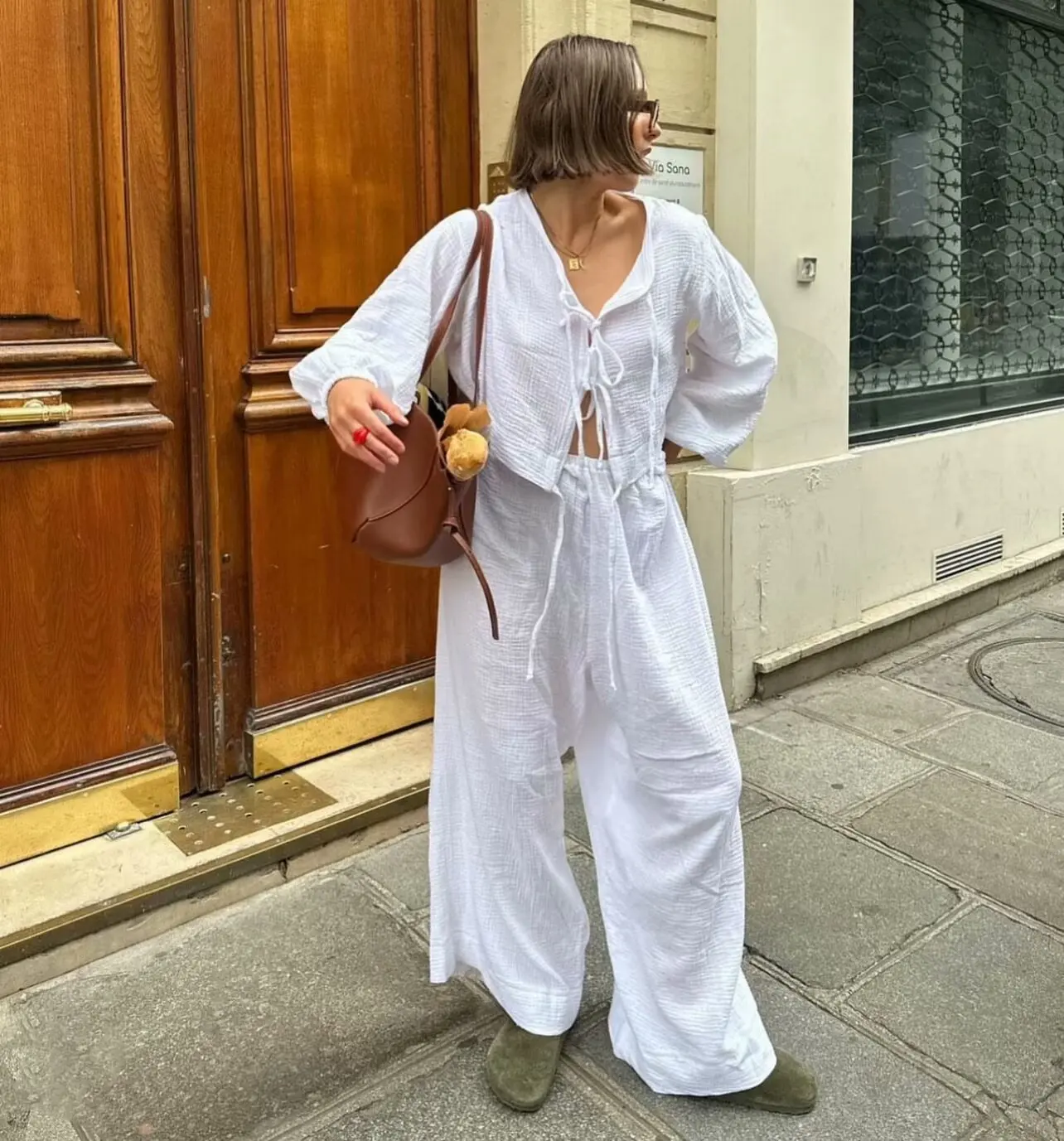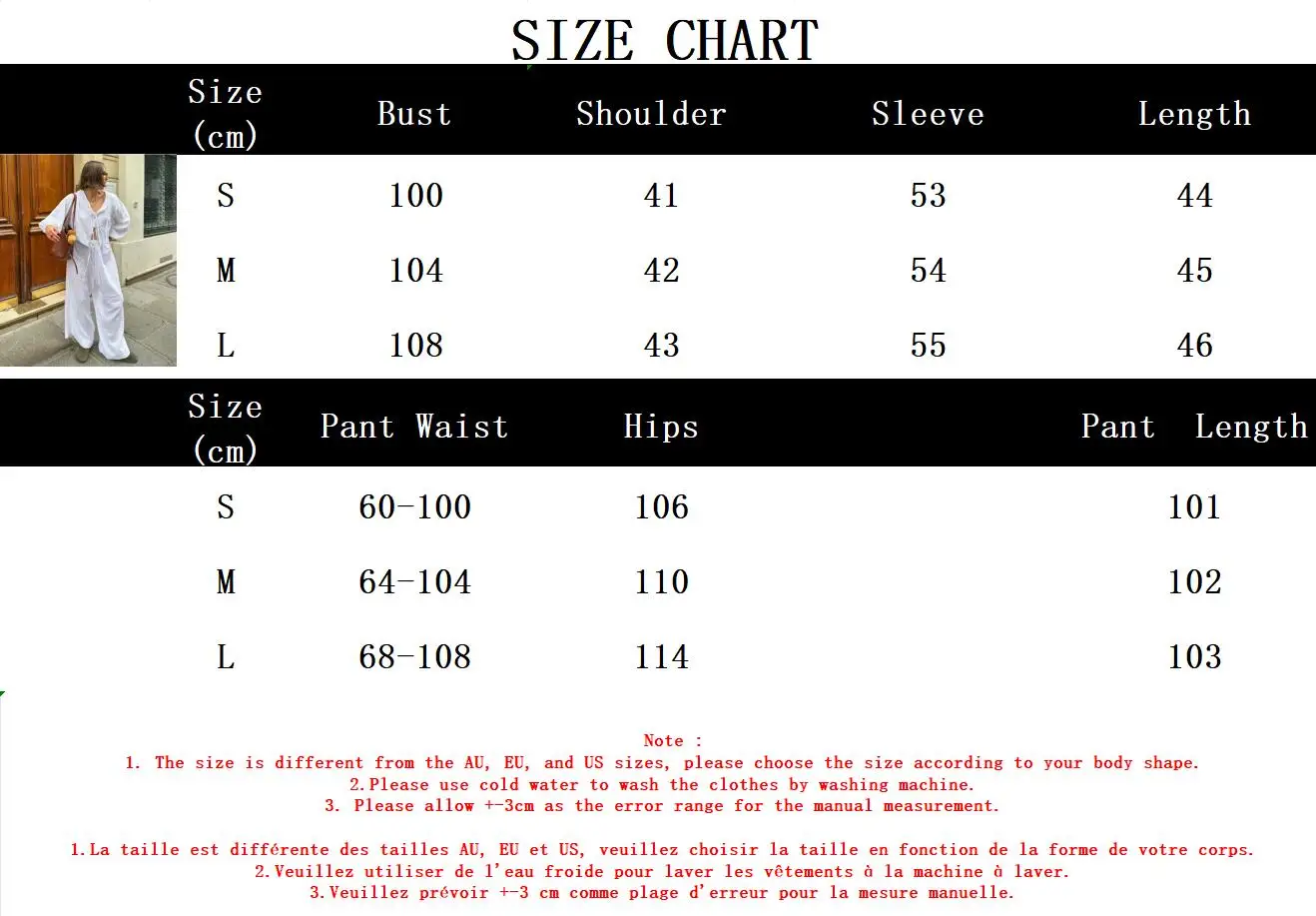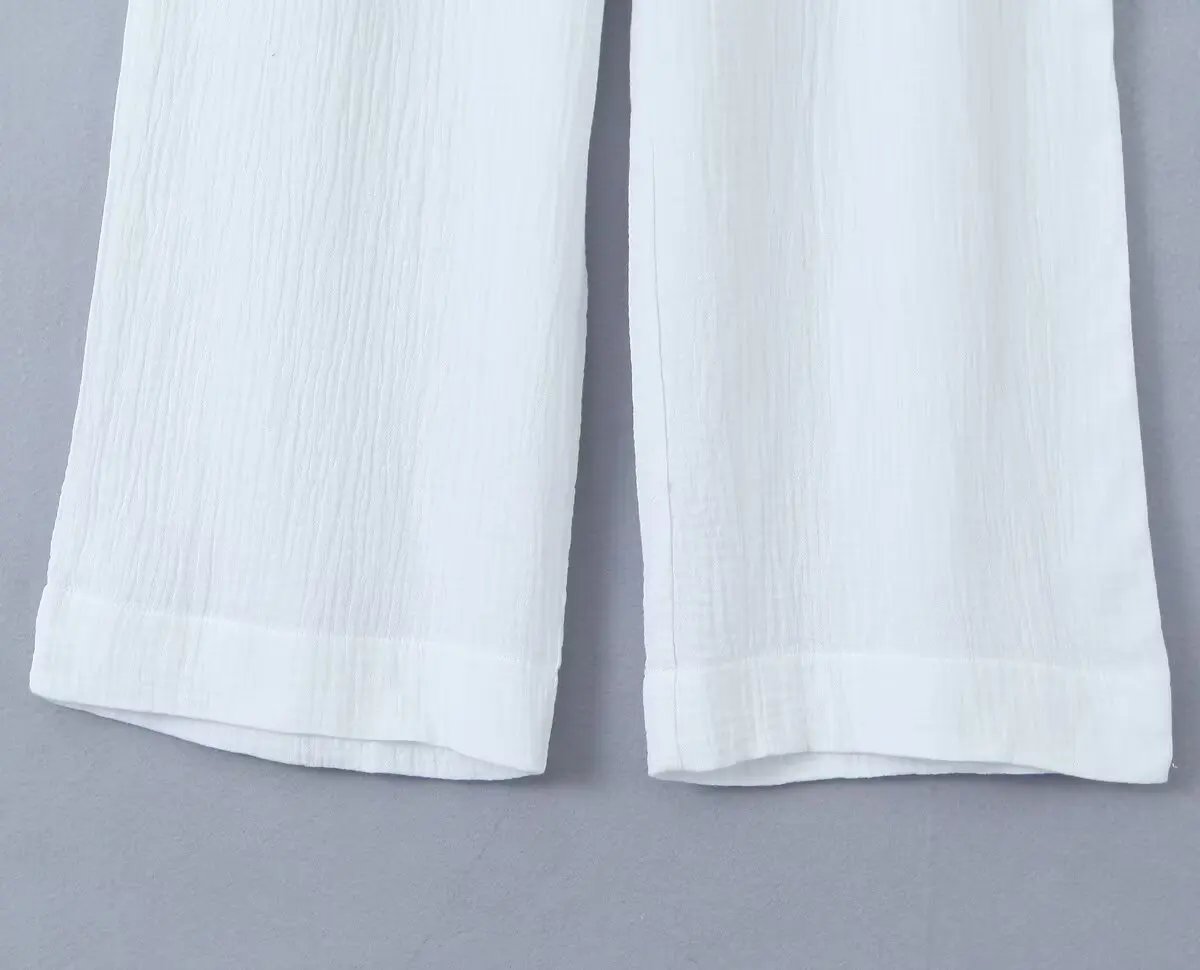 MQTIME - White Wide Leg Pants Sets 2024 New Long Sleeve Lace-up Cropped Shirt+Casual Trouser Suits Summer Fashion Holiday Two- Piece Set