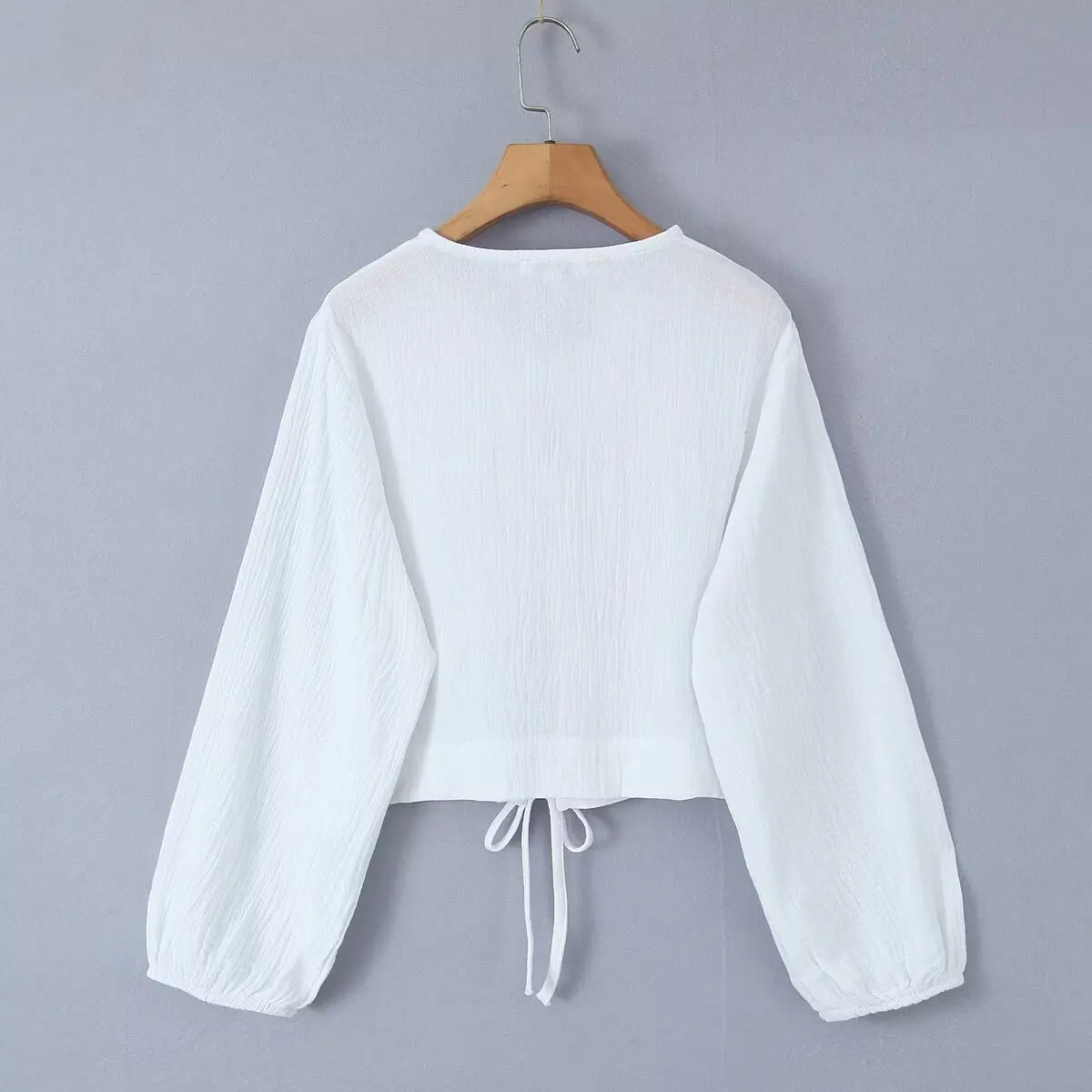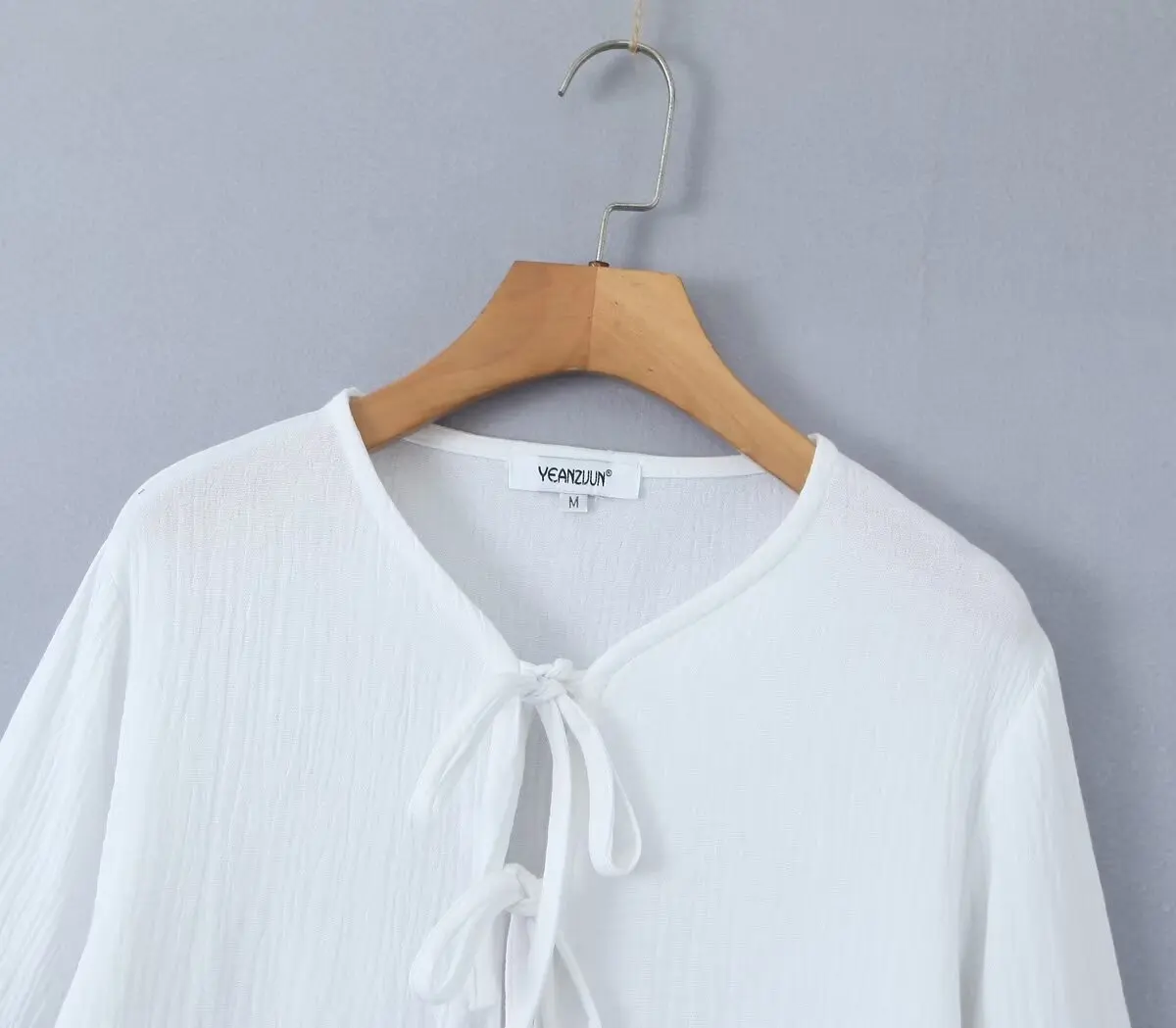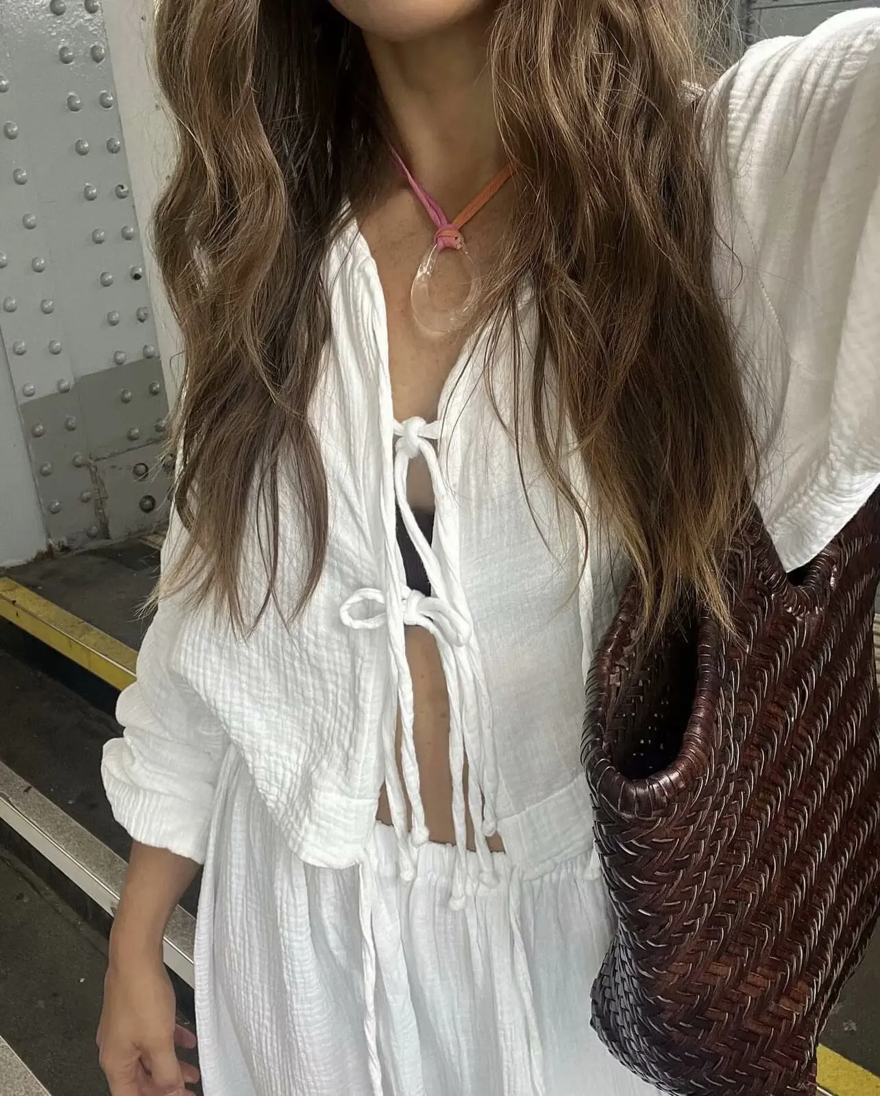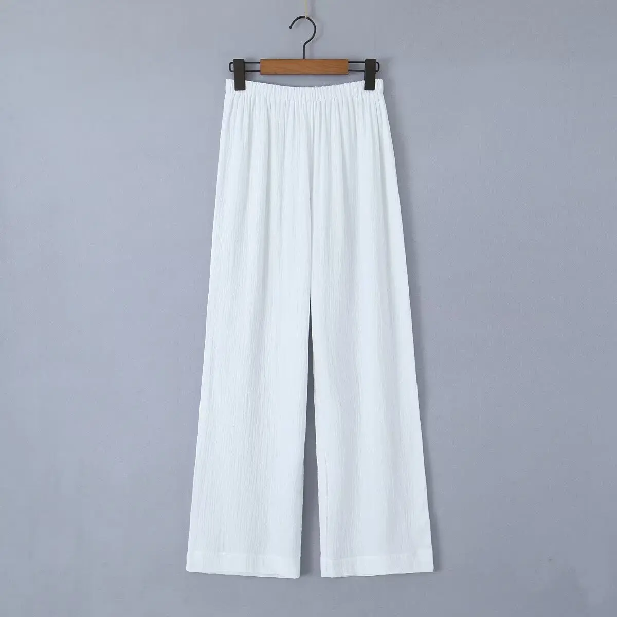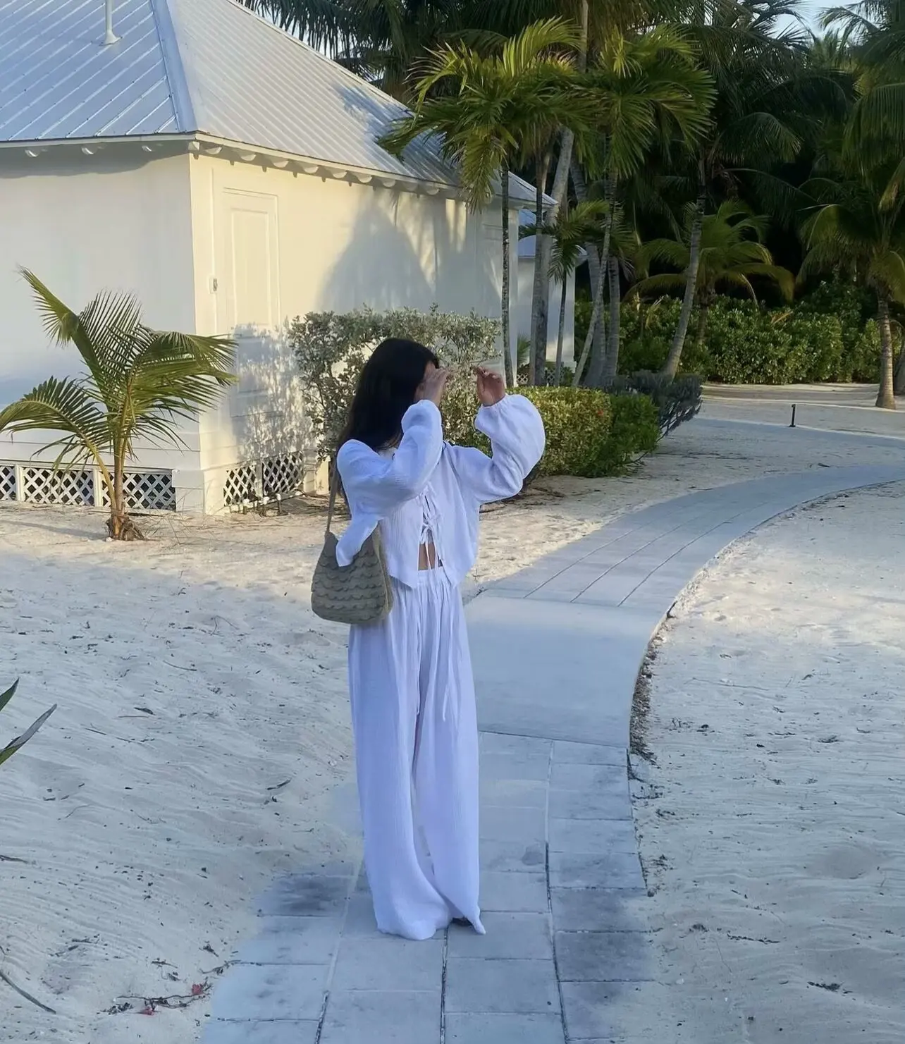 MQTIME - White Wide Leg Pants Sets 2024 New Long Sleeve Lace-up Cropped Shirt+Casual Trouser Suits Summer Fashion Holiday Two- Piece Set