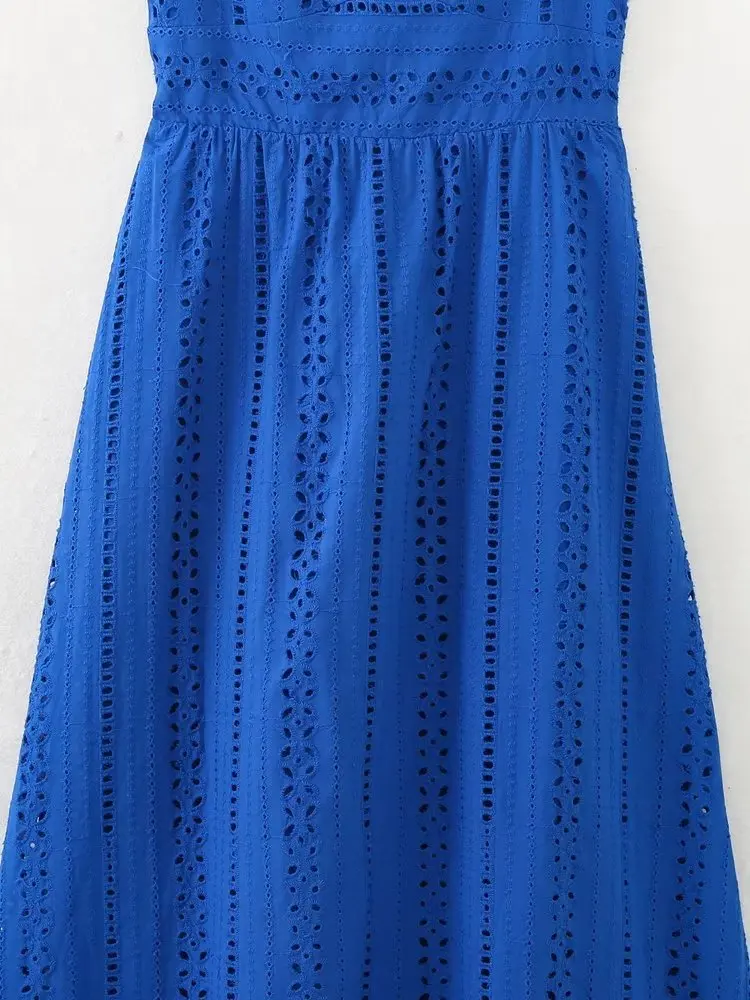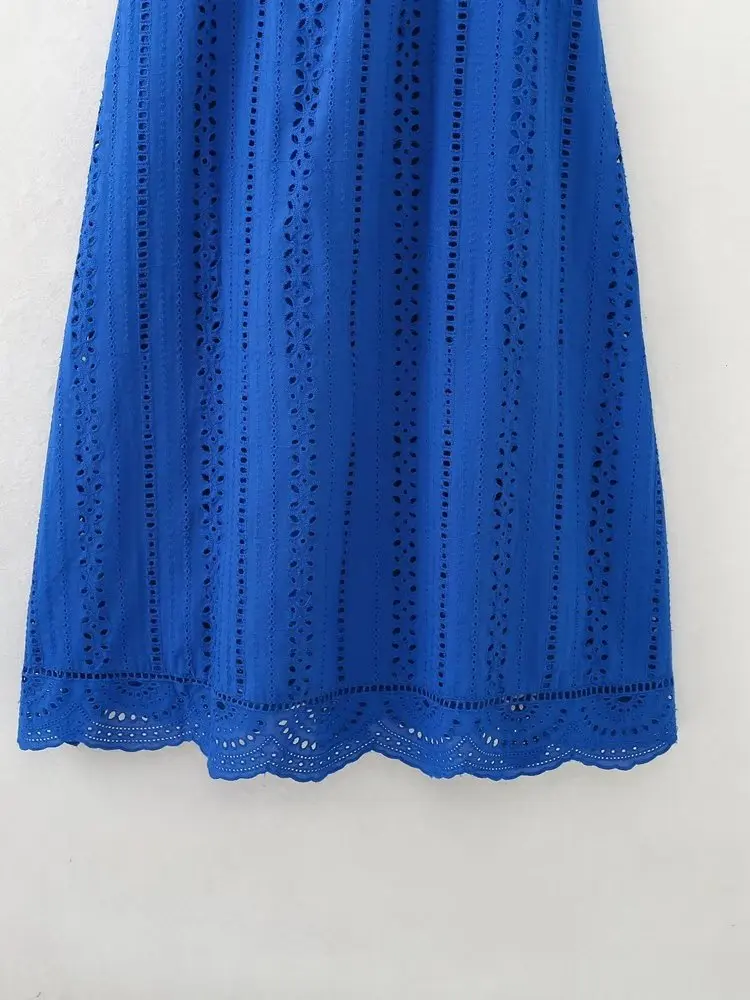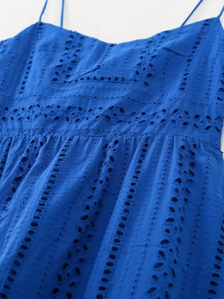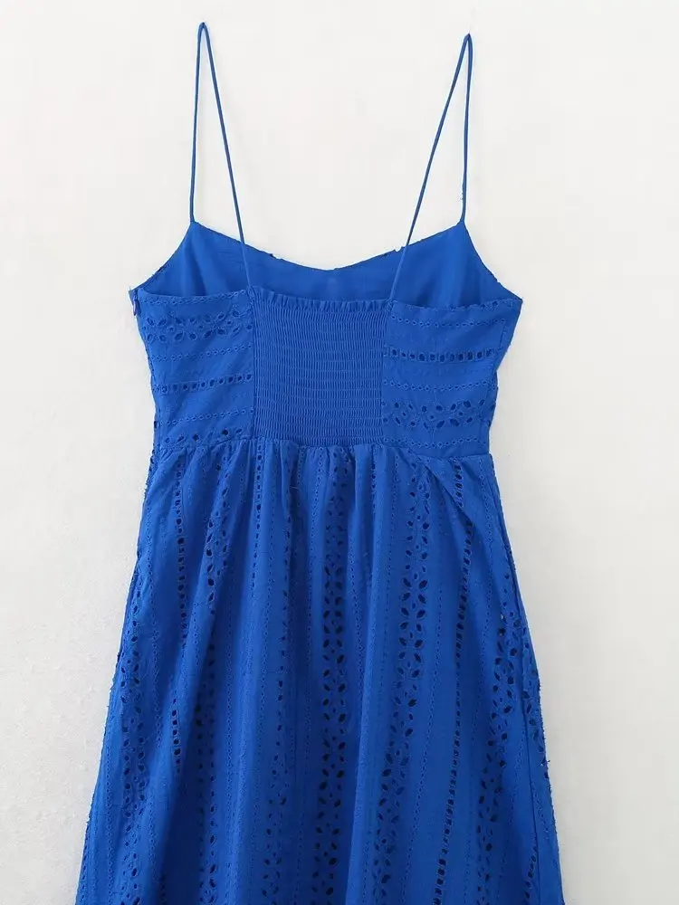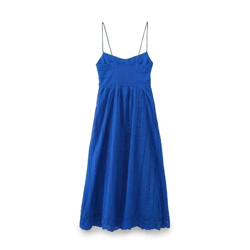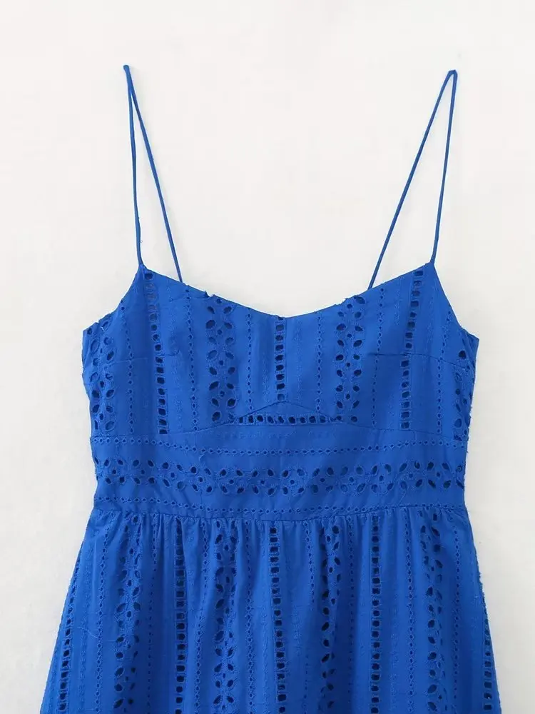 MQTIME - Woman Ocean Blue Spaghetti Strap Suspender Maxi Dress Elegant Lace Hollow Sapphire Blue Summer Dress 2024 Fashion New Lady Wear