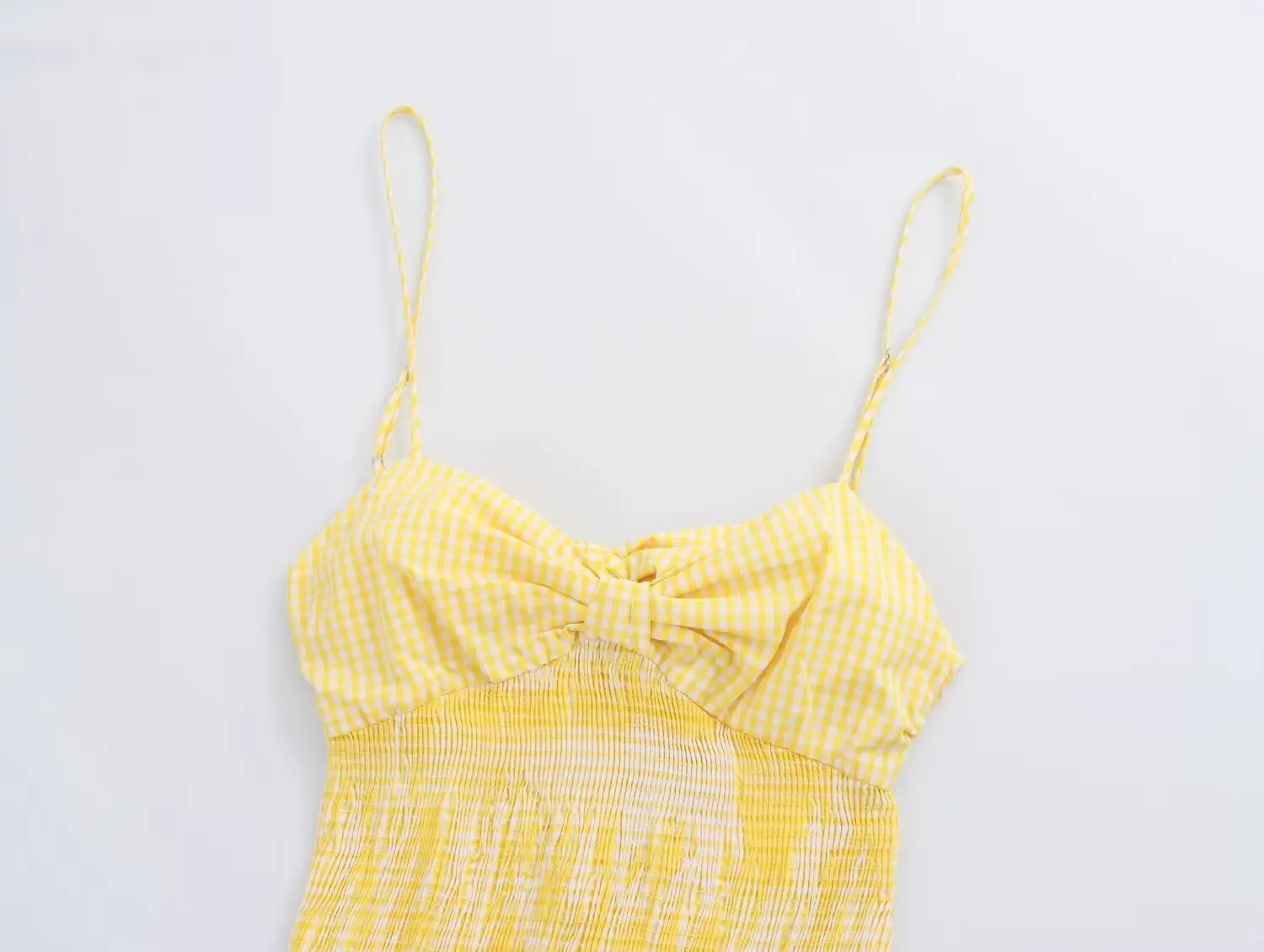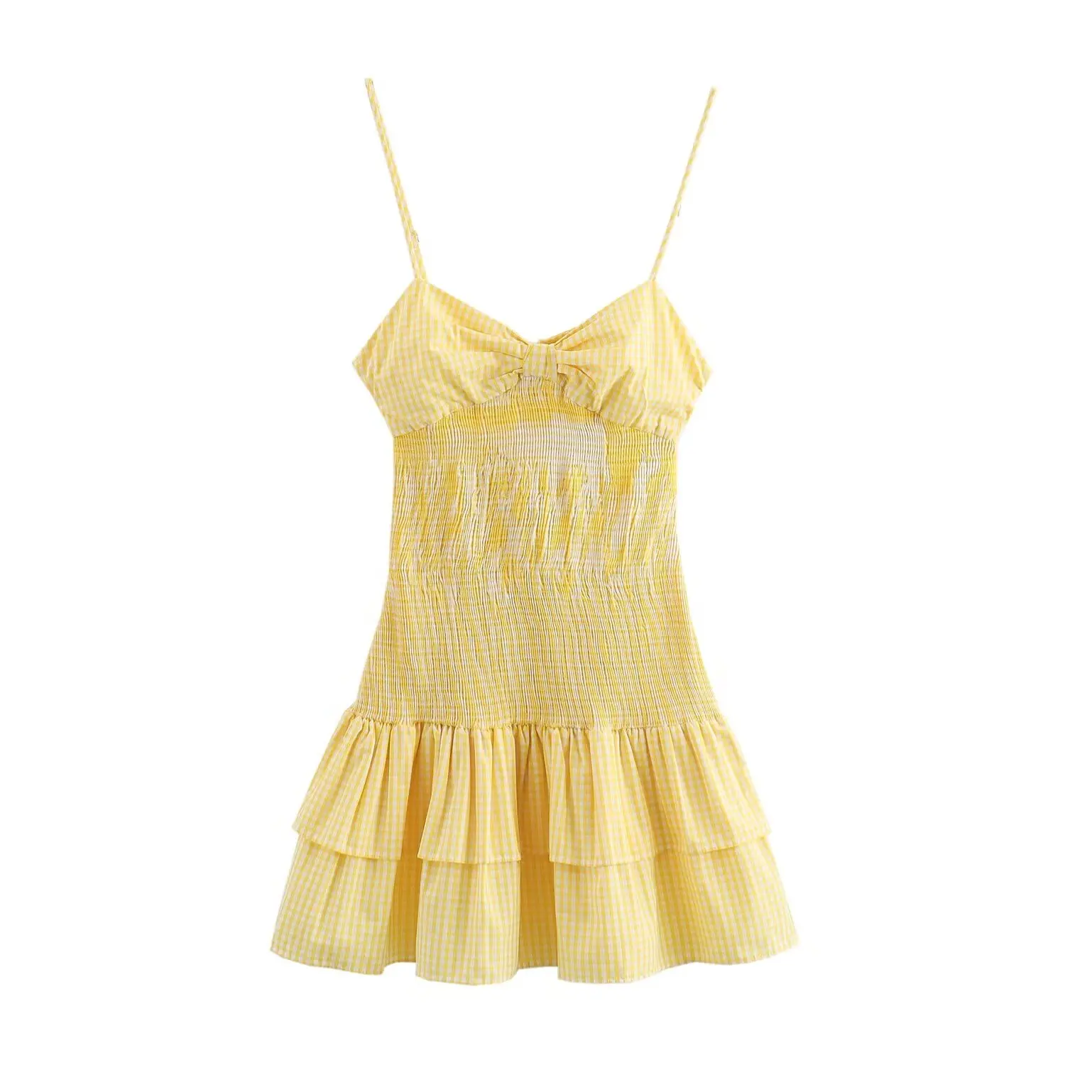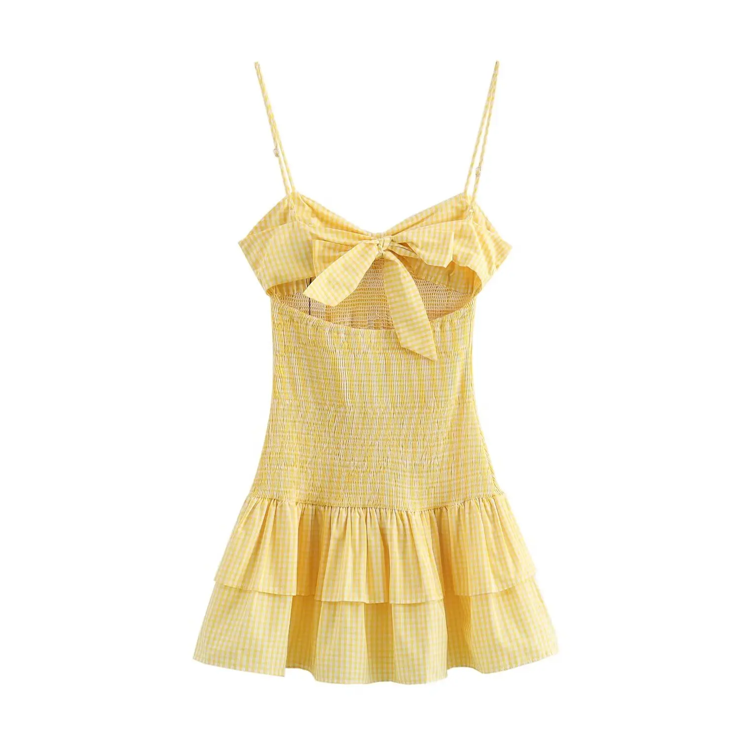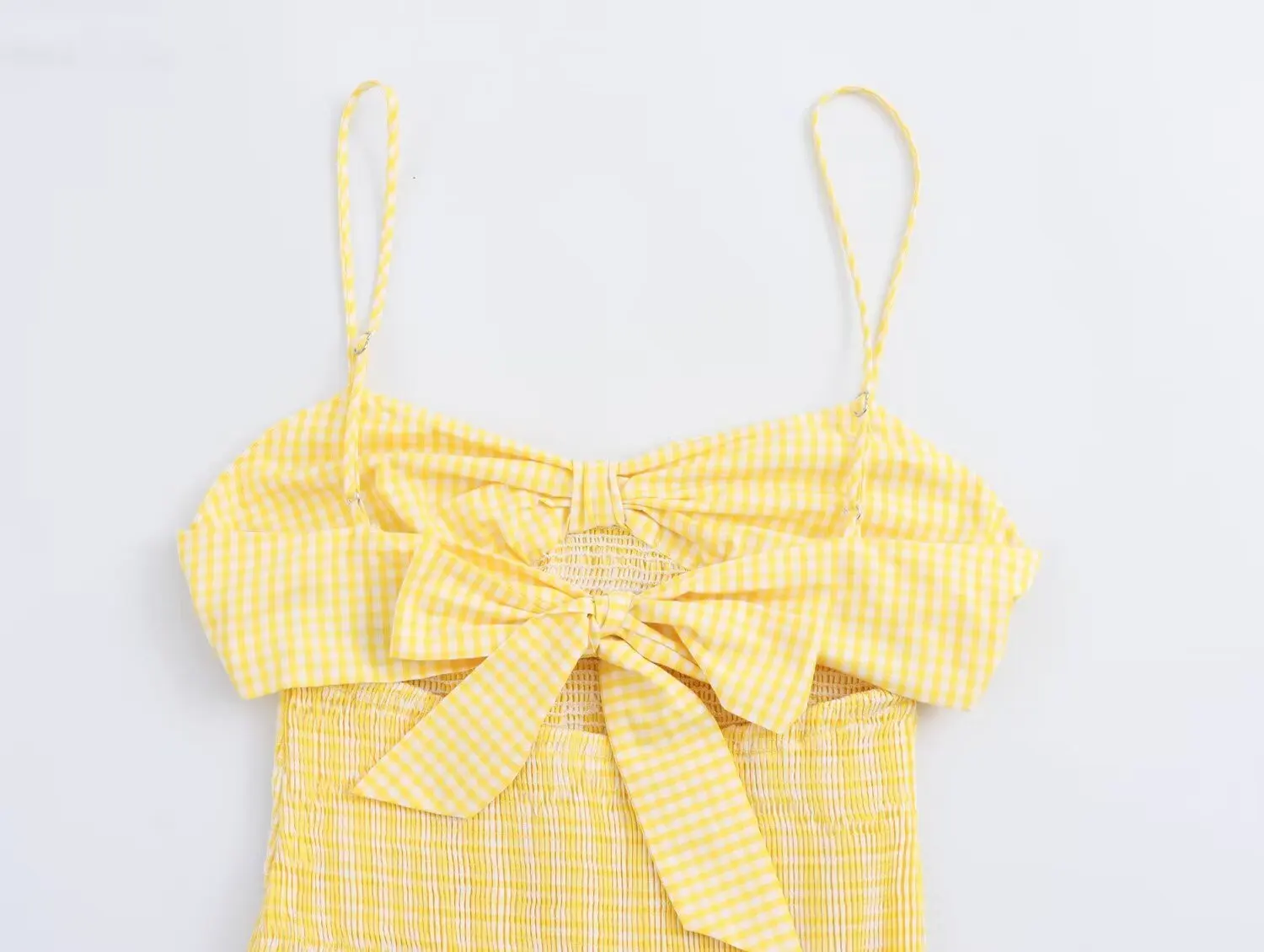MQTIME - Woman's Beach Style Sexy A-Line Dresses Yellow Plaid Sleeveless Bow Decorate Backless Summer Mini Dress Woman Trendy