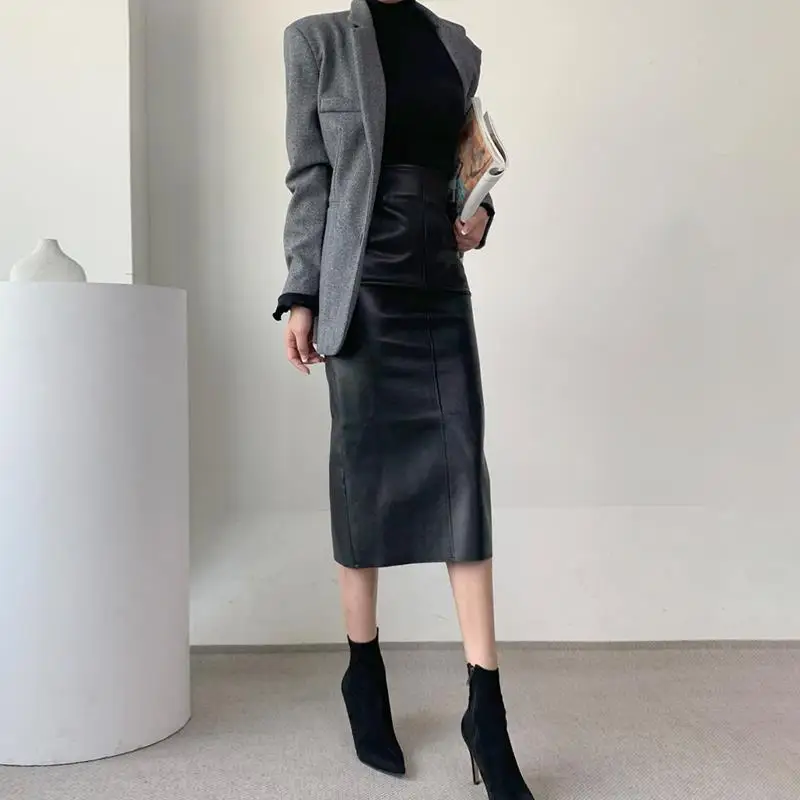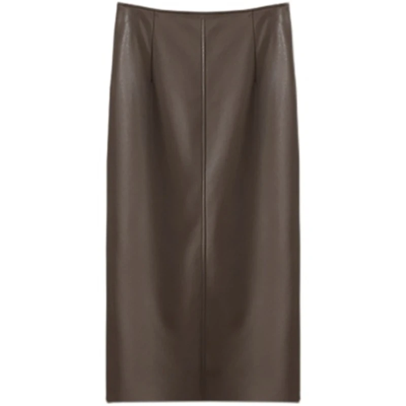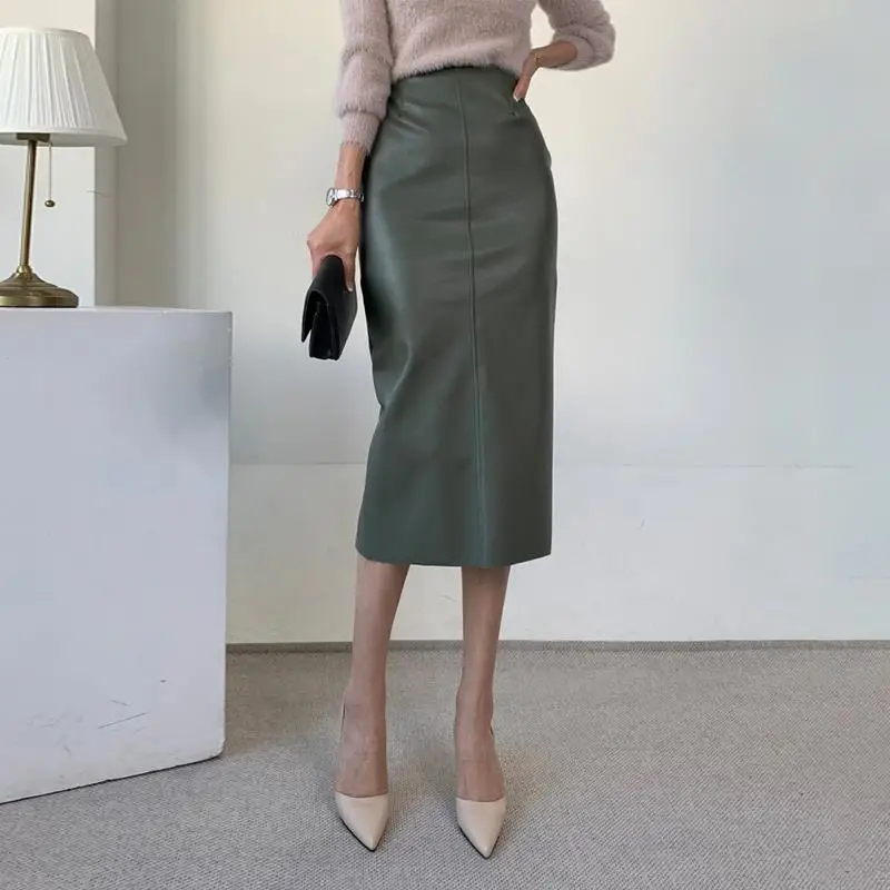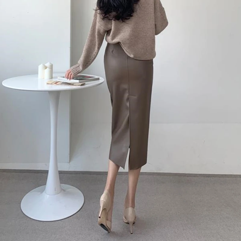 Mqtime Women 2024 Spring Streetwear Solid Split PU Leather Skirt Fashion High Waist Slim Female Straight Faux Leather Skirt