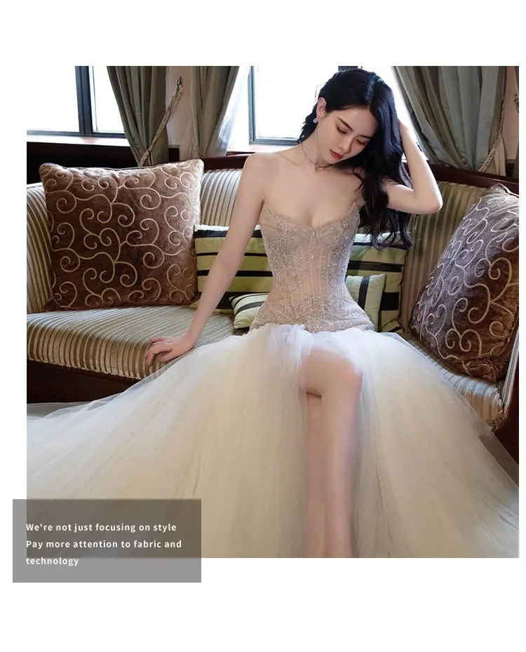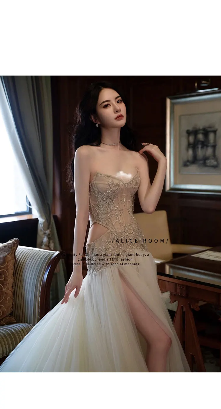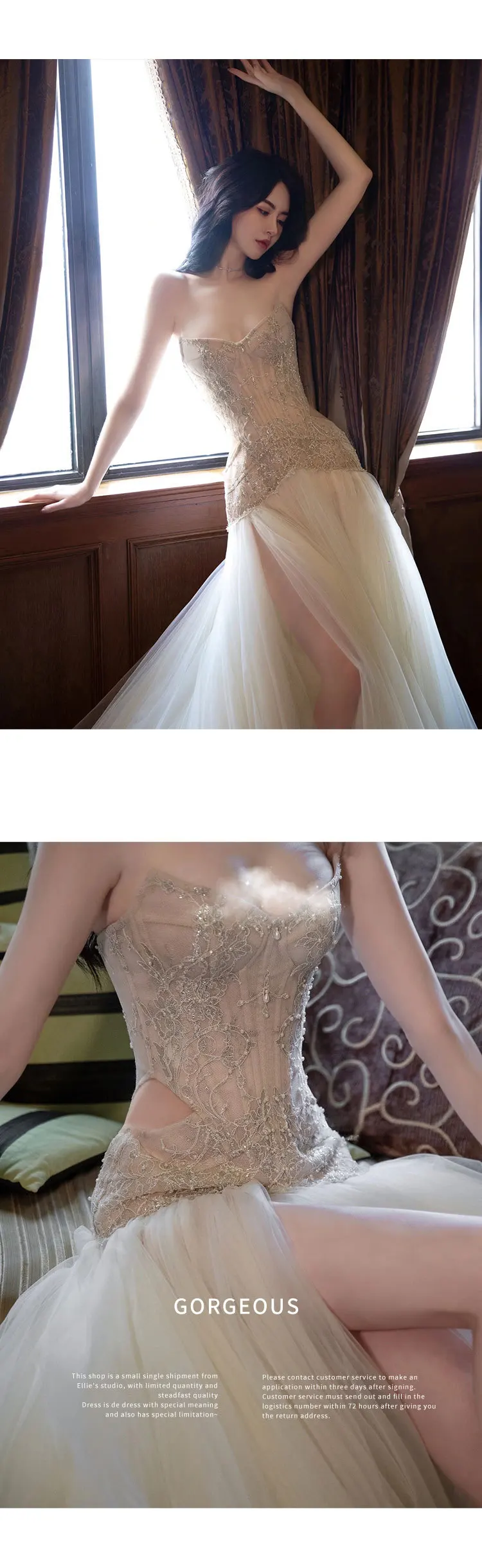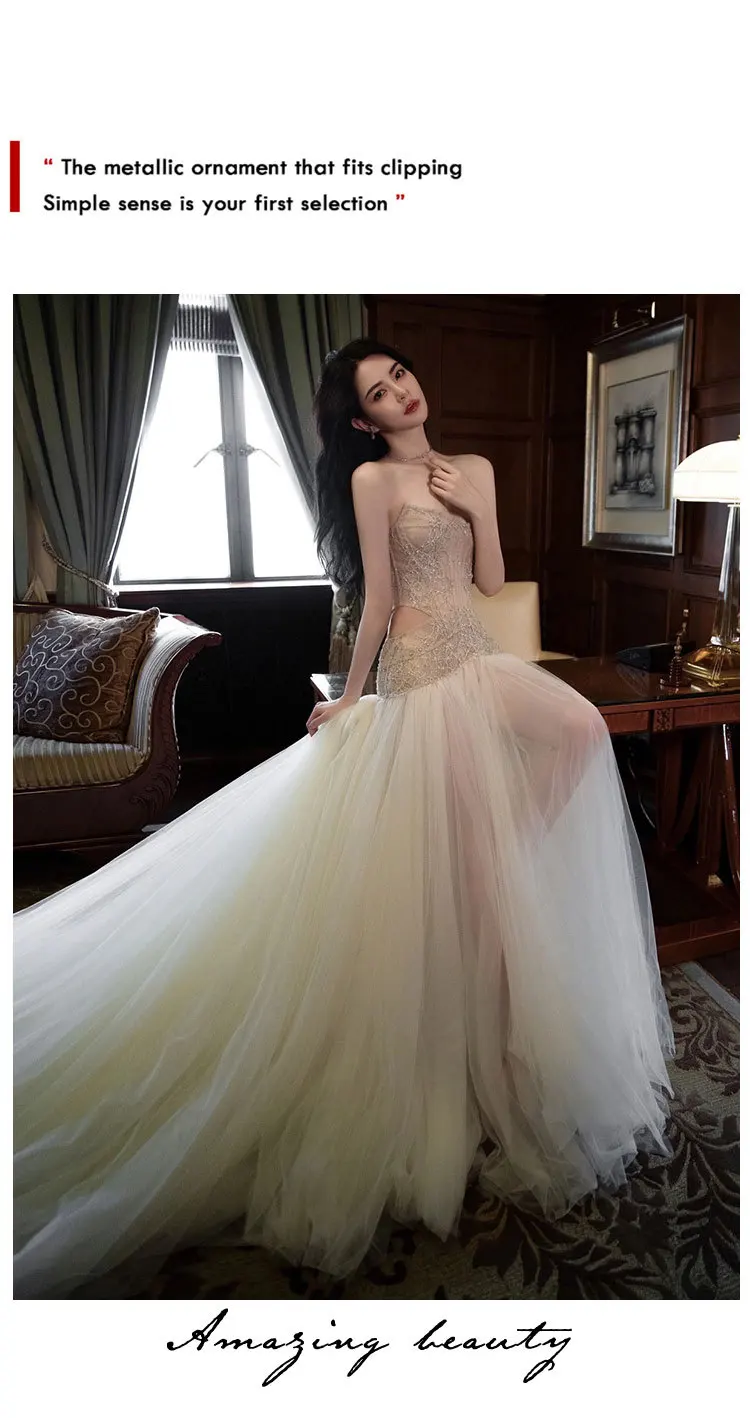 MQTIME  -  Women Chamapgne High Split A-line Tailing Tulle Toast Clothing Fairy Tube Top Banquet Evening Dress