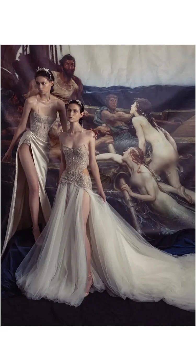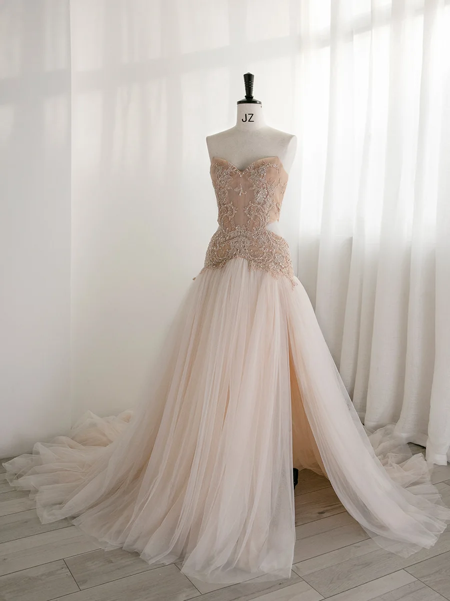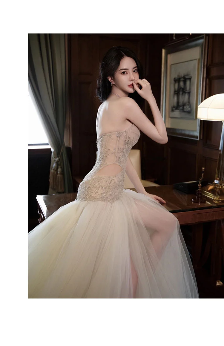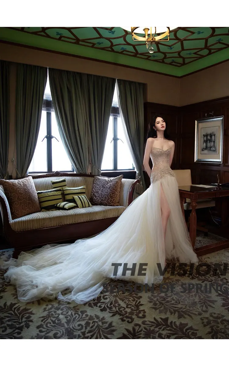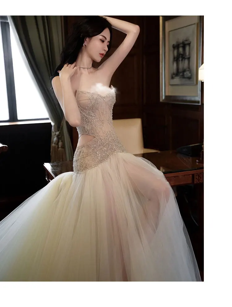 MQTIME  -  Women Chamapgne High Split A-line Tailing Tulle Toast Clothing Fairy Tube Top Banquet Evening Dress