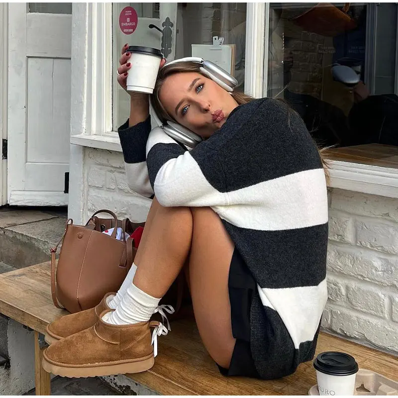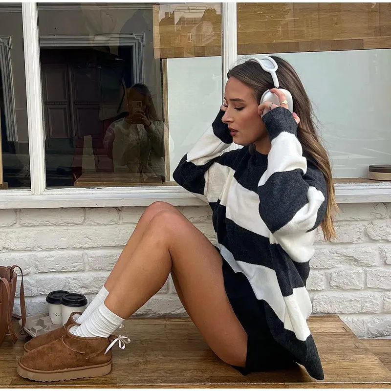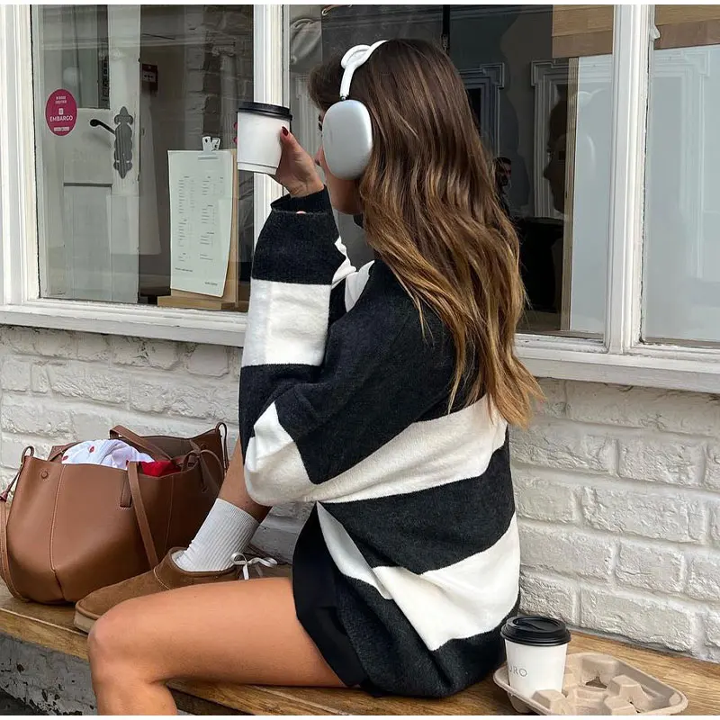 Mqtime Women Chic Striped Knitted Pullover Autumn Winter Patchwork Long Sleeve Casual Jumper Top Female Fashion Streetwear Sweater