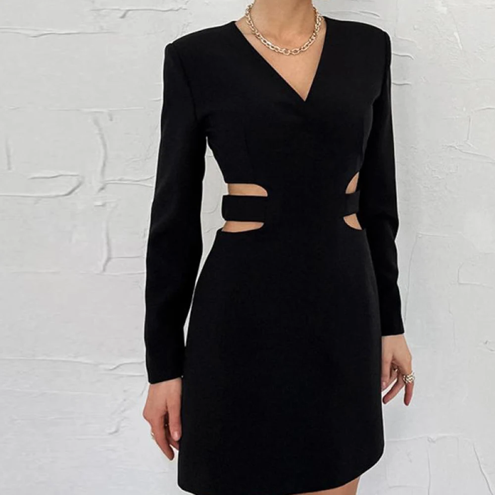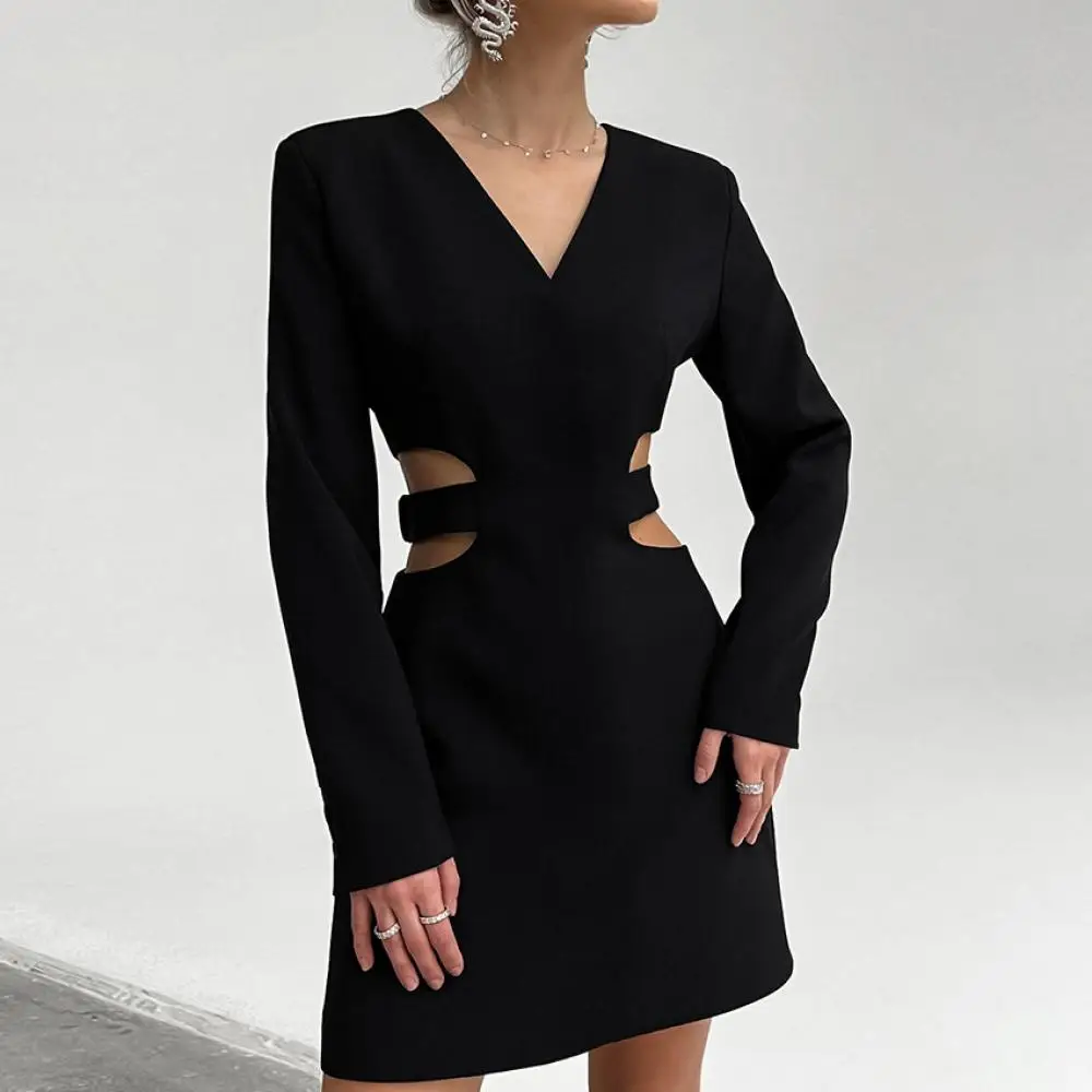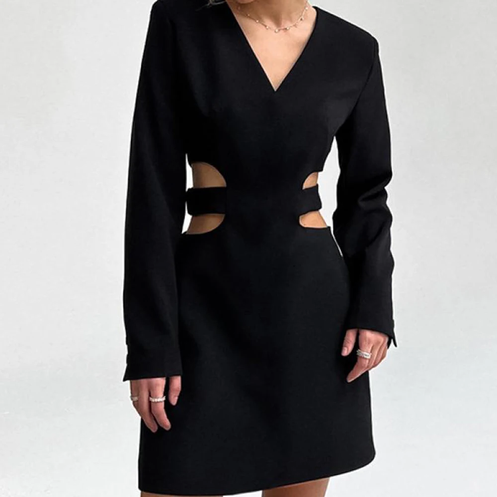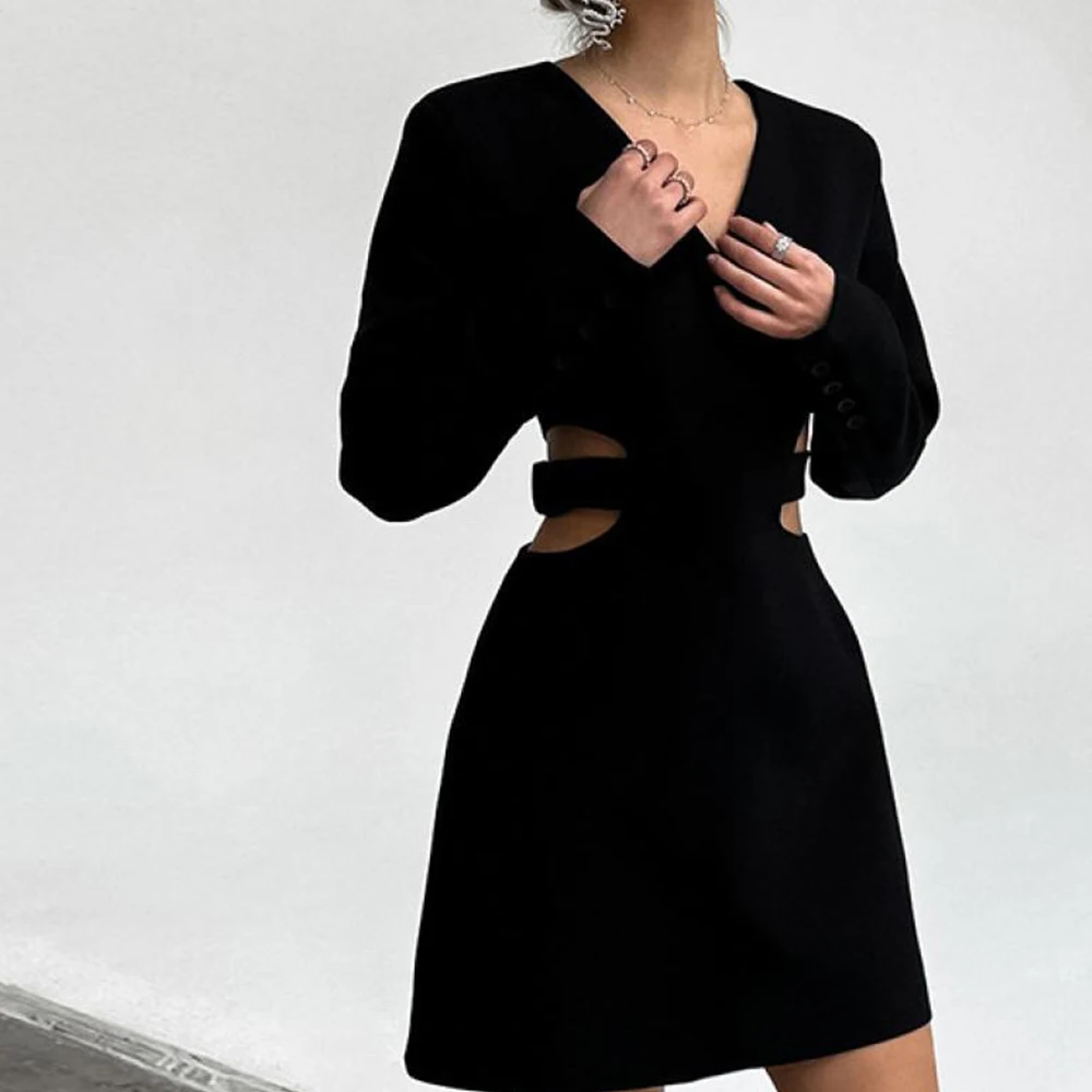 MQTIME - Women Sexy V Neck Cutout Dress Casual Long Sleeve Thigh Maxi Dress Sexy Wrap High Waisted Short Skirt High Street Clothes