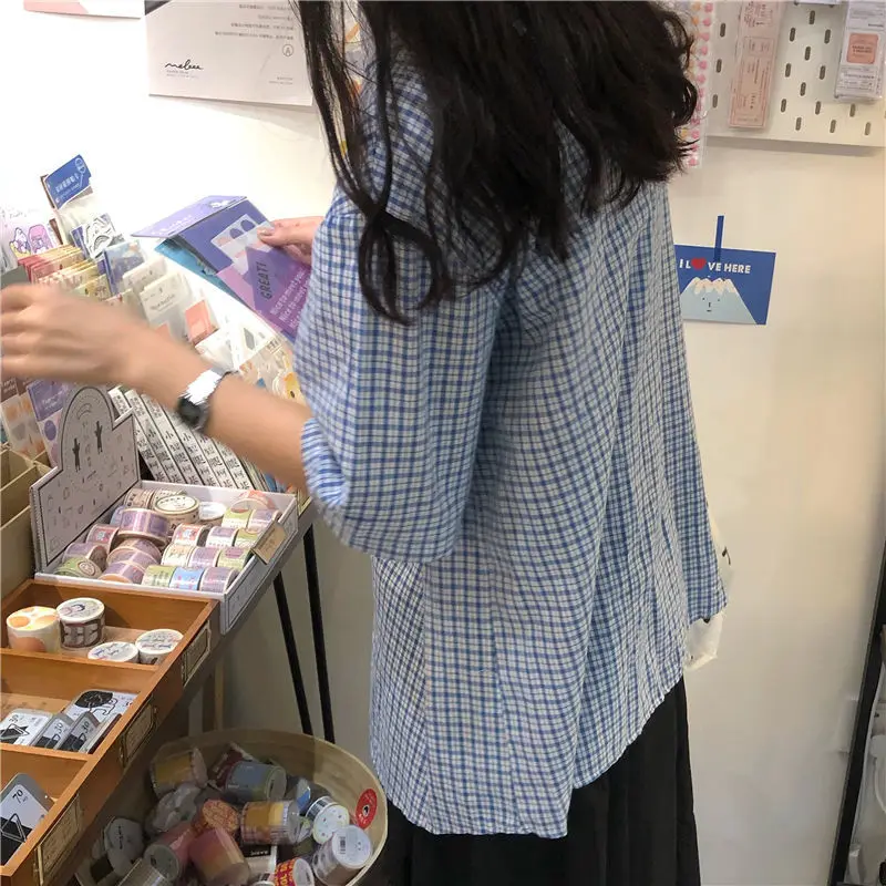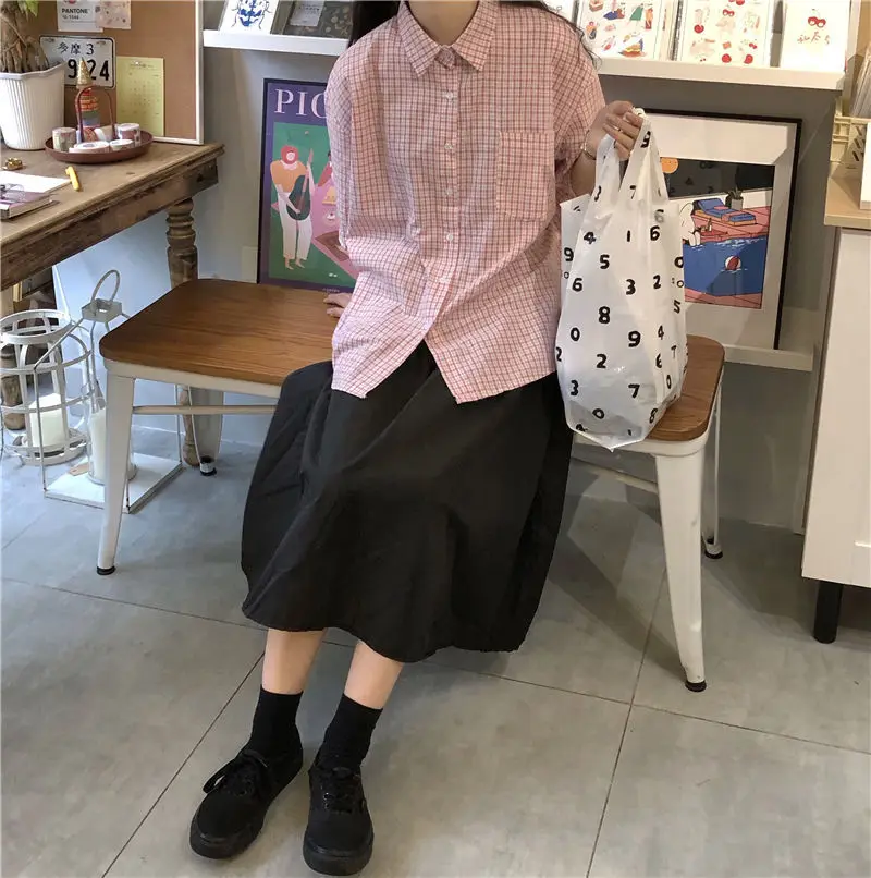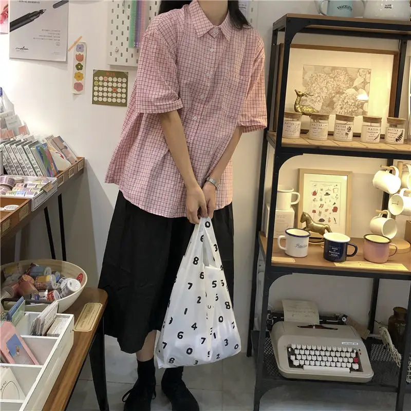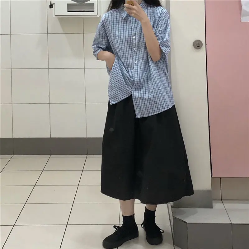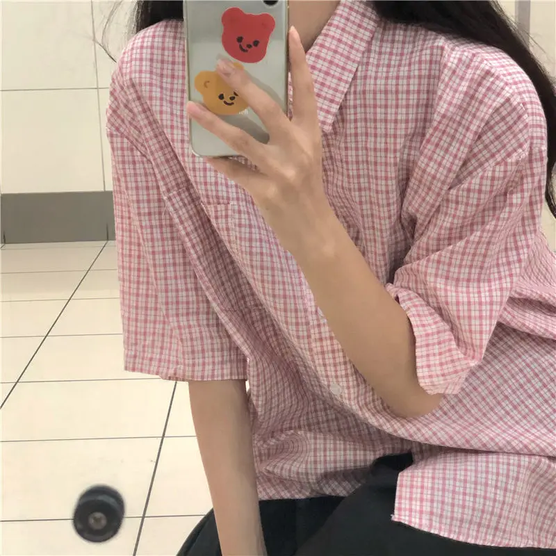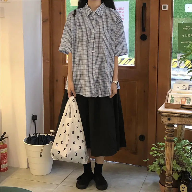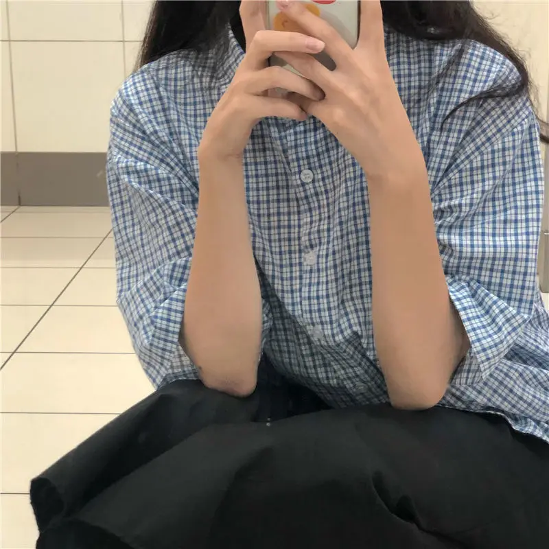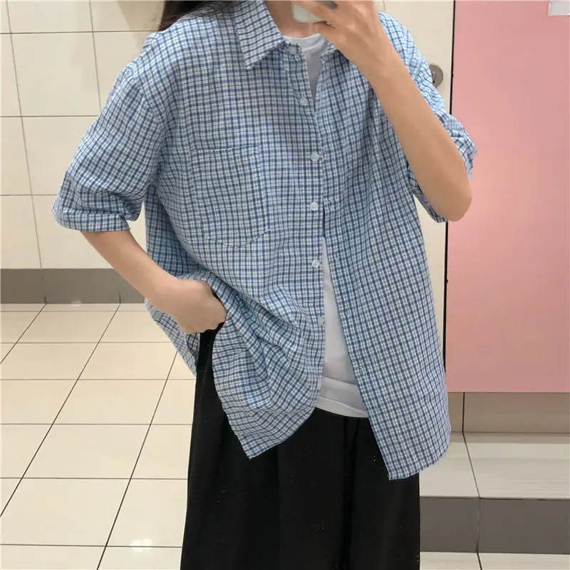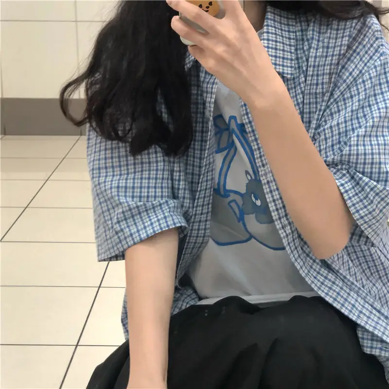 MQTIME - women summer casual plaid short sleeve blouse female oversize Japanese sweet botton shirts lady