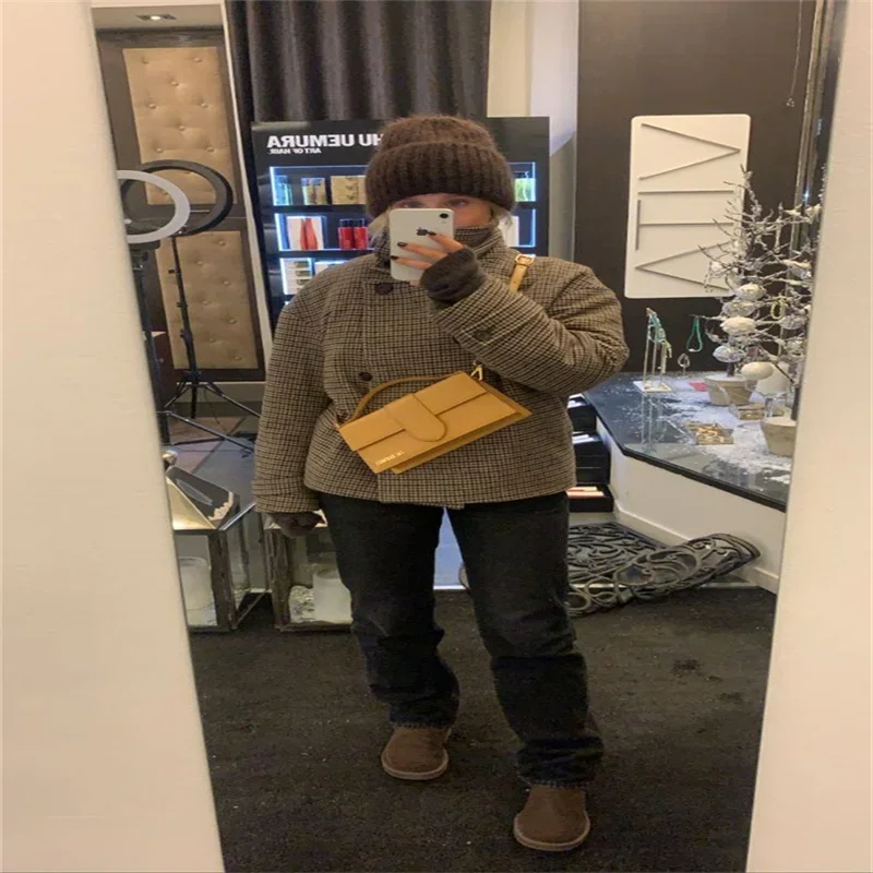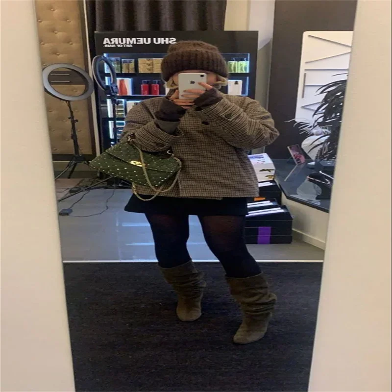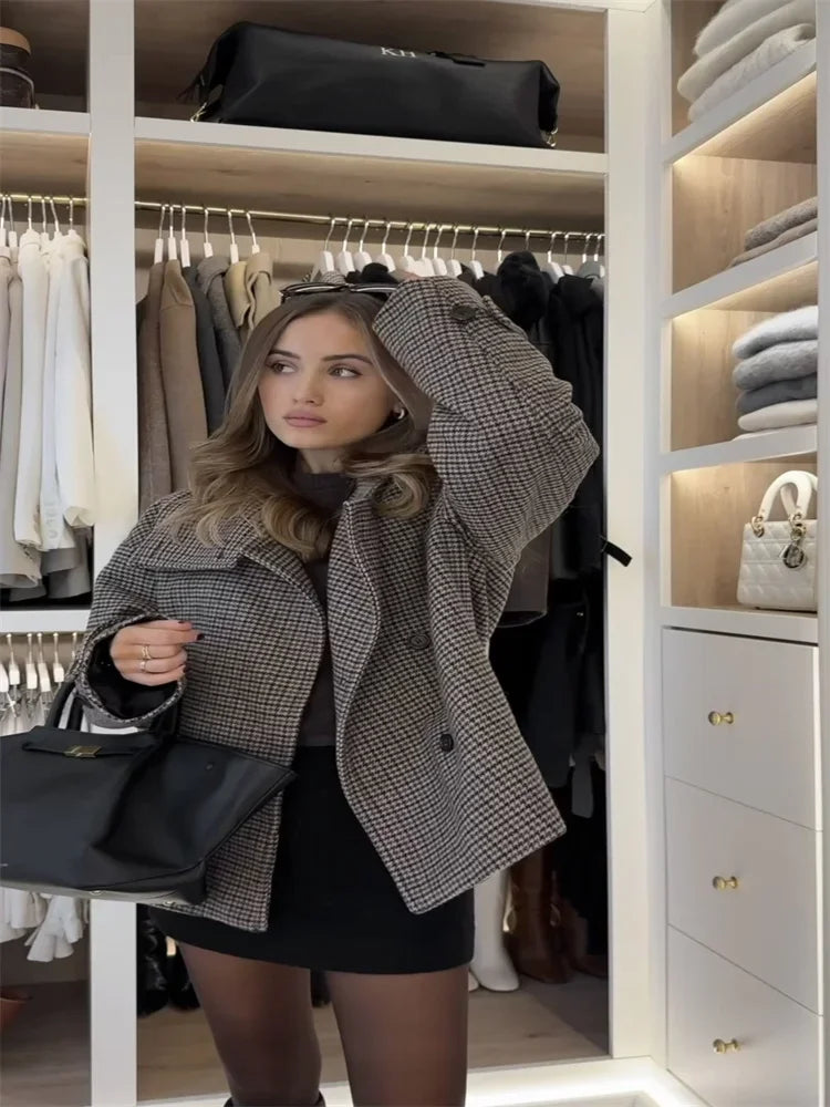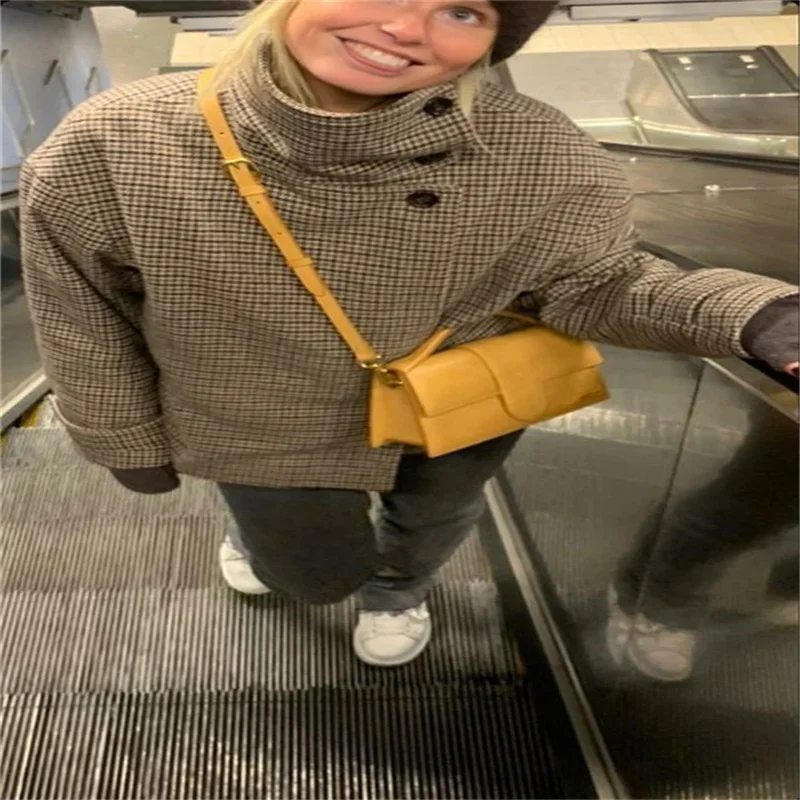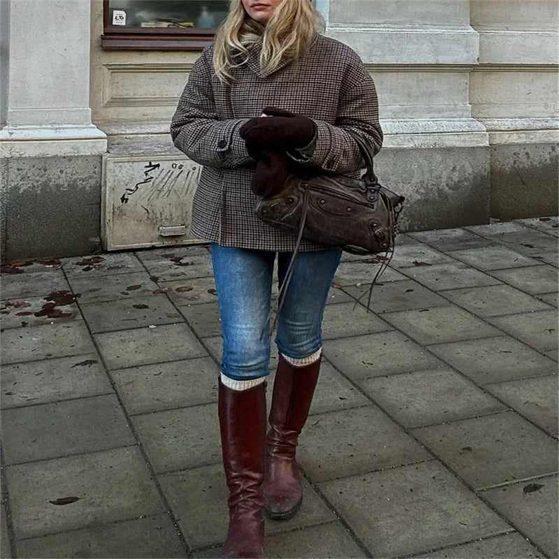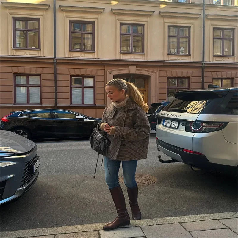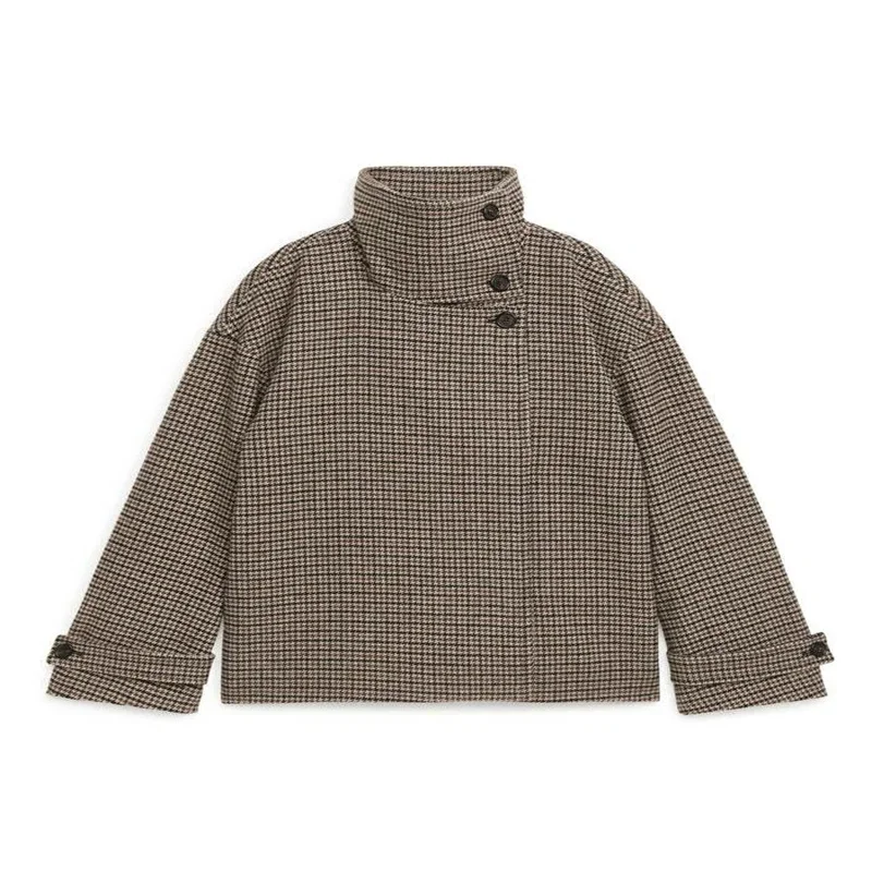 MQTIME - Women's Brown Plaid Print Stand Collar Asymmetric Button Front Jacket With Long Sleeves Casual Outerwear 2025 Autumn Lady Coat