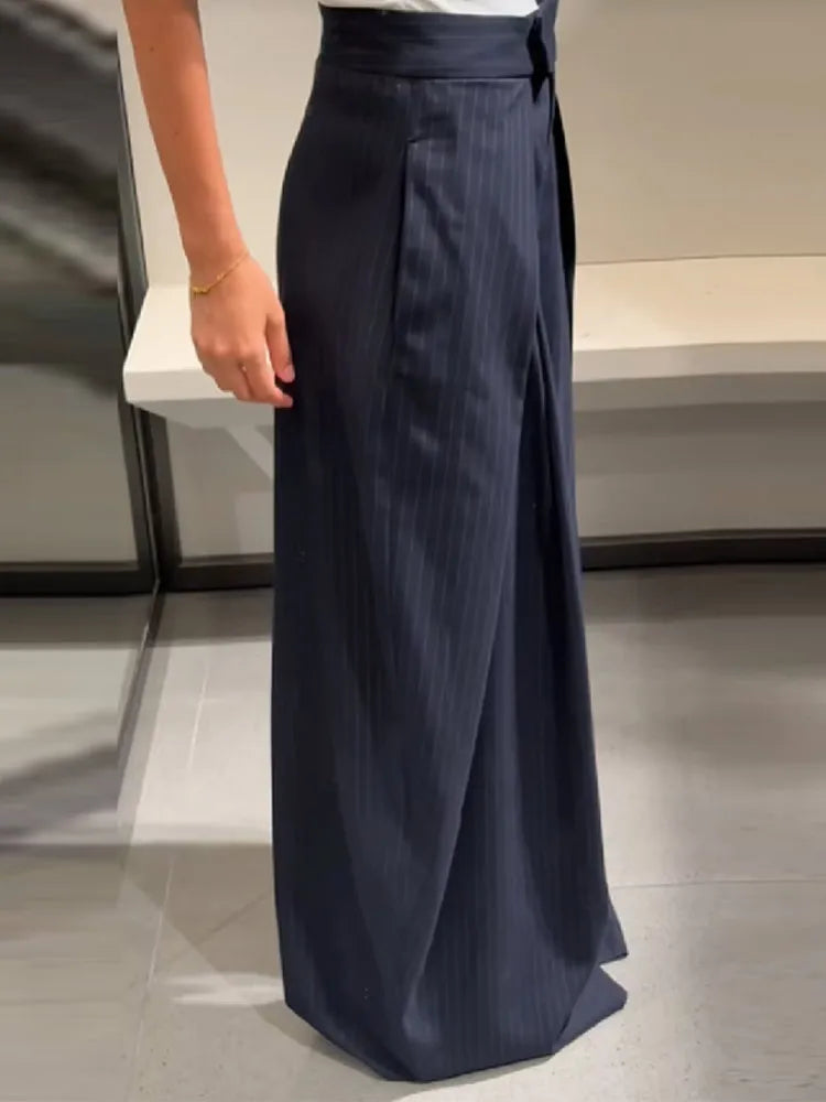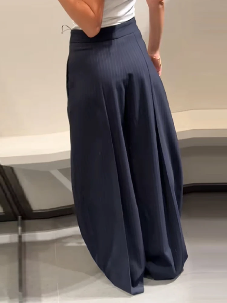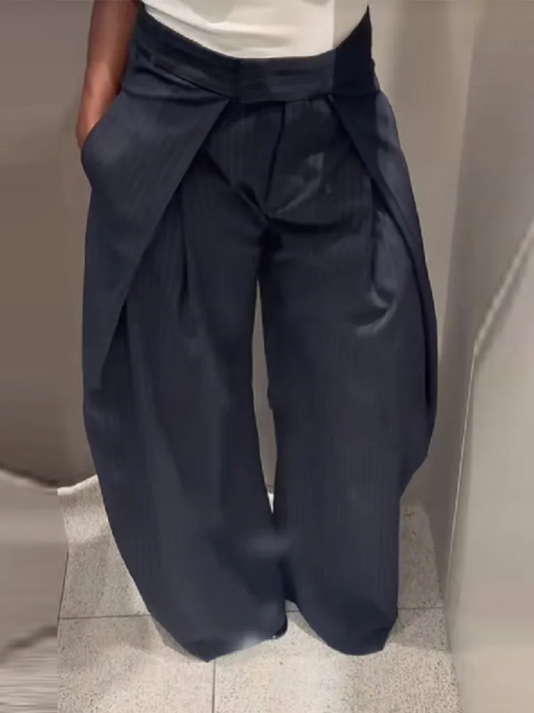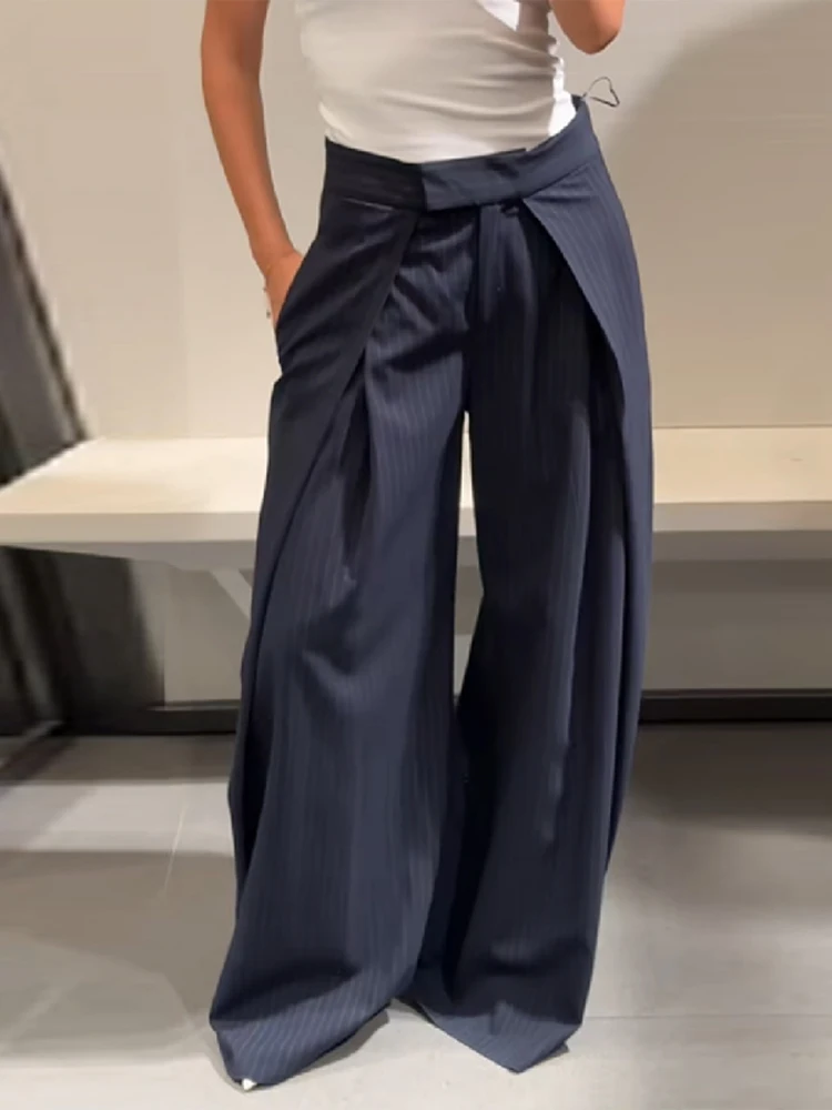 MQTIME - Women's Casual Spliced Long Trouser Baggy High Waist Pockets Denim Striped Trousers 2025 New Autumn Lady Street All-match Pants