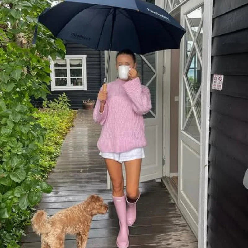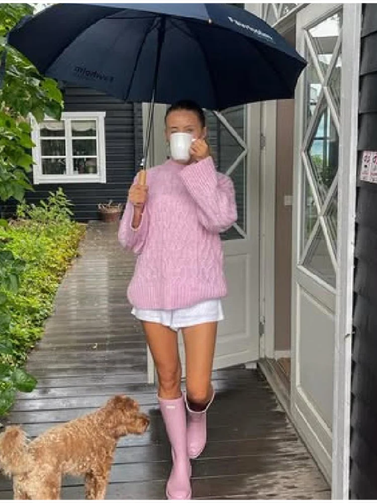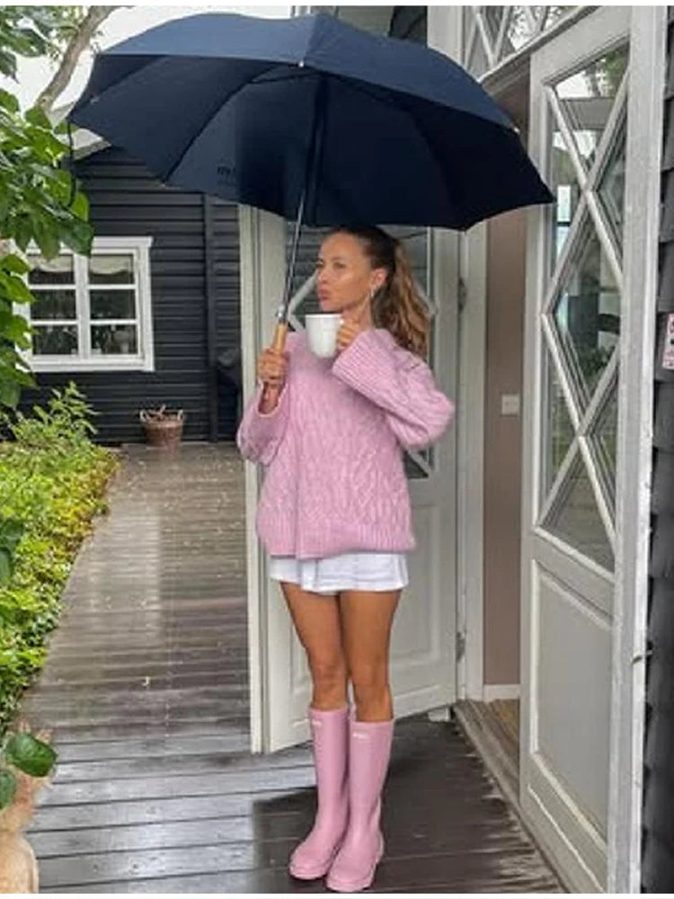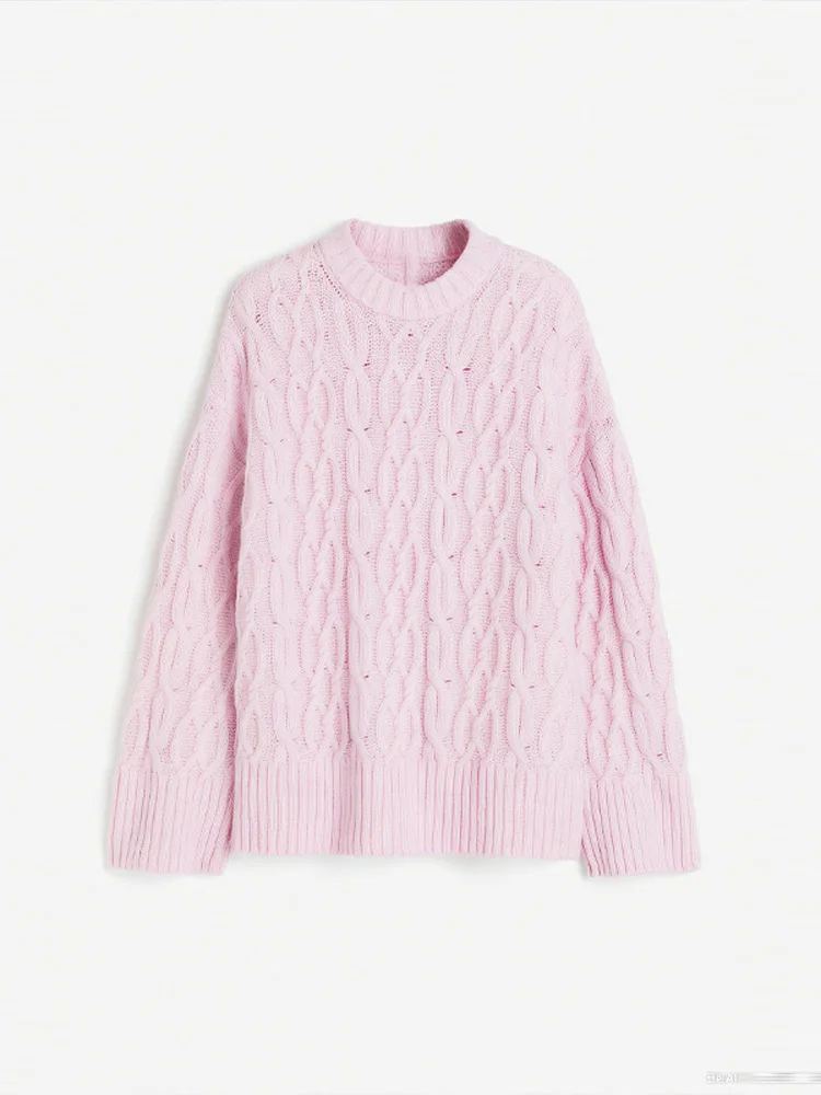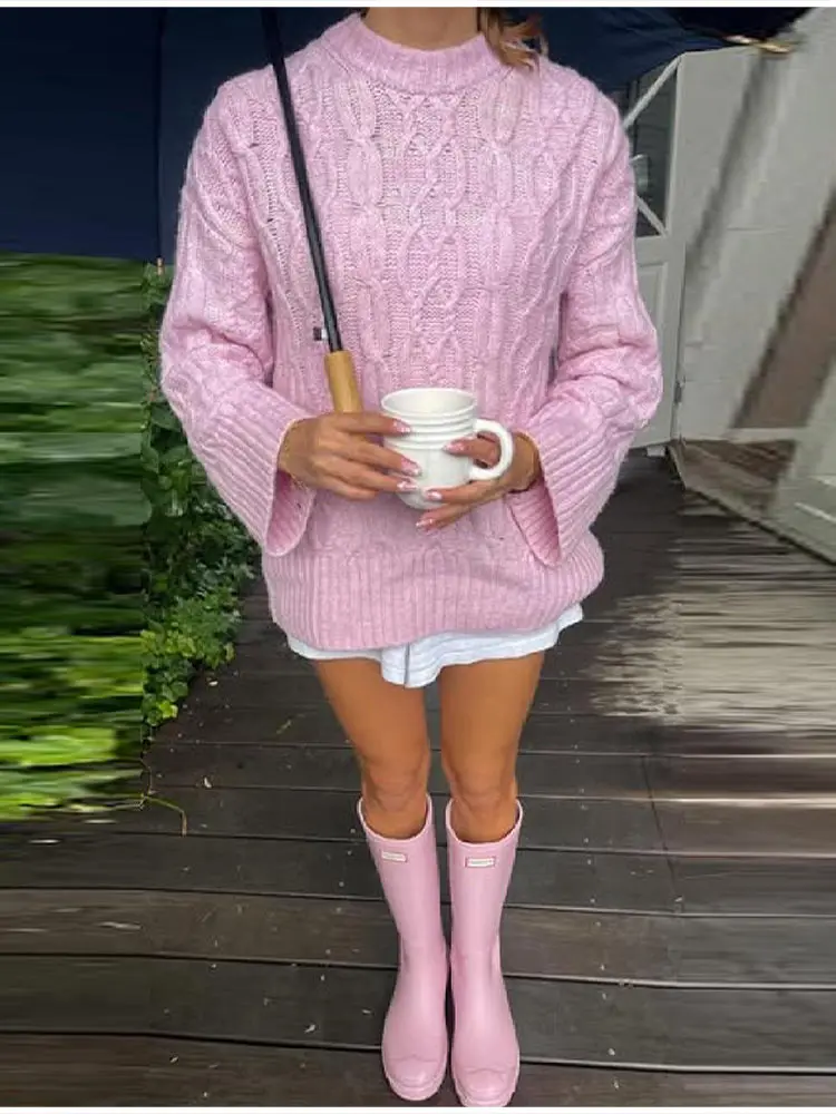 MQTIME - Women's Chic Sweet Pink O Neck Sweater Casual Loose Soft Comfortable Jacquard Long Sleeves 2025 Lady Autumn Winter Y2K Outwears