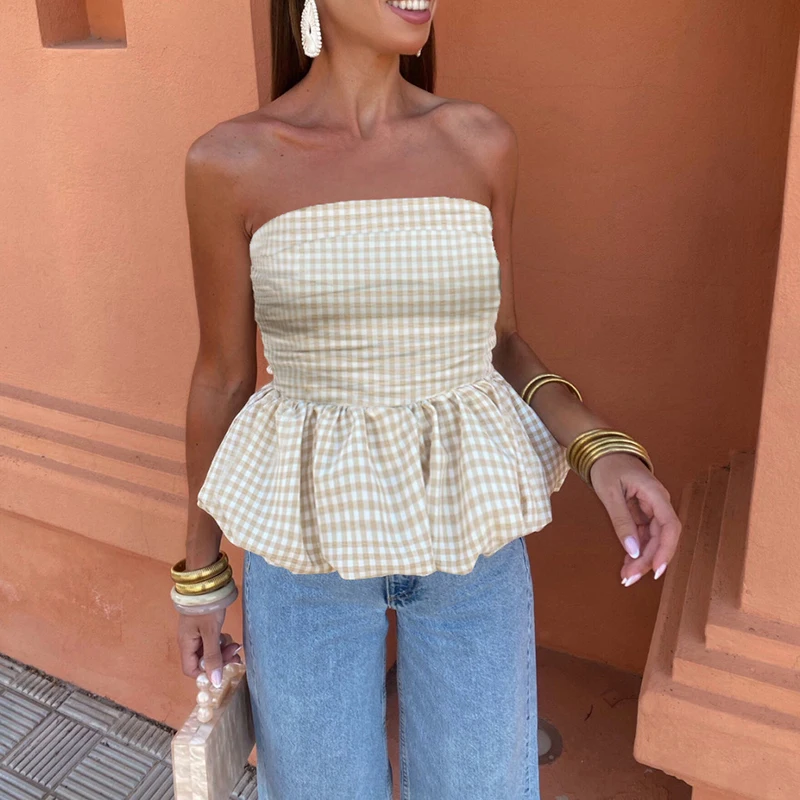 MQTIME - Women's Sexy Off Shoulder Pleated Club Party Shirt Elegant Plaid Strapless Slim Blouses Fashion Lady Slash Neck Fluffy Short Top