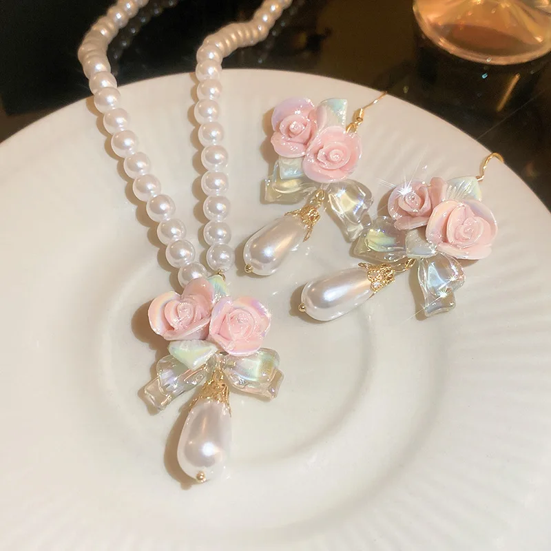 MQTIME -  Women's Trendy Imitated Pearl Beaded Necklace Exquisite Waterdrop Pendant Earring Romantic Flower Earrings Bowknot Jewelry Sets