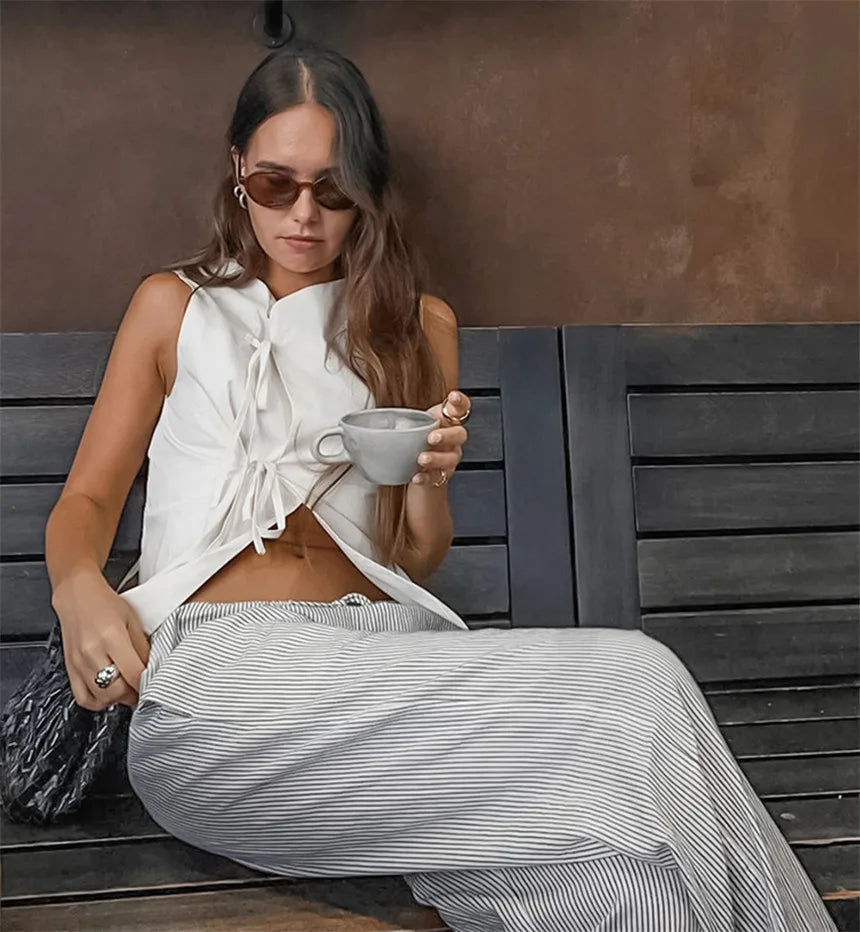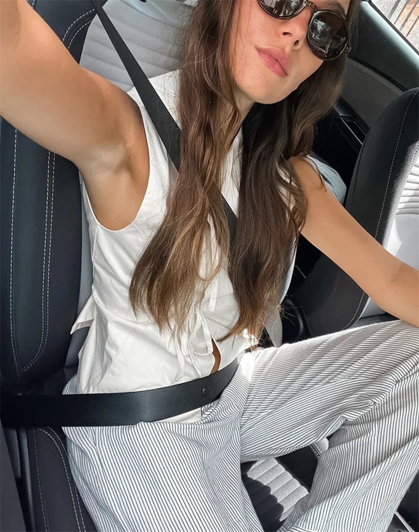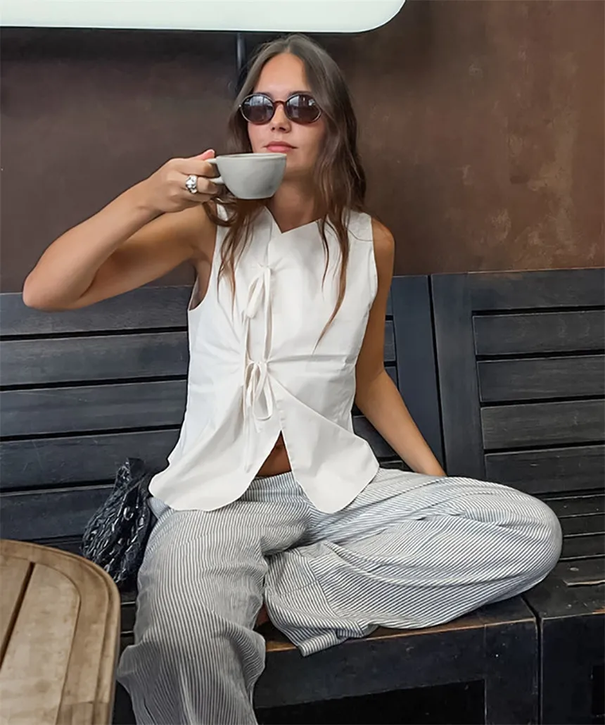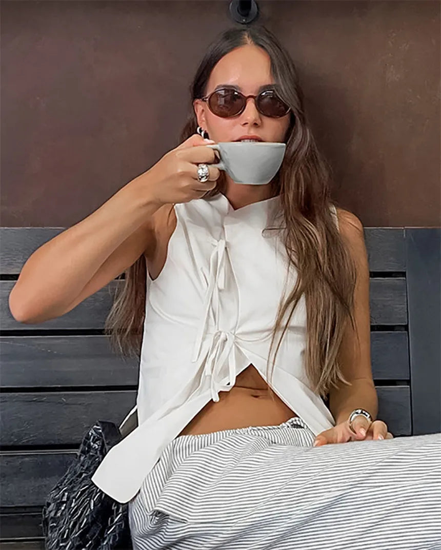 MQTIME - Women's White Hollow Bandage Vest Top Sexy Slim Sleeveless Vest Fashion Lace-up Patchwork 2025 Summer Beach Vacation Vest Top