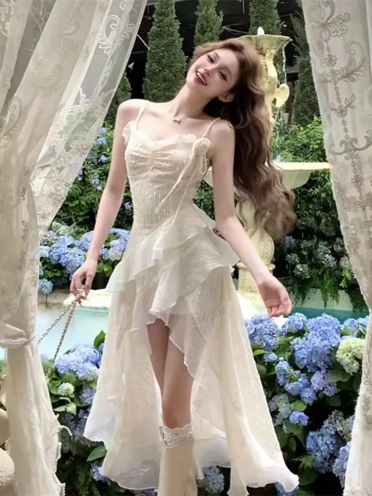 MQTIME - Y2K Ruffles Spaghetti Strap Irregular Midi Dress Women Summer New Slim Fairycore Birthday Party Dress Prom Robe Vestidos Mujer
