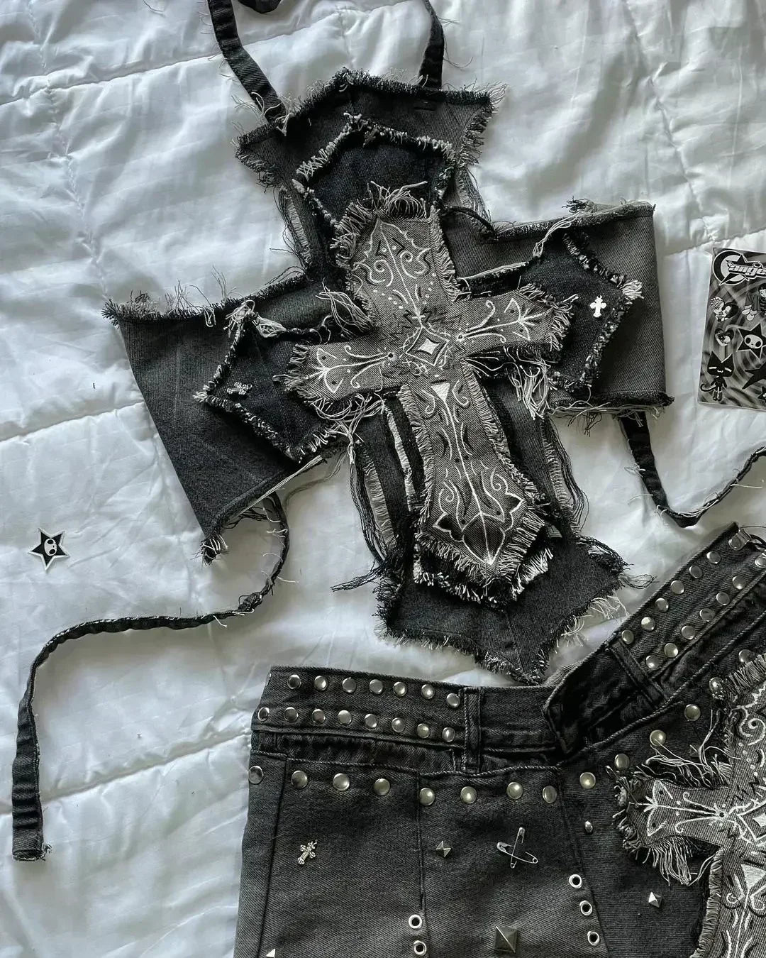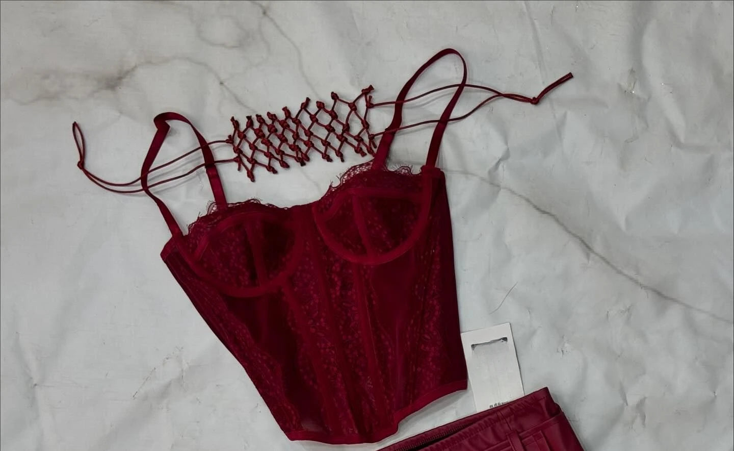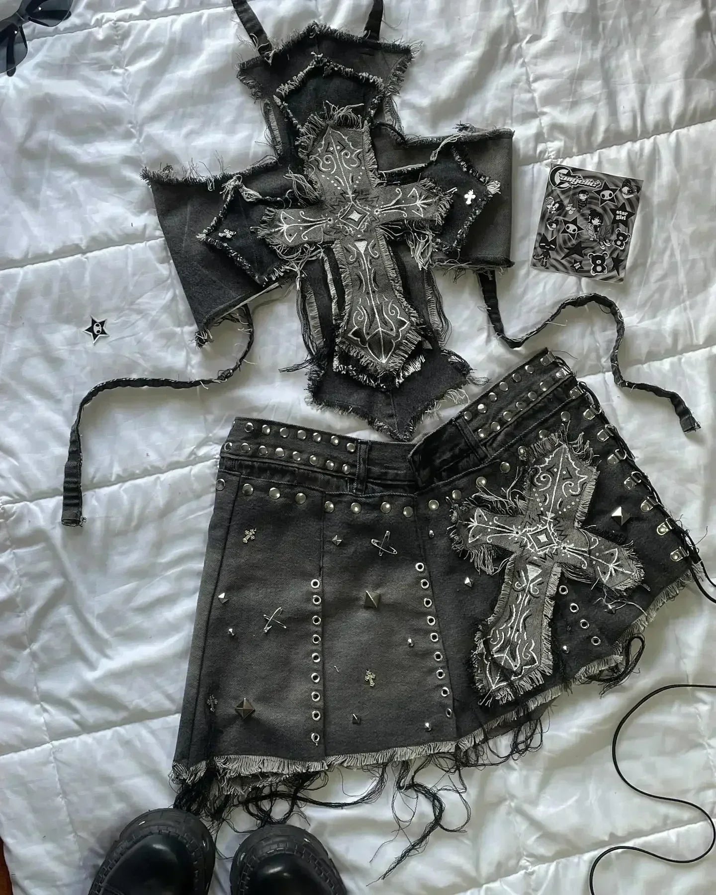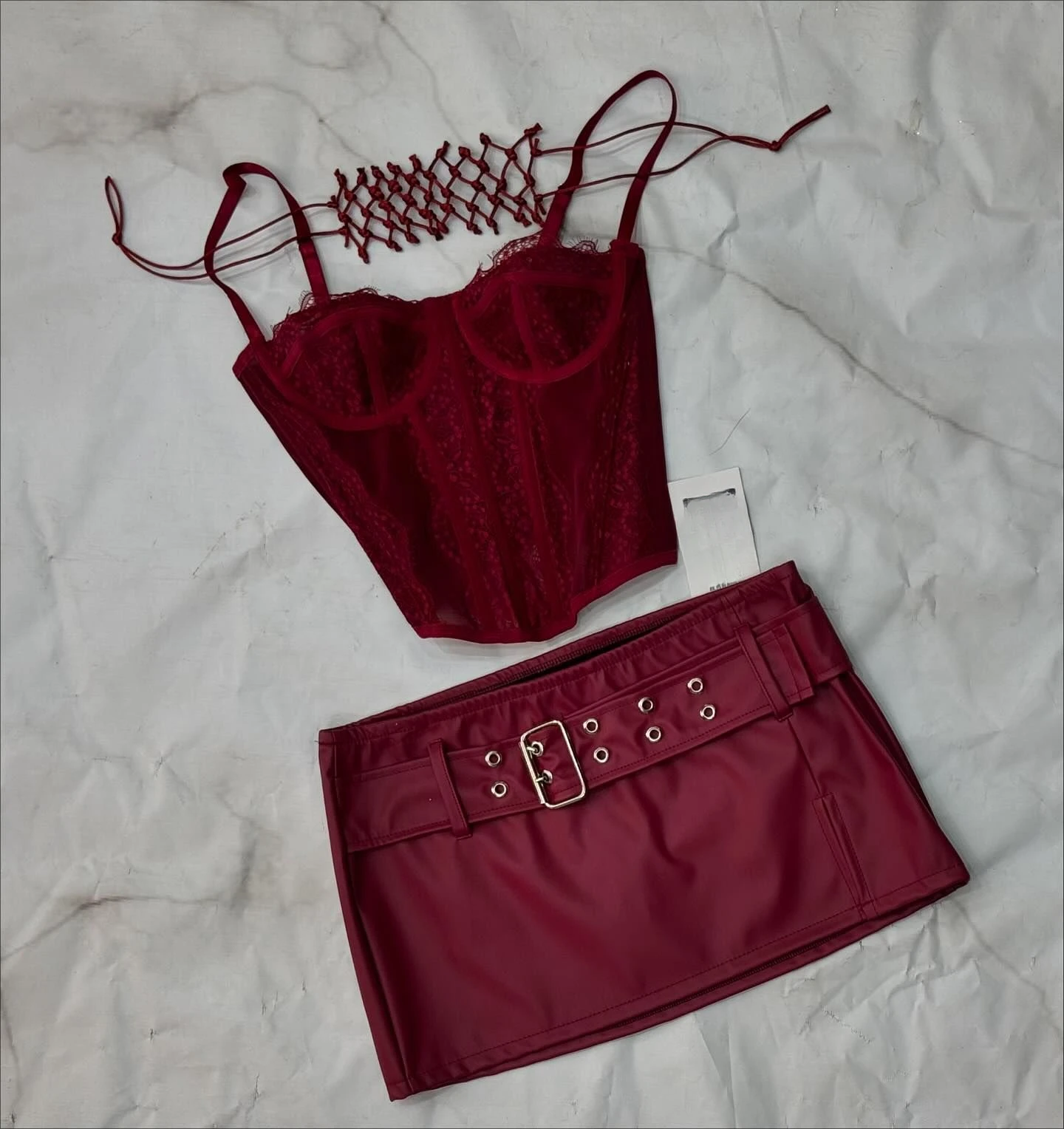 MQTIME - Y2K Suspender Leather Short Skirt Two Piece Set Feminine Lace Personalized Design Punk Motorcycle Style Mini Leather Skirt Suit