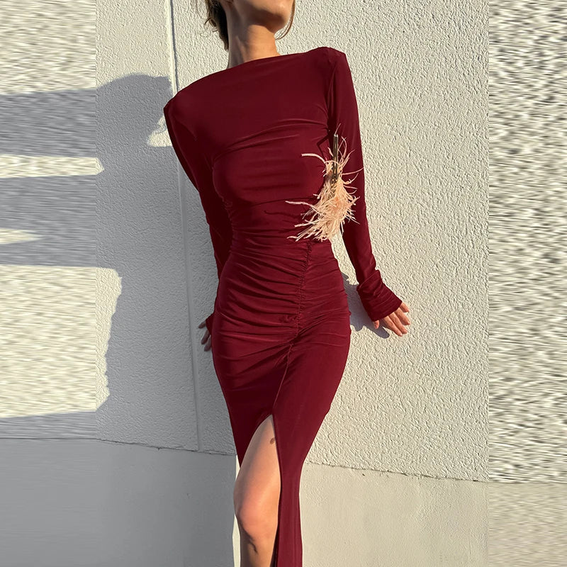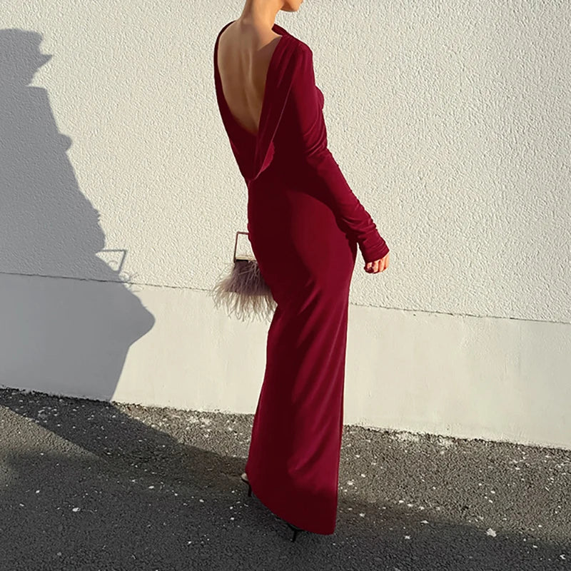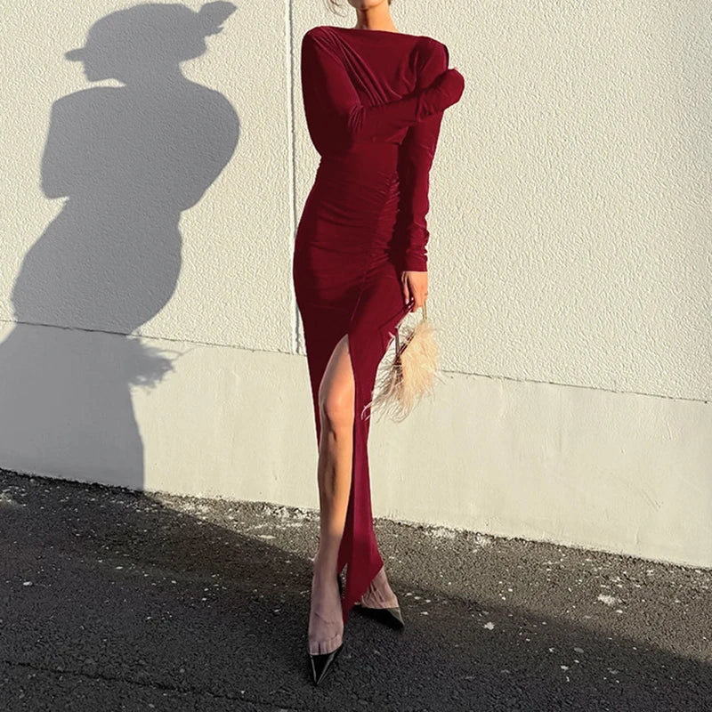 MQTIME - Sexy Backless Solid Slim Banquet Dress Lady Elegant Long Sleeve Split Evening Dress Autumn New Pleated O-neck Party Maxi Dresses