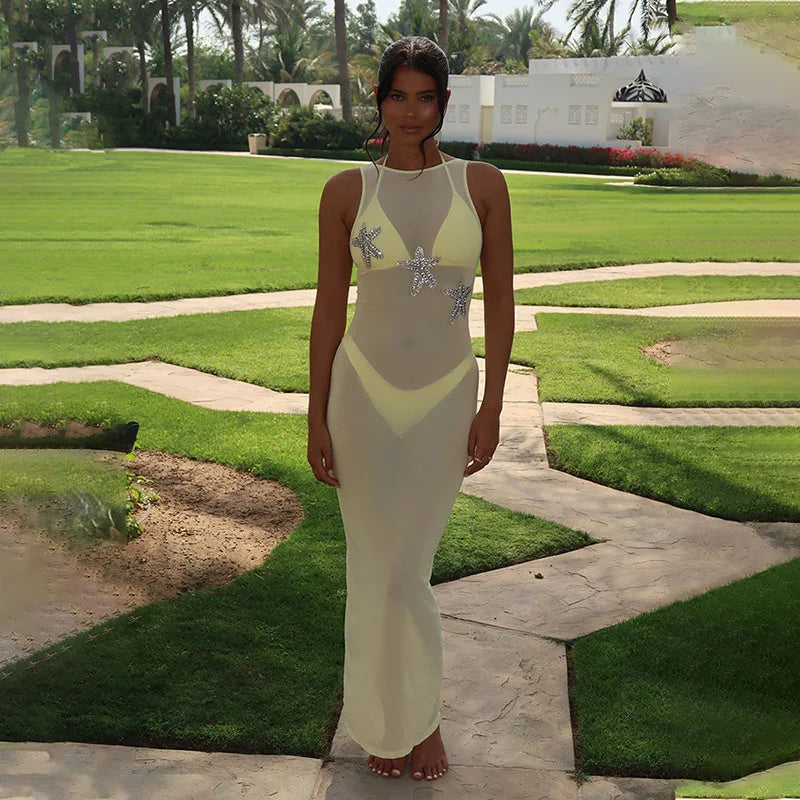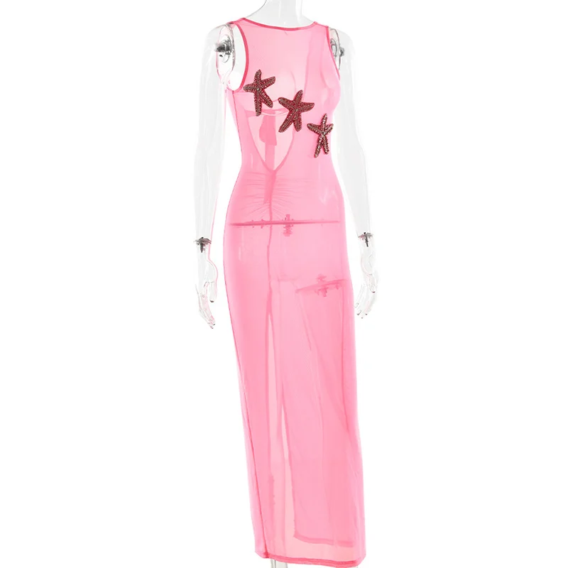 MQTIME - 3d Starfish See Through Beach Long Dress Women Slim O-neck Sleeveless Backless Lace Up Dresses 2025 Summer Mesh Holiday Robes