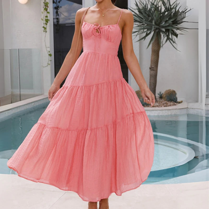 MQTIME - Beach Dress Solid Color Strapless A-line Maxi Dress Spliced Vacation Long Layered Dress Mujer Vestidos Boho Sundress