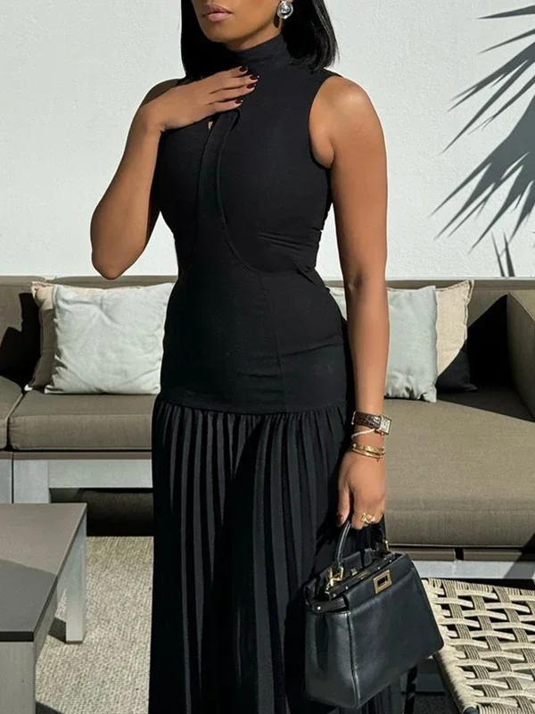 MQTIME  -  Black Dress For Women Summer Sleeveless Fashion Split-Joint High Neck Pleated Bodycon Party Evening Maxi Dresses
