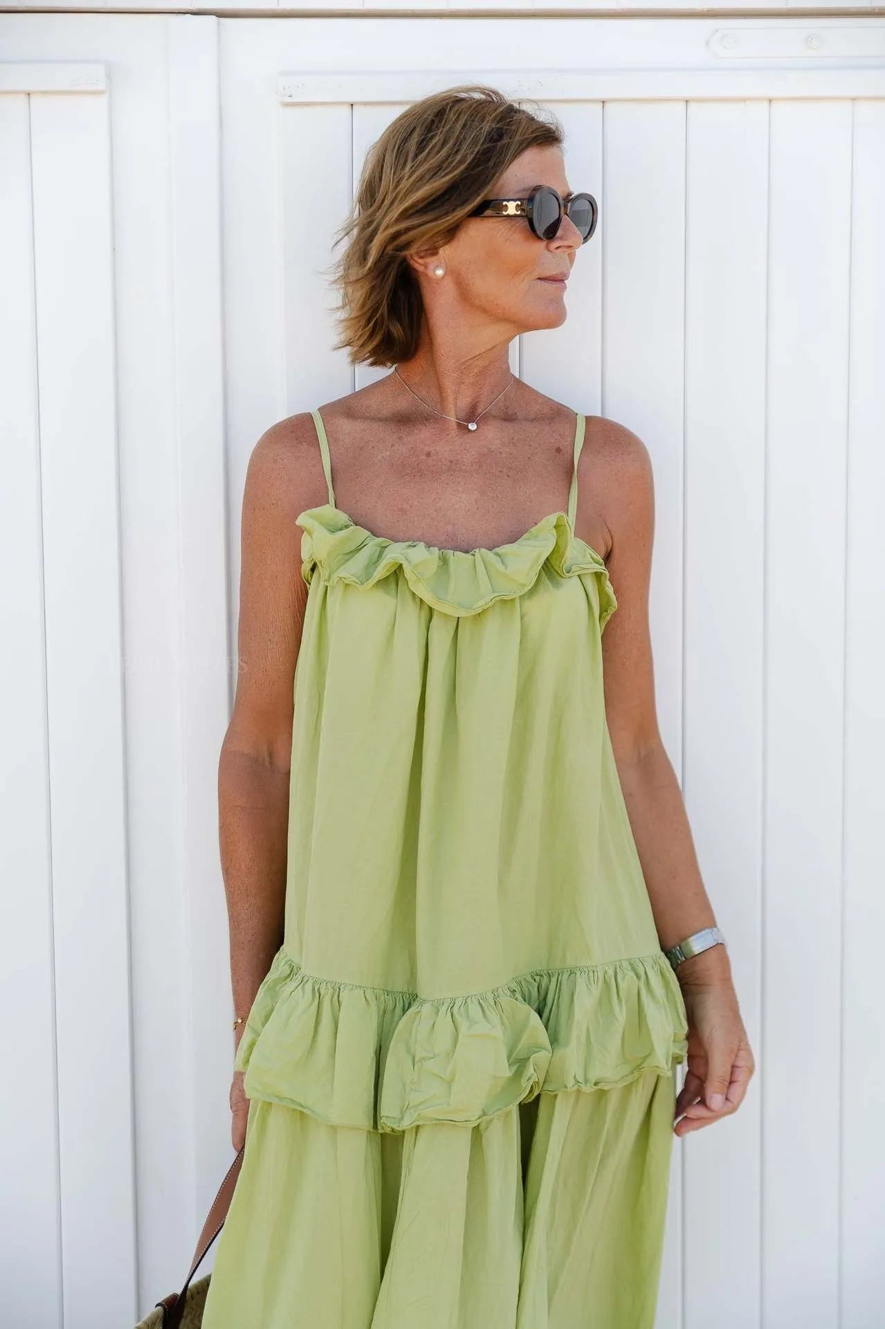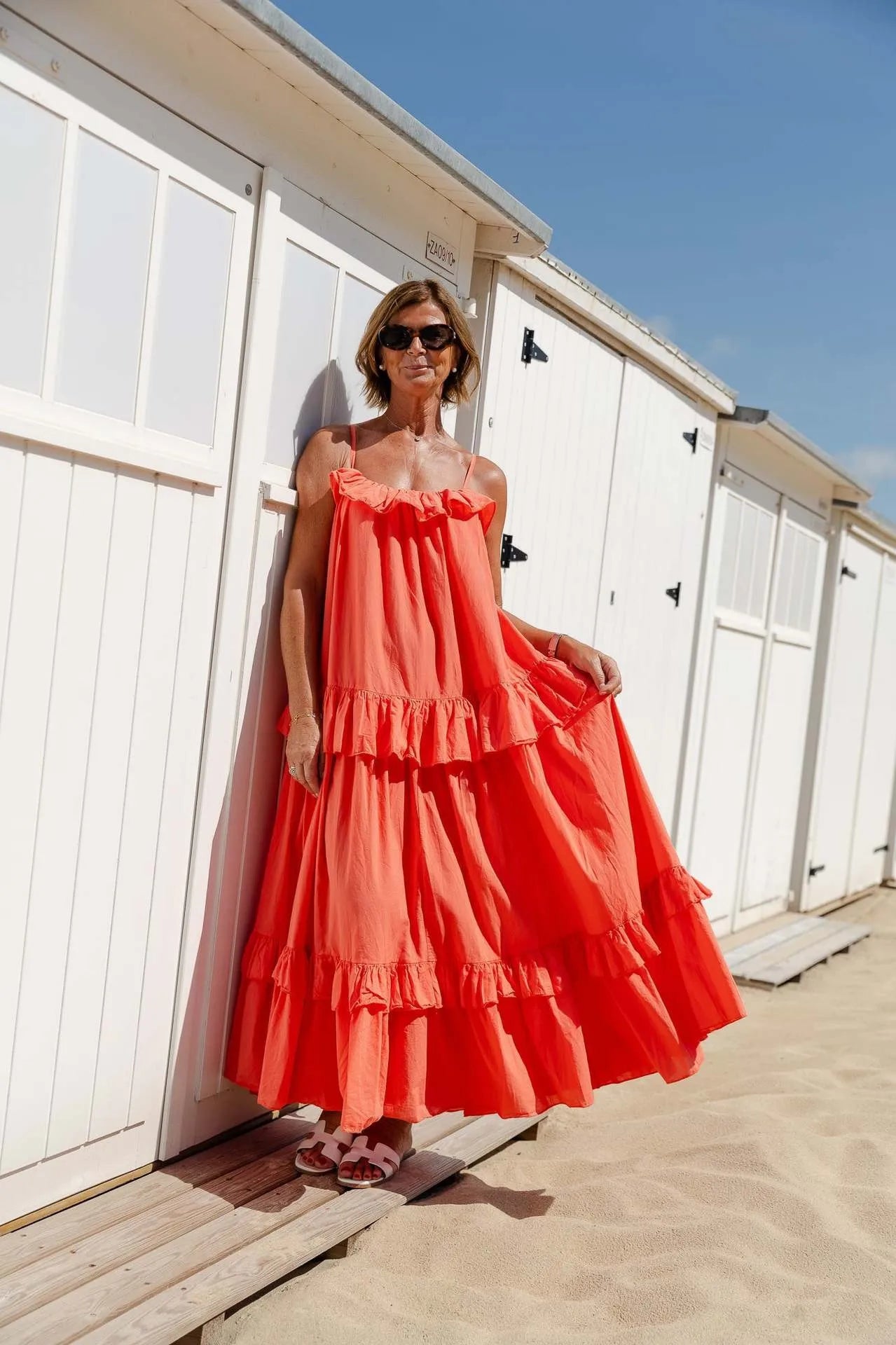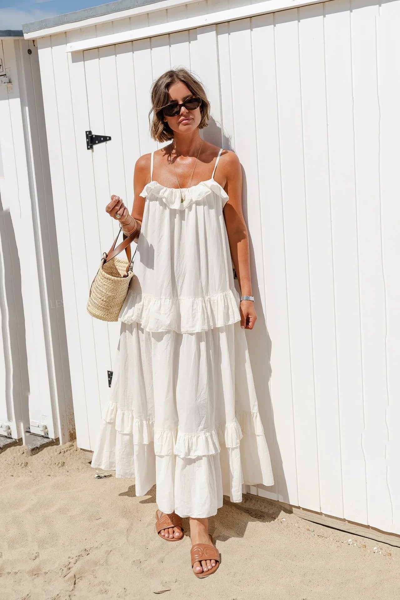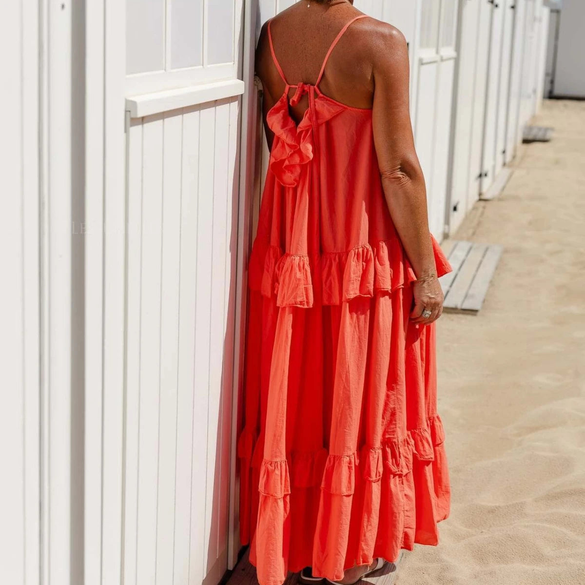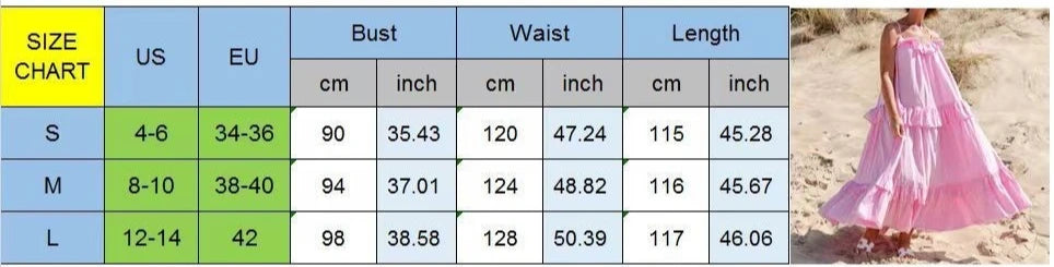 MQTIME - Boho Beach Dress Strapless Solid Color Cotton Maxi Dress Loose Fit Ruffled Candy Color Sundress Vacation Vestidos