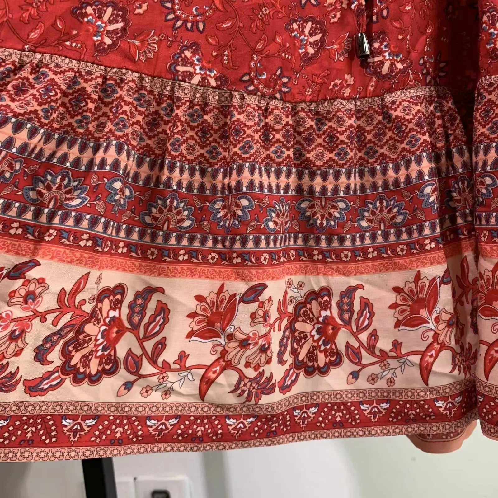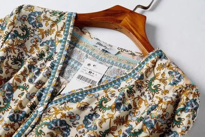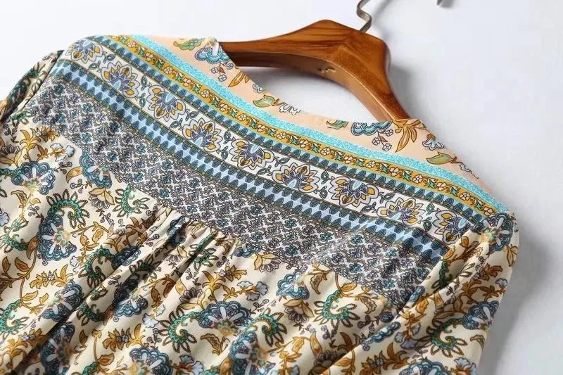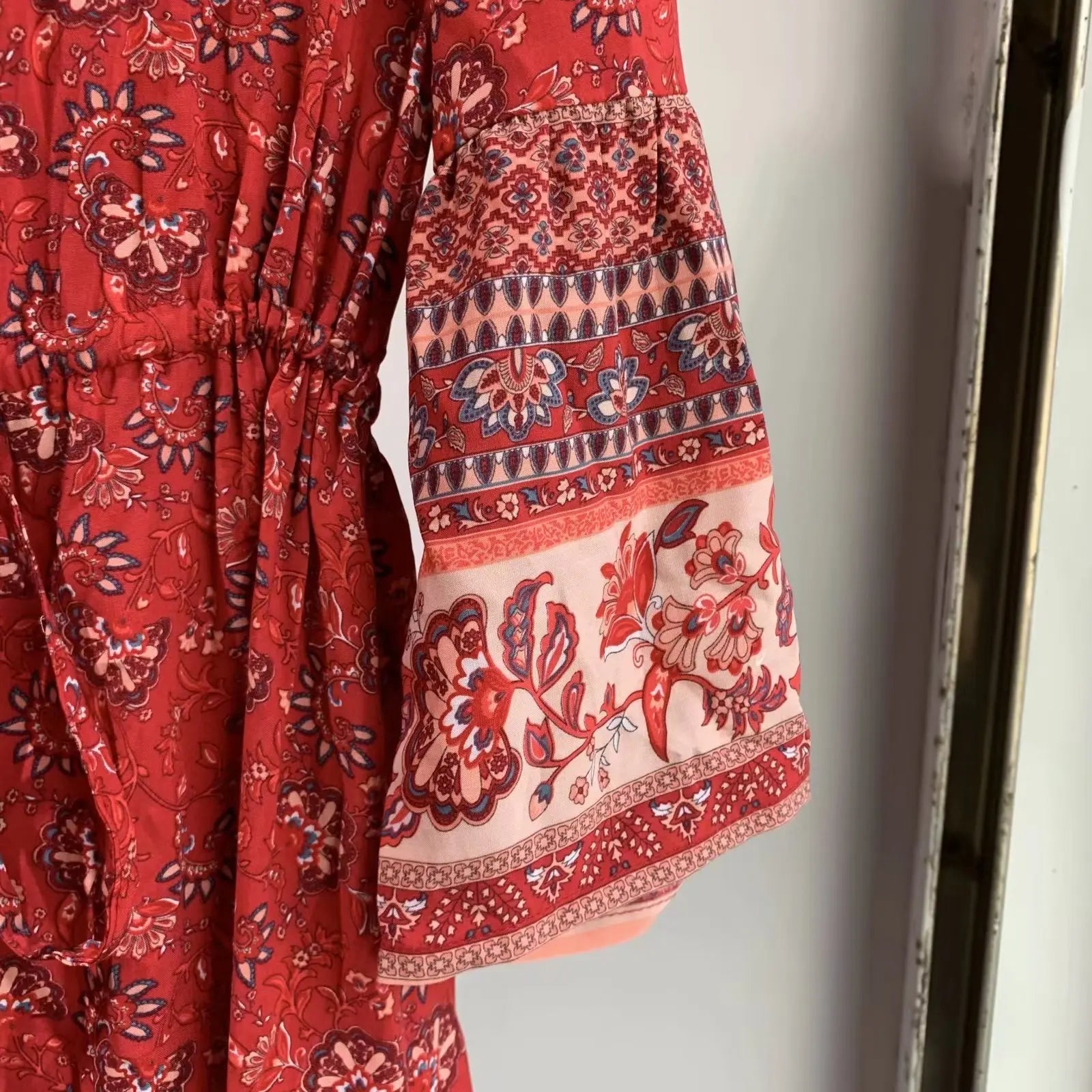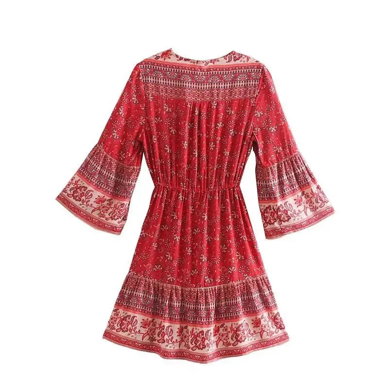 MQTIME - Boho Long-sleeved Dress V Neck Rayon Summer Short Dress Femme Hippie Printing Mini Dress Flare Sleeve Chic Vestidos