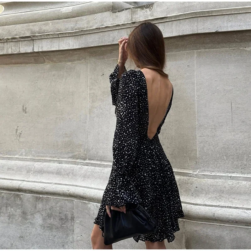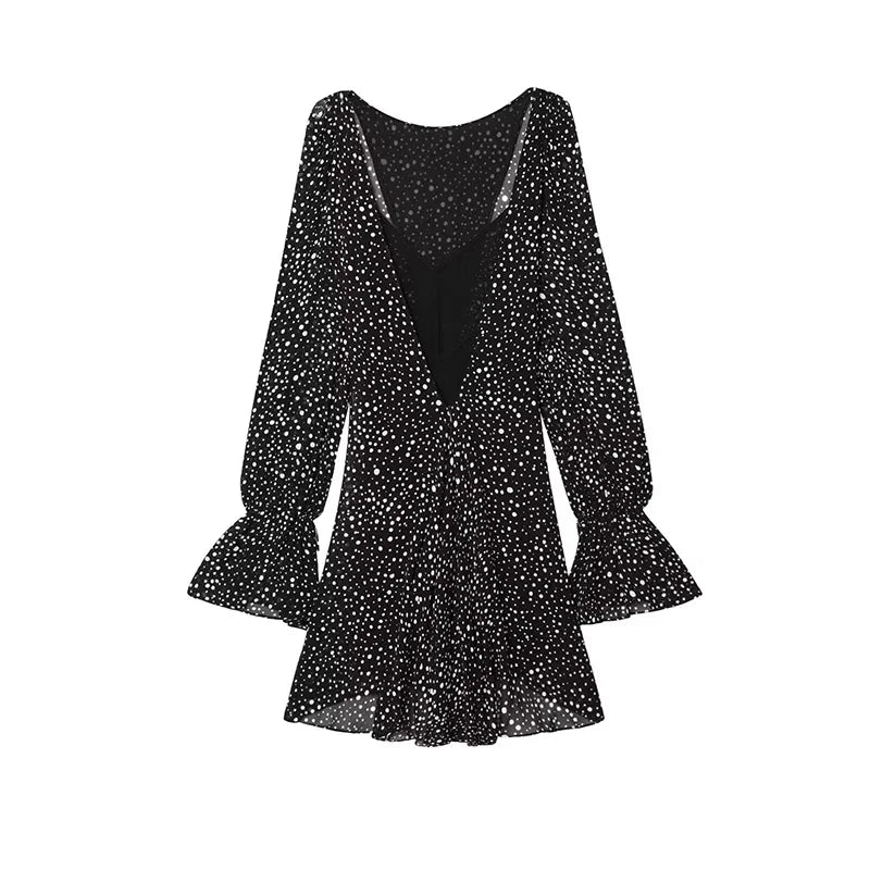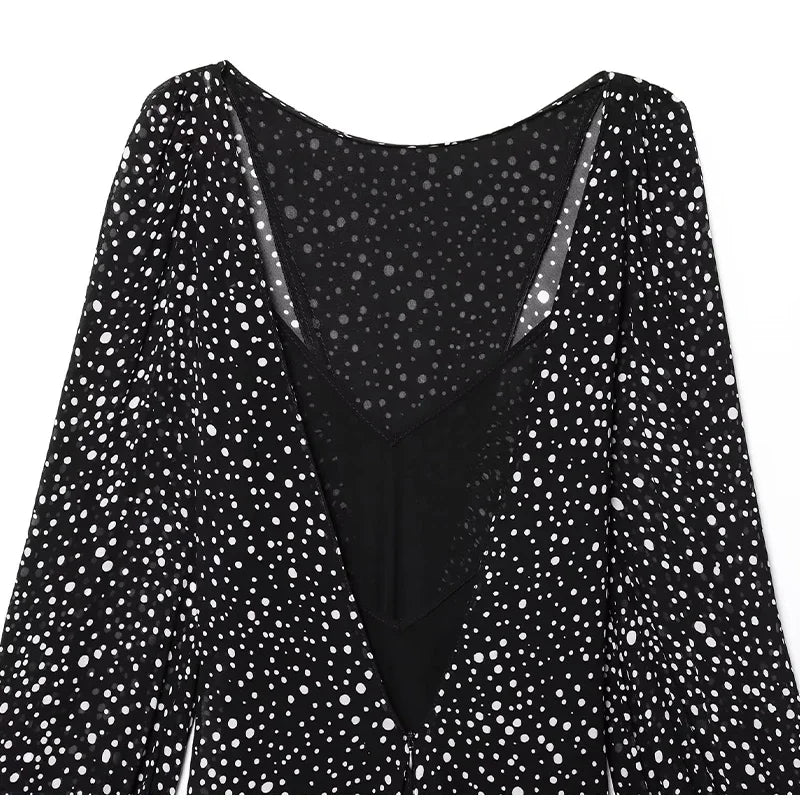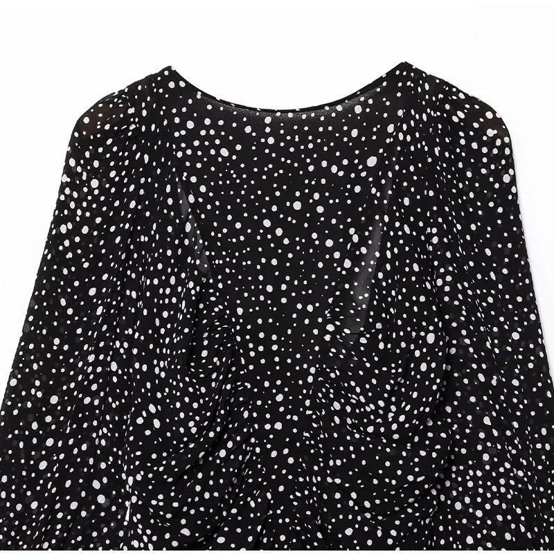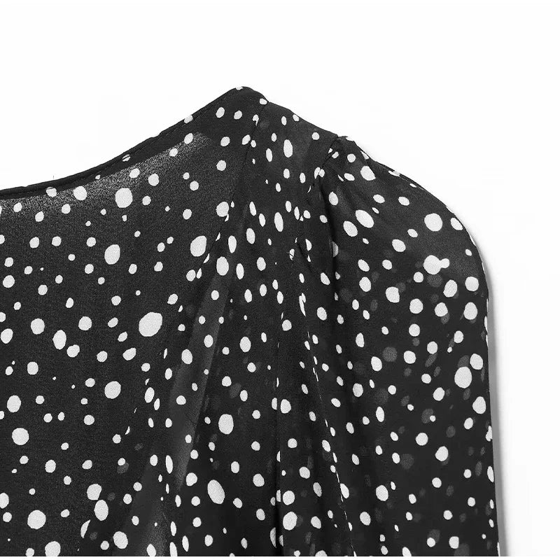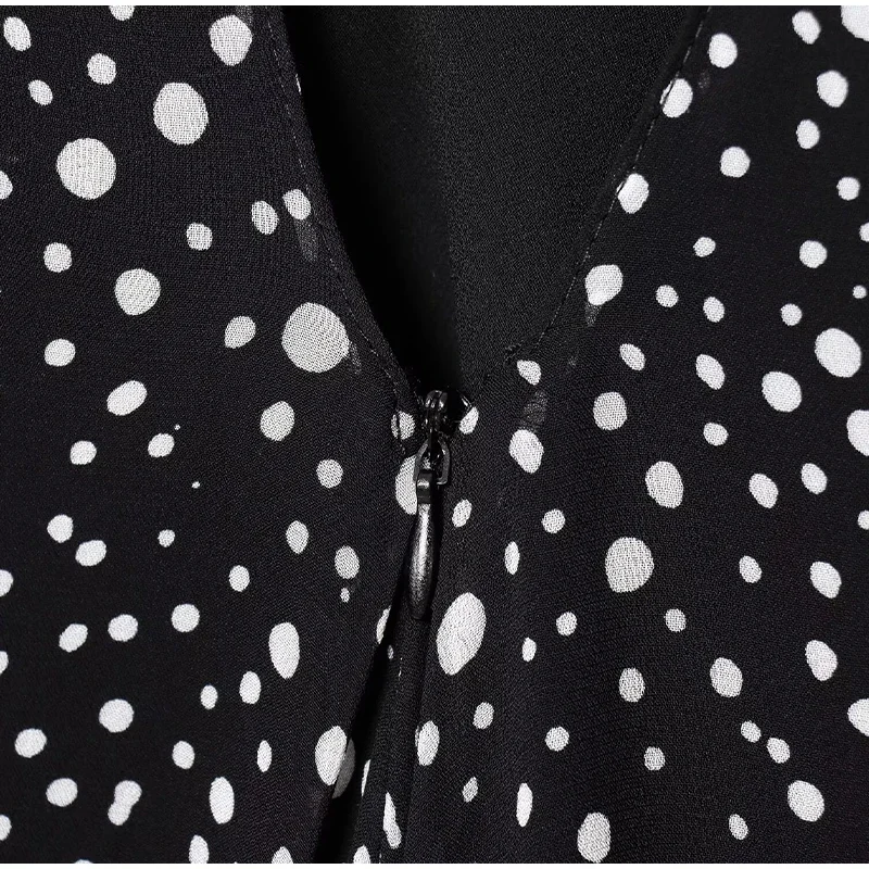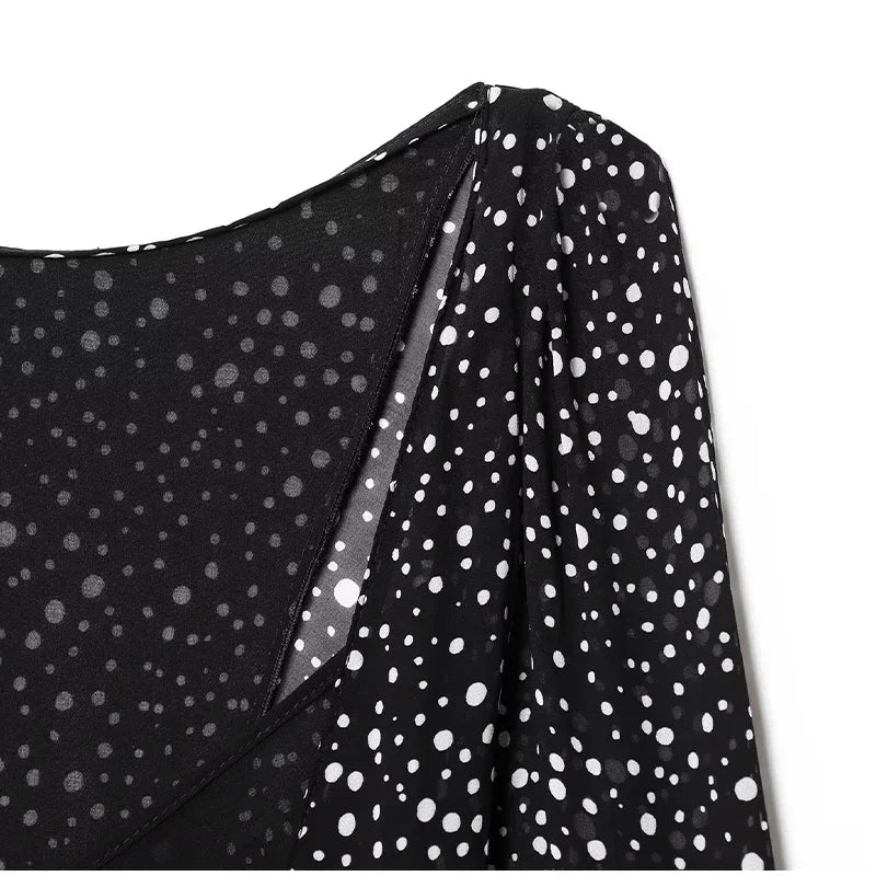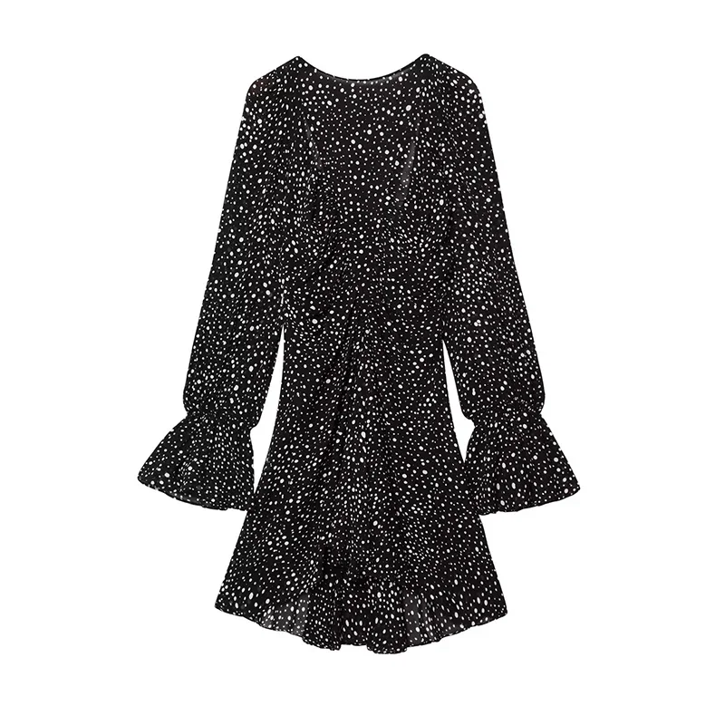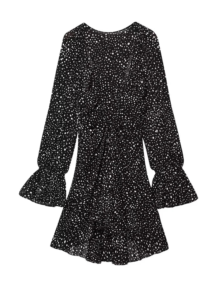 MQTIME - Casual Black Polka Dot Printed Mini Vestido Women Round Neck Long Sleeve Pleated A-line High Waist Dresses Lady Street Wear
